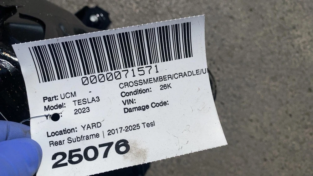 Donut Auto Dismantling Donut Auto Dismantling Rancho Cordova, CA Business Hours (PST/PDT) Mon - Fri 8am - 5pm Closed Sat & Sun Crossmember/cradle/undercarria Year: 23 Model: TESLA MODEL 3 Side: Type: Used Category: ND Condition: 26k Vehicle Stock #: 25076 Part Stock #: 0000071571 Additional notes: Rear Subframe | 2017-2025 Tesla Model 3 Rear Subframe Cradle Crossmember W/ Stabilizer Bar Interchange: Also fits: Search for more parts from this donor vehicle Search for more parts for TESLA MODEL 3 Dear Valued Customers Before ordering, please verify the part number and compare the physical details of your part with the photos in our listing. Tesla sometimes changes parts within the same model year, so even if the year matches, variations may exist. Examine all photos and read the description. Please contact us and ask any questions you have about the item. What you see in the pictures is what you will receive. Item are sold as Pictured in our ads, All the damages are marked in pictures with colored markings ........ indicated scratches, O indicate dents/dings view all photos and description. All Parts come with a 60-Day warranty Compatibility We are not responsible for compatibility, please order parts with the same part number to avoid delays and fitment issues in your purchase. Always verify O.E.M part numbers check fitment. Shipping & Return Policy For LTL and freight shipments: Please inspect an item before signing. For LTL and freight shipments of large items like Battery Packs, Seats, Doors, Trunks, Hoods, and other sizable body parts, a commercial address is mandatory . This must be a business equipped with a dock or forklift. Please note that deliveries cannot be made to restaurants, office buildings, or hotels. Please allow 5-11 business days from the shipping date to receive freight items. If a forklift is not available to unload your package, please ensure that you added liftgate service fee to your order. Residential deliveries have an extra charge required by LTL to cover liftgate usage and city ordinance. Be advised not all LTL freight companies offer lift gate services in every town especially in rural areas. If you do not have a commercial address or a proper residential address reach out to us to work things out LTL items can always be held at your local hub and made available for pickup. We offer free local pickup Monday through Friday, from 8:00 AM to 5:00 PM. What separates us from our competitors As Pioneers in the Tesla used parts market Donut Auto Parts is leading in the industry. We have been specializing in Tesla's for over 5 years. Our Staff are highly trained and experienced Tesla specialists. We strive to help you solve all your part needs. Local Customers For our local customers we provide installation on battery packs and drive units purchase. Drive unit and battery pack installations come with a 60 day warranty . All parts are fully tested. Using the industries leading tools, we also provide installation of other parts. Please reach out to us directly for more information. Be Advised Programming may be required for most electronic components. Donut Auto Parts is not responsible for any labor costs and other charges such as programming. NO RESTOCKING FEE Payment Payment must be submitted within 48 hours after purchase time. We have a Same handling time when paid by 2pm pst and 3-day handling time for LTL freight items. Feedback and Rating We always Strive to earn positive feedback. If you encounter an issue with one of our items, please contact us before leaving any feedback or opening a case give us the opportunity to solve your order issue. We strive to provide excellent customer service to ensure that everyone is satisfied, and to gain happy and returning customers! ALLOW US TO RESOLVE ISSUES BEFORE LEAVING YOUR FEEDBACK PLEASE CONTACT US FIRST Airbag Notification If the item above is an airbag, I certify this airbag is not subject to recall and will be shipped in accordance with hazmat shipping requirements . Powered by Checkmate