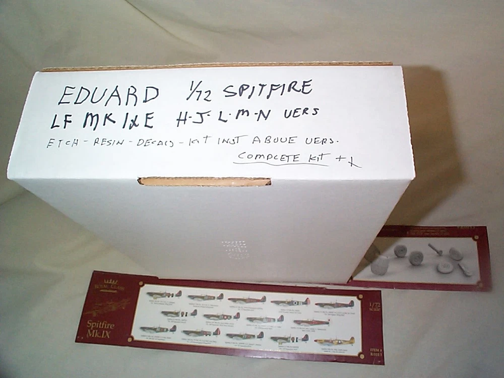 1/72-Edward-Spitfire-LF MK1XE-Version H-J-L-M-N - Kit # ROO13-H-J-L-M-N- 2016- This is a re-box of the Royal Class Kit- this version is the H-J-L-M-N-[no I version] - includes the complete kit- photo-etch-canopy masks-decals for the versions-I sorted and bagged the kit- you get copies of the instruction sheet that pertains to this version all markings and variations shown- you do not get the color profiles as they are B&W copies- the color box ends shown are also not included nor is the beer glass as shown that was sold in a separate listing. You get everything you need and then some to build this Spitfire Version.