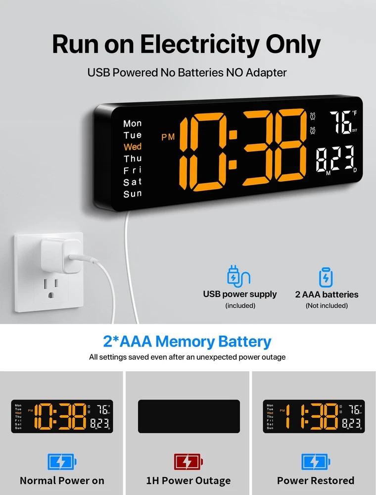 Large 17.3-Inch LED Display: Width: 15.28 inches. Height: 5.21 inches. this clock displays the time, date, day of the week, and temperature in large, bold digits. The 3.92-inch digital display is designed for easy readability from any angle and distance, making it perfect for seniors or those with visual impairments RGB Modern Night Light: Personalize your ambiance with the included bottom night light, offering 8 fixed colors and 1 multi-color option. Create a cozy atmosphere in your living room or utilize it as a night light in your bedroom, reducing the need for bright lights during late-night activities Remote-Controlled Clock: Effortlessly manage your wall clock with a remote control, operating within a 32 feet range. Featuring a simple interface, this clock is perfect for seniors or individuals with limited mobility, offering convenient access to essential clock functions. Automatic Daylight Saving Time and Auto/Manual Brightness: Seamlessly adjust to daylight saving time with a long press of the "-" button. Choose from 10 brightness levels using the remote control for personalized comfort, while the built-in automatic dimming sensor intelligently adapts to ambient lighting changes Have to Plug-in: It's NOT battery operated. It must work with 5V/2A power adapter and 11.5 feet cable cord (included). While 2 AAA batteries (not included) maintain memory function during power outages, Note: The clock requires a power cord to function and cannot run on battery power alone