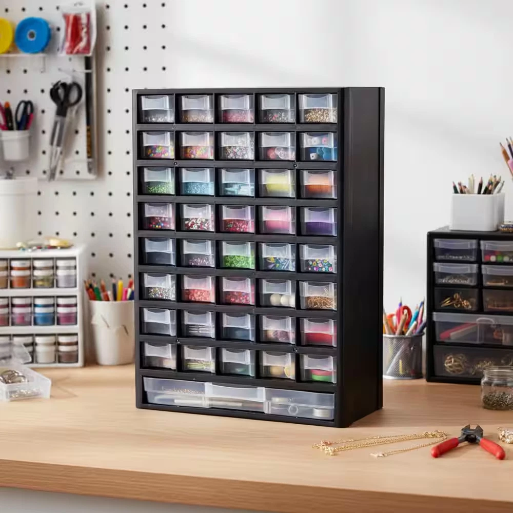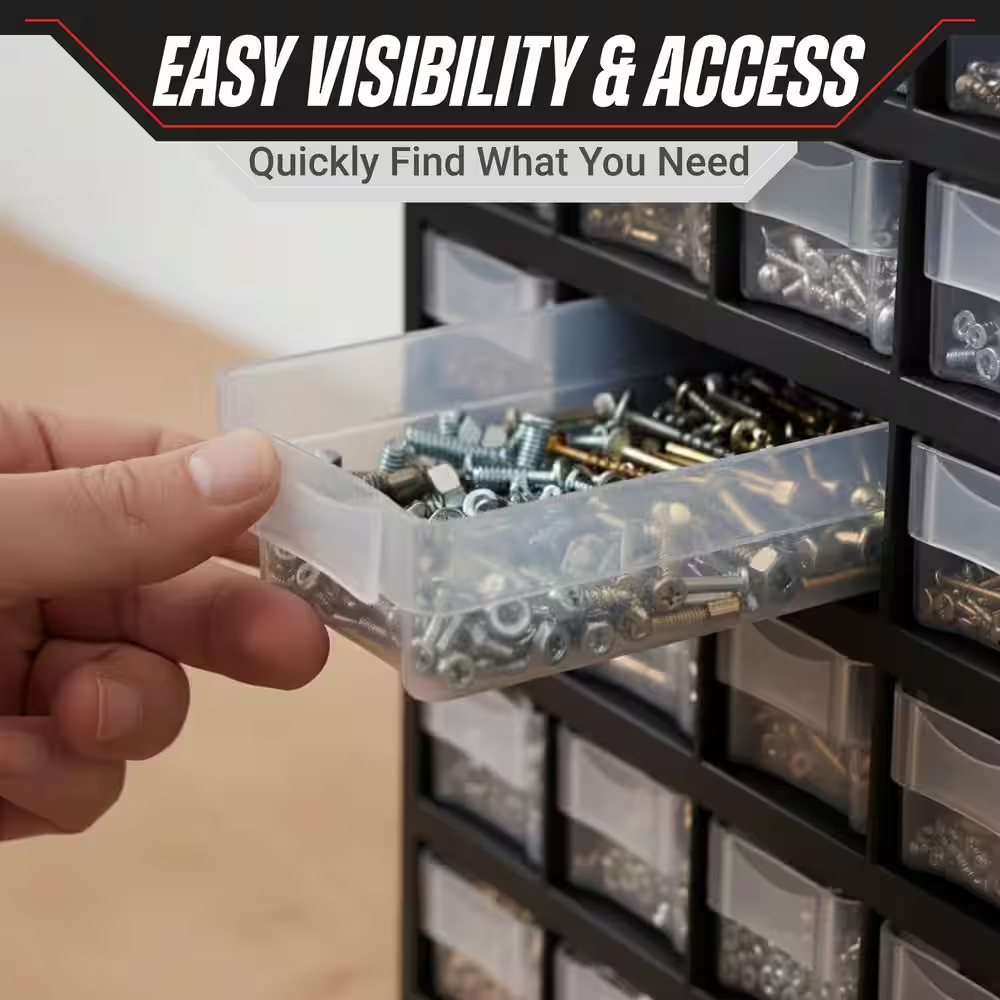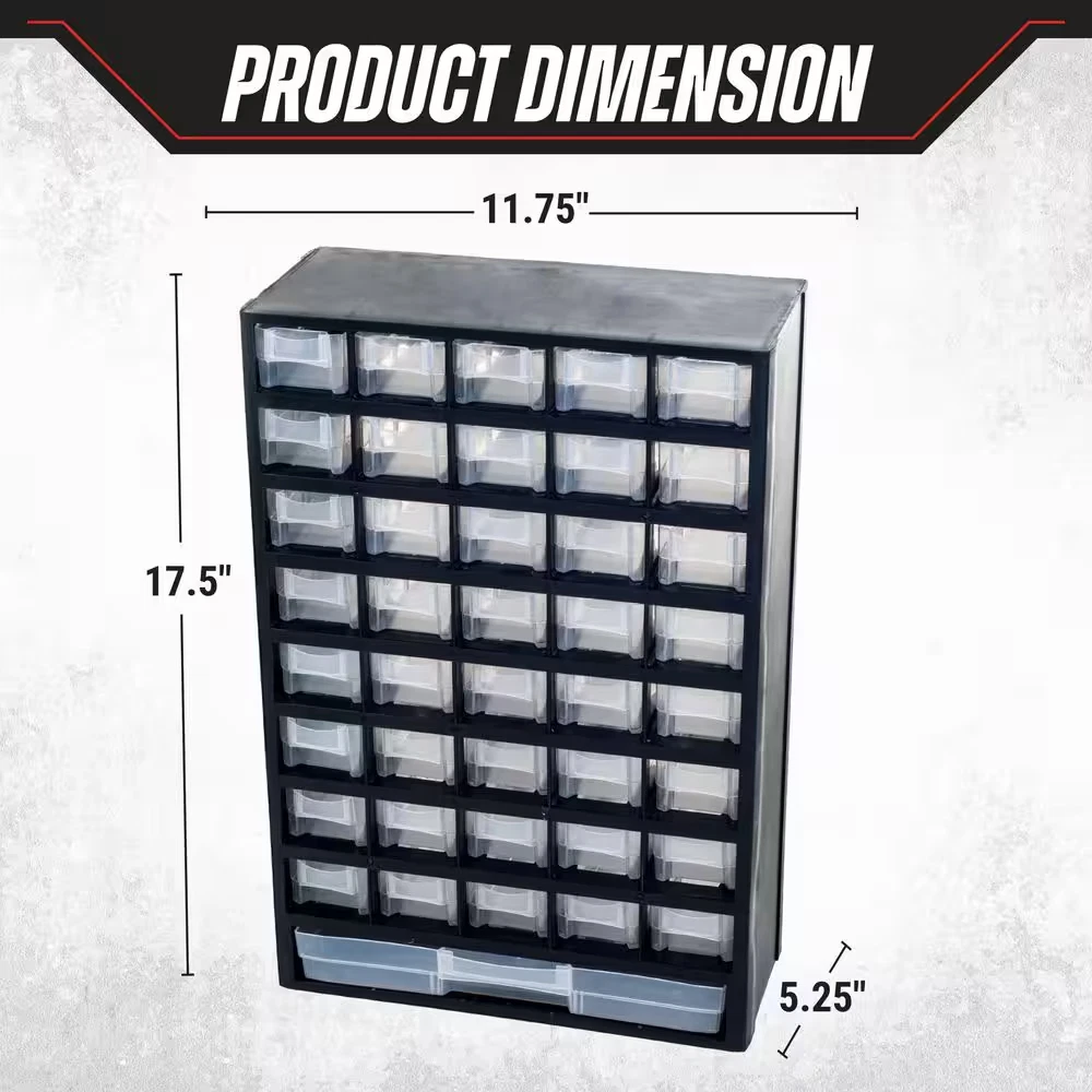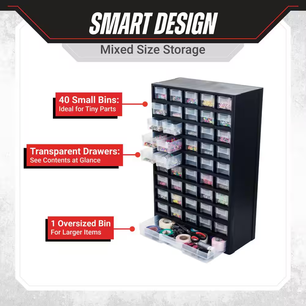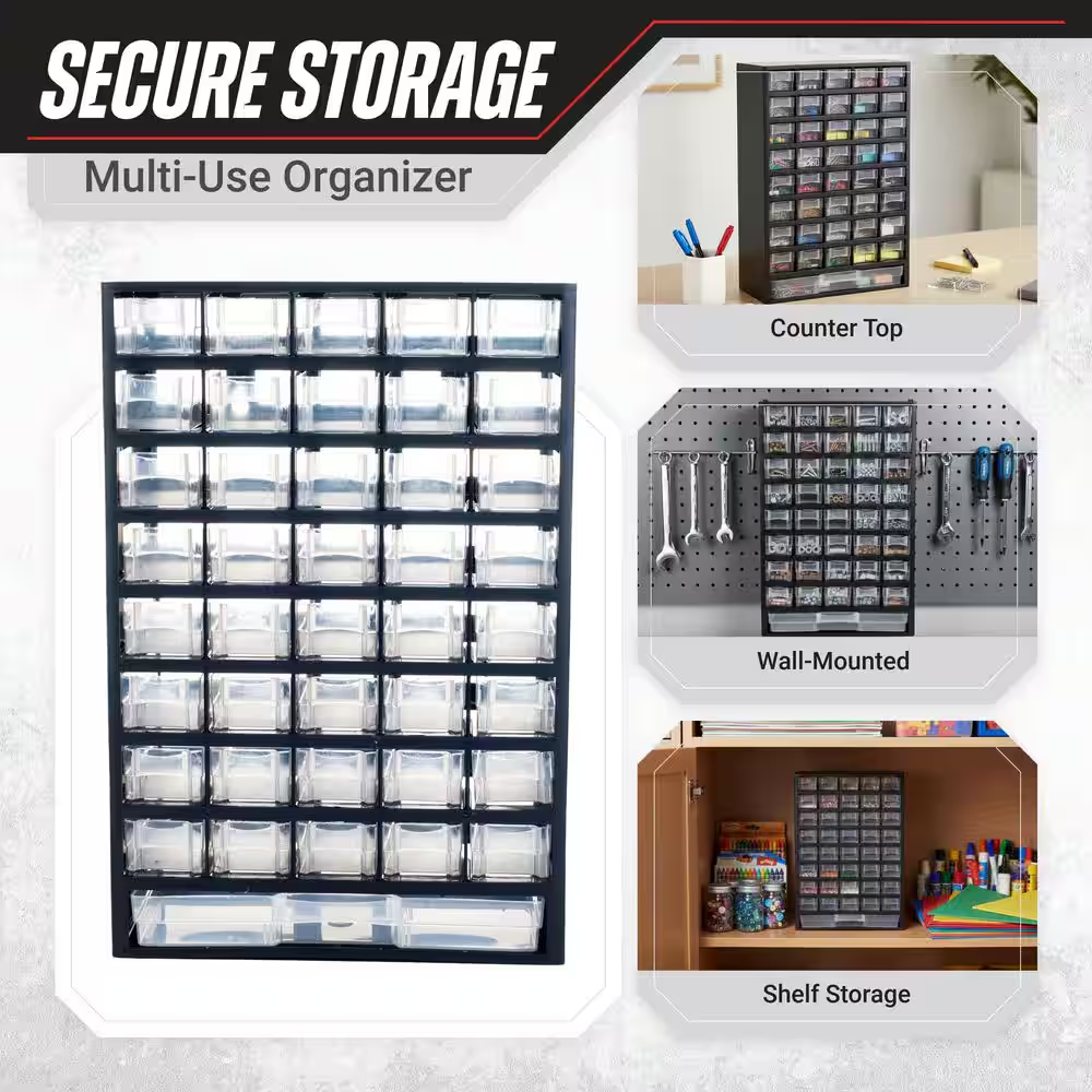 Fast Shipping On All Items 30 Days Money Guarantee Customer Support Excellent Service 100% Satisfaction Satisfaction Guaranteed 17.5 In. 41-Compartment Hardware Storage Small Parts Organizer in Black Specification Color Family Black Color/Finish Black Features No Additional Features Material Plastic Pack Size 1 Racks and Bins Product Type Tool Storage Bin Returnable 90-Day Tool Storage Product Type Shelf Bin Manufacturer Warranty 30 days Product Depth (in) 5.25 in Product Height (in) 17.5 in Product Width (in) 11.75 in 11.75 inches x 5.25 inches x 17.5 inches. Item Description Store everything from hardware to crafting supplies or toys Clear bins allow you to see the contents easily Constructed from durable, impact-resistant plastic The Small Parts Organizer by Stalwart is an excellent organizational solution for your garage, home, playroom, or office. The screw organizer offers 40 small compartments and one oversized compartment to allow you to easily store anything from parts, hardware, office supplies, fishing tackle, to crafting materials, beads, makeup, jewelry, and more. Stalwart, for storage solutions that are SMART, STRONG, and SECURE. About us We offer the best prices around on high quality products. Our E-store includes media such as books, movies, music and games while offering electronics, toys, sporting apparel, clothing, tools, general home, garden items and more. Shipping We are always working hard to ensure your package arrives as soon as possible. Please understand that some factors like weather, high postal traffic, and the performance of shipping companies are outside of our control. We offer free shipping to the lower 48 states and ship within 2-3 business days of payment, usually sooner. We do not accept P.O. Boxes. Please provide a physical address. For shipping outside of the continental USA, we only use eBay's Global Shipping Program.The item is shipped to KY and then sent to the rest of the world. International customers are responsible for all duties and taxes. Continue to check out to calculate costs for shipping the item to your country. Messages regarding eBay's Global Shipping Program MUST be directed at eBay EXCLUSIVELY. Returns We offer a 30-Day Return Policy on items in which you are not completely satisfied with. You have the option of a full-refund or an exchange of the item. No returns are available on items shipped outside of the USA Satisfaction We try over very best to make sure every customer is completely satisfied. If there's a problem, message us! We're happy to help. Payment Options Shop With Confidence