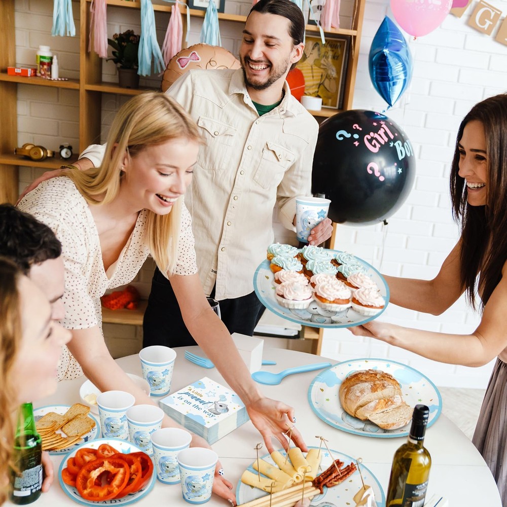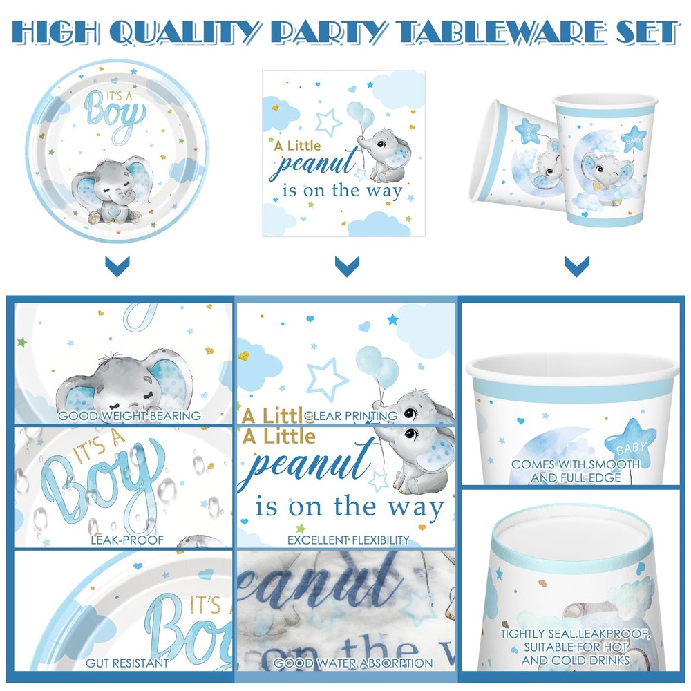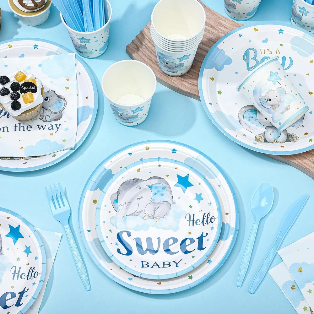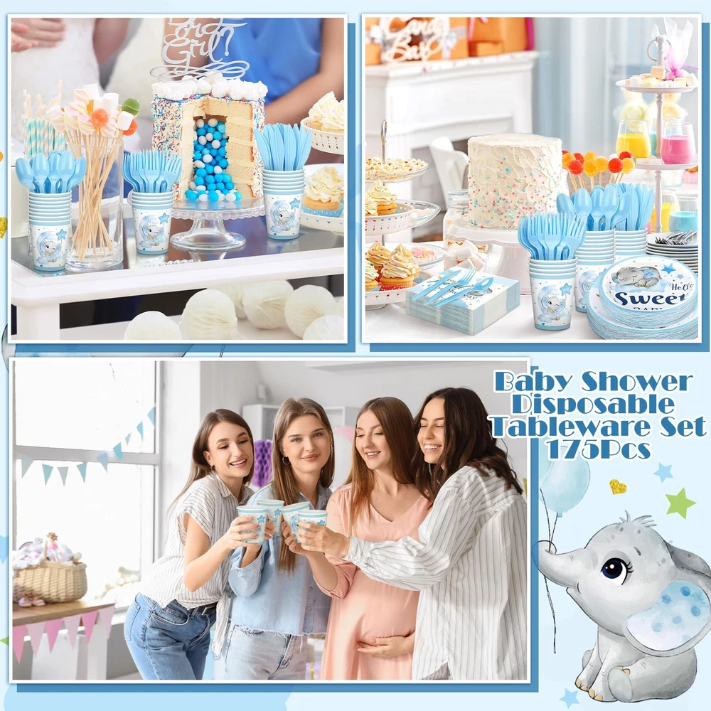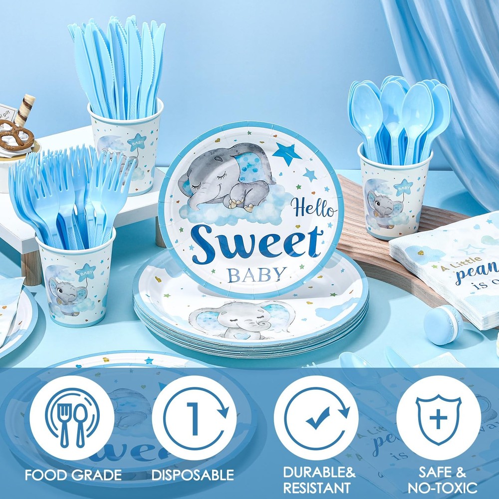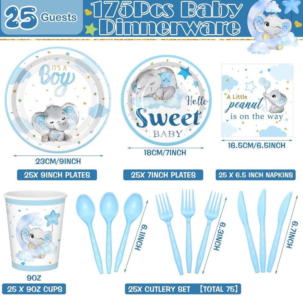 Features: No need to worry about running short of plates in your baby shower. Our package includes 25 sets of baby shower plates, ample to cater to a moderate gathering. You don't have to keep washing dishes, there's plenty to serve all your guests. Specifications: Material: plastic Color: blue Size: Paper plates: 9 inches/ 22.9 cm and 7 inches/ 17.8 cm Paper napkin: 6.5 inches/ 16.5 cm Paper cup: 9 oz Style: blue elephant Package includes: 25 x Baby shower plates set Notes: Manual measurement, please allow slight errors on size. The color may exist a slight difference due to different screen displays. Abundant Quantity for Baby Shower: blue elephant themed baby shower are 25 sets of blue elephant theme baby shower decorations, including 25 pcs 9 inches paper plates, 25 pcs 7 inches paper plates, 25 paper napkins, 25 paper cups, 25 plastic knives, 25 plastic forks, and 25 plastic spoons; With so many pieces, you can accommodate the needs of your guests and ensure a memorable baby shower experience Blue Elephant Design: these baby shower paper plates are designed with vibrant blue elephant styles, adorned with stars, and clouds, vivid and delicate, which can make your party full of festive atmosphere and warm, leaving your guests deep impressions Reliable and Disposable: baby shower plates and cups and napkins sets are made of quality paper and plastic materials, reliable and safe for your guests; They are disposable, so you do not have to worry about washing, giving you more time to enjoy the party with your loved ones Suitable Size: these baby shower plates have 2 sizes, measuring about 9 inches/ 22.9 cm, and about 7 inches/ 17.8 cm, the paper napkin is about 6.5 inches/ 16.5 cm, paper cup is about 9 oz, plastic knives are about 6.7 inches, plastic fork is about 6.3 inches, and the plastic spoon is about 6.1 inches, suitable sizes, making them both practical and aesthetically pleasing Applicable for Various Occasions: party decorations will fit in a variety of occasions other than baby showers, such as birthday parties, family gatherings, outdoor events, and picnics; Regardless of the occasion, the gorgeous designs and colors will create unforgettable moments