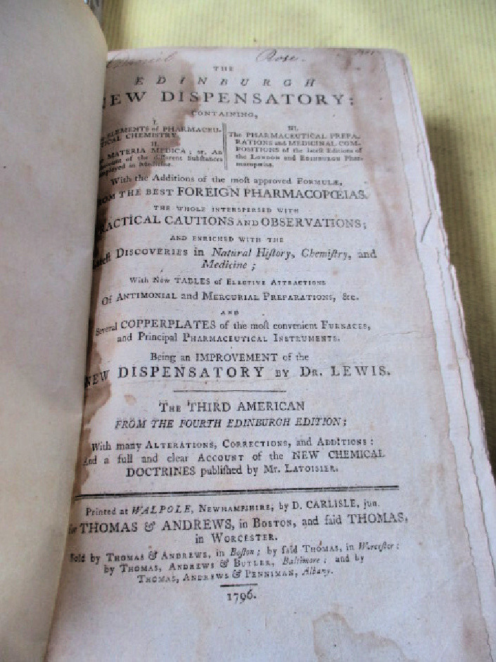 Language: English Seller Notes: “Good(minus) condition. Please see details in description.” Year Printed: 1796 Topic: Pharmaceuticals Subject: Medical Reference, Pharmacy Place of Publication: United States Binding: Leather Signed: No