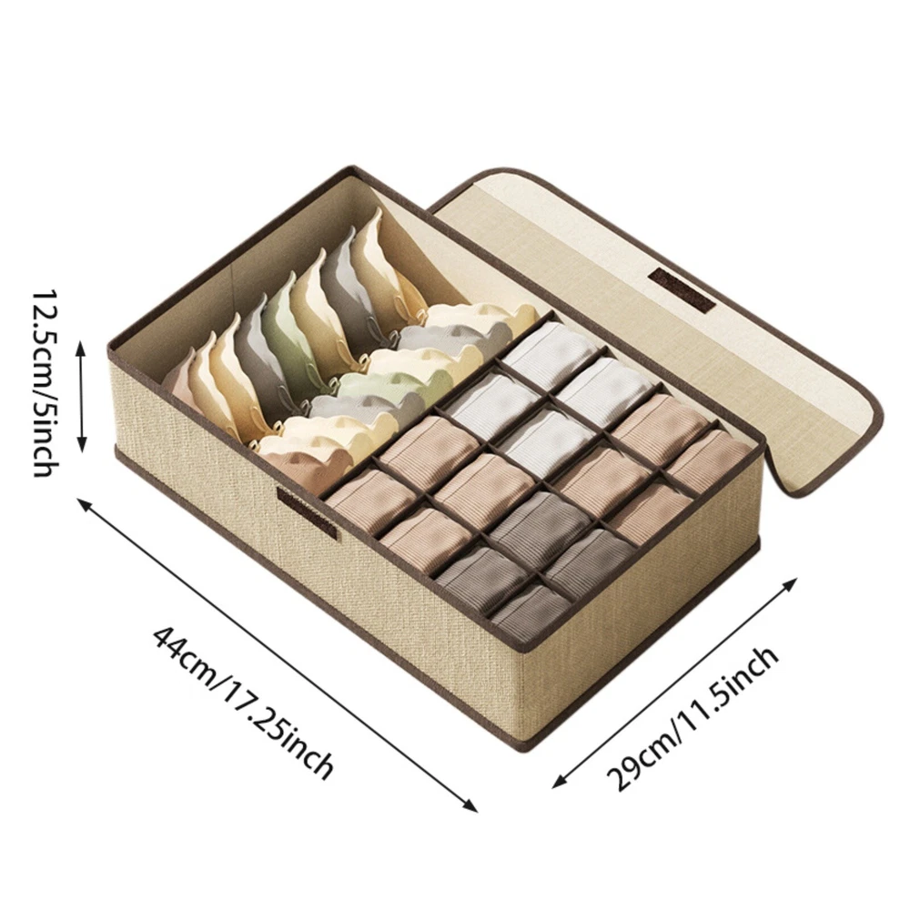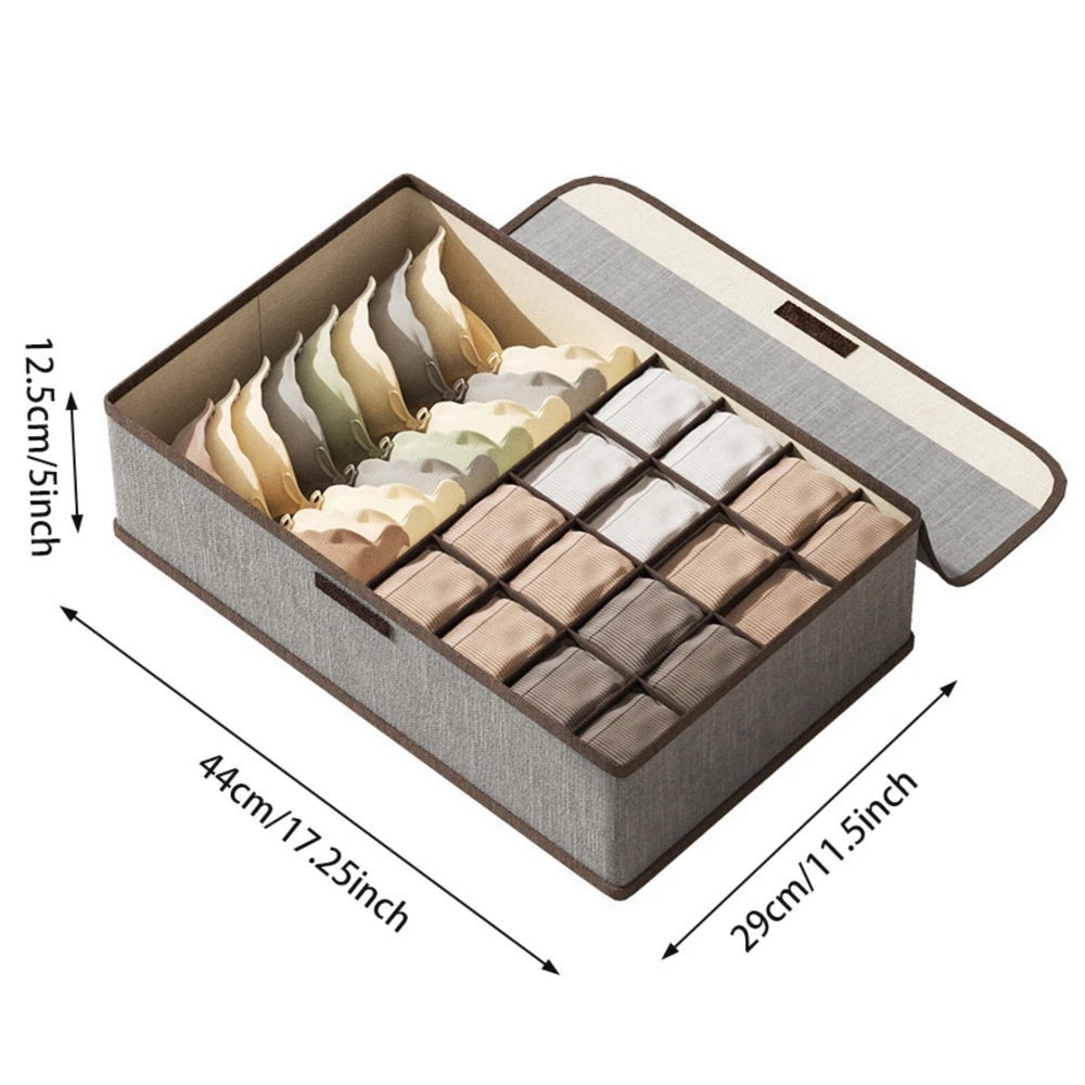Material: Cotton and linen Product size: 44 * 29 * 12.5cm Package List: 1 * Storage Box 【MULTIPURPOSE DRAWER ORGANISER】 Drawer organisers can suit for many places such as drawer, dressing table,office desk and etc. These cubes storage can store various items, including bras, socks, leggings, t-shirts, purses, wrist-lets, wallets, watches, makeup and other accessories. 【easy to use】designed with a convenient closure magic buckle lid, it can be easily opened and closed, saving time and effort. it can also be folded up to save space when not in use. 【size】the large size is 17.25" * 11.5" * 5", with 16 small compartments and 1 large compartment. Unlike clothes storage boxes without compartments and with fixed compartments, our underwear drawer organiser contains compartments in different sizes. You can put your underwear, bras and socks in one box. 【cotton and linen material】made of high-quality cotton and linen material, it has the characteristics of dustproof, moisture-proof, and wear-resistant, and is not easily deformed or broken. the breathable structure ensures air circulation and keeps clothes fresh. 【multi-functional storage box】suitable for storing socks, ties, belts, underwear, small accessories, etc., it can be placed in closets, bedrooms, shelves, bathrooms, wardrobes, drawers, under-bed storage, desks, bookshelves, nurseries, and offices.