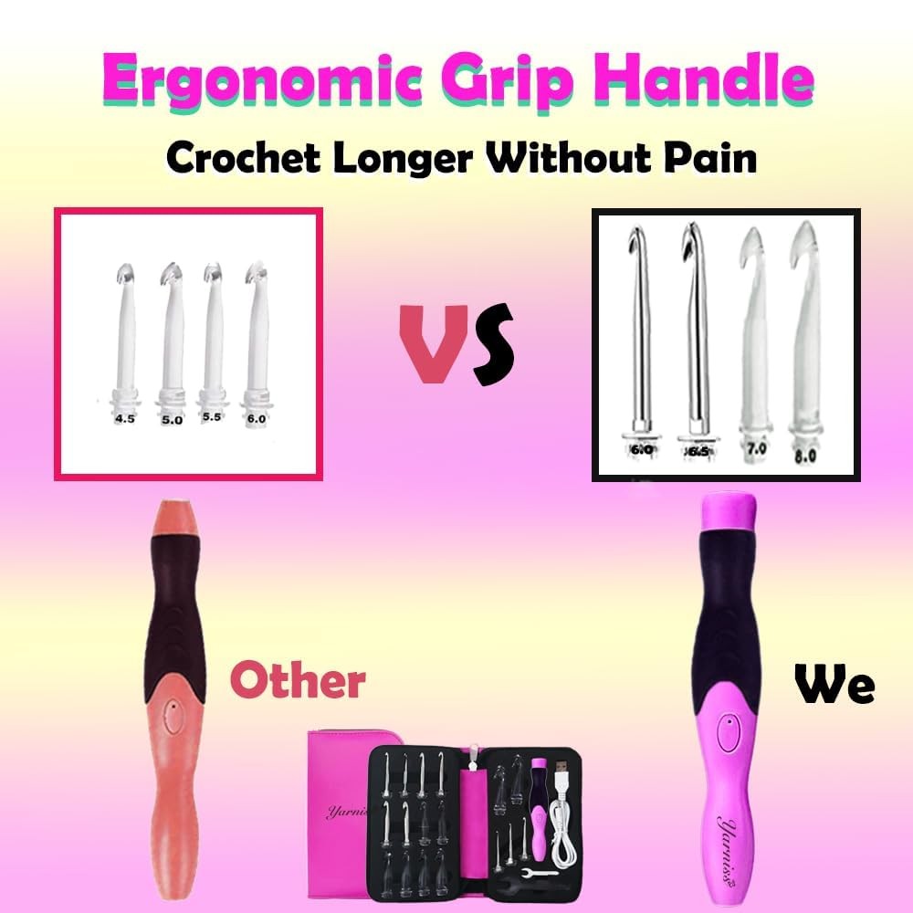 17 size Lighted Crochet Hooks Set 2.5 mm to 14.0 mm, Rechargeable Light Up crochet hooks with Case 【17 in 1 Head Lighted Crochet Hooks】The crochet hooks comes with 17 in 1 interchangeable head, you will get 9pcs metal head from 2.5 mm to 6.5 mm., and 8pcs plastic head from 7.0mm to 14.0mm. 【USB Fast Rechargeable】The glow crochet hooks equipped with USB data cable, easy to charging can be done by wall adapter, power bank or desktop/laptop computer etc. The built-in lithium battery is rechargeable and utilized repeatedly. It only takes 15 minutes to rechargeable, and then it can last for 7-8 hours. 【Longer LED Crochet Hooks】The lighted crochet set designed longer crochet shafts than previous version, the update version assemble with 1.90~2.0 inch crochet hook heads, which can make more loops when crocheting. 【Adjustable Brightness Levels】 The electrical crochet needle assemble with 2 brightness modes, see clearly even the darkest yarn. this lighting head makes crocheting easier under different kinds of light conditions. Especially suit for crochet needles with dark colored yarn or when you just need more light to crochet.