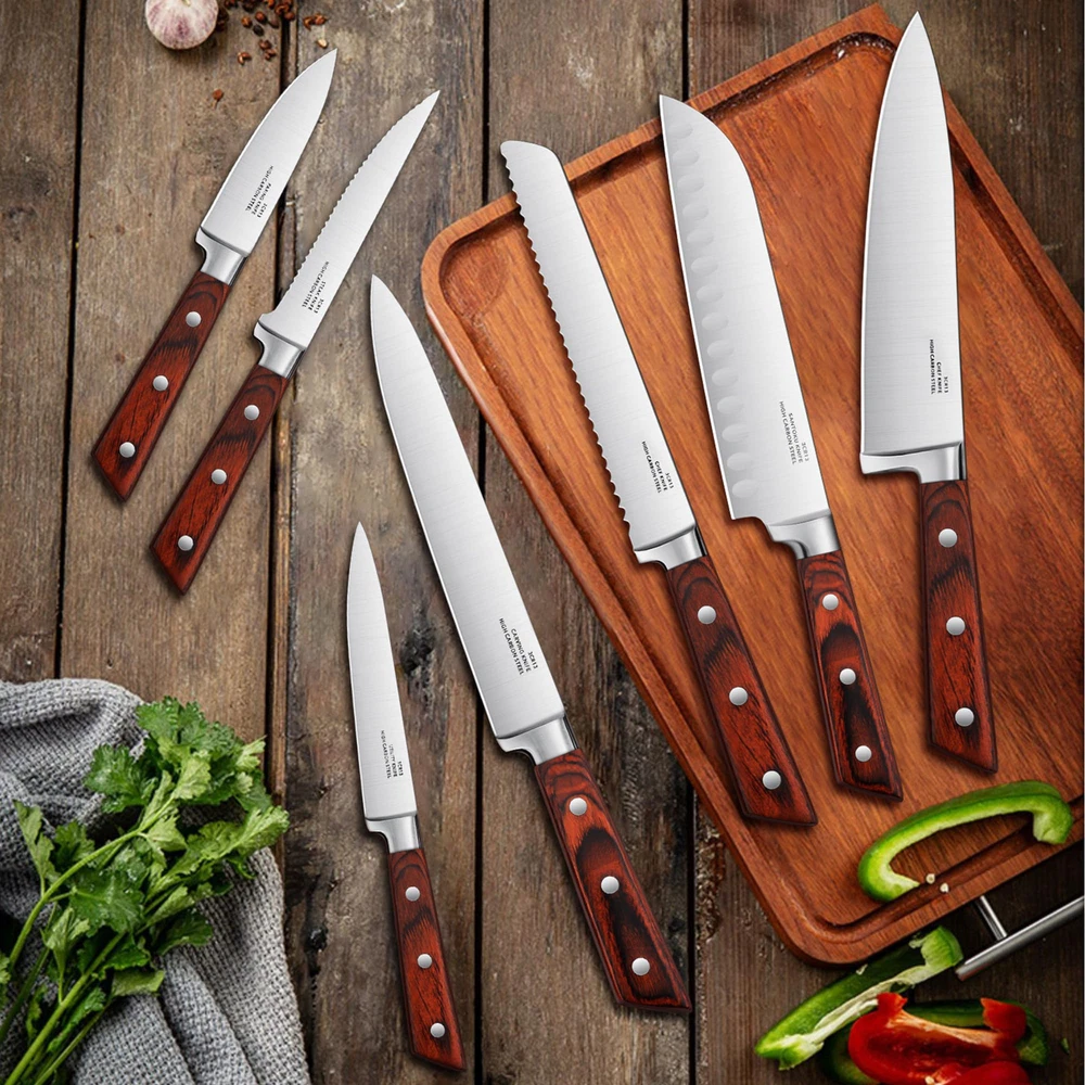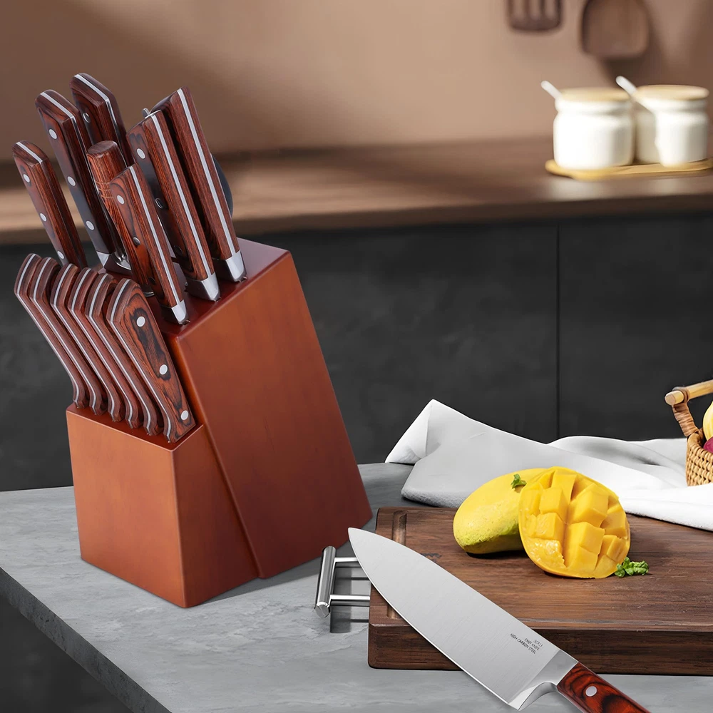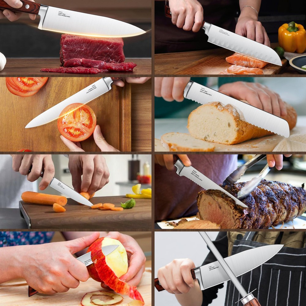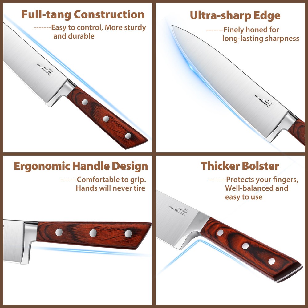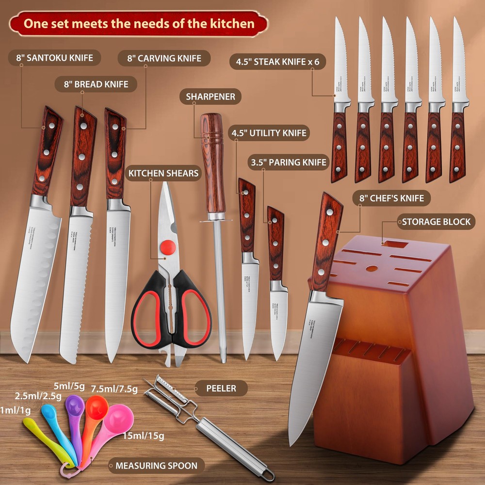 HIGH-END COMPLETE SET - 17 pieces set include 8" chef's knife, 8" santoku knife, 8" bread knife, 8" carving knife, 4.5" utility knife, 3.5" paring knife, 4.5" steak knife x 6, kitchen shears, sharpener, storage block, peeler, measuring spoon, A fully functional and cost-effective kitchen knife set that can meet various kitchen needs EXCELLENT QUALITY - The blades are forged from high-quality high carbon stainless steel, With a Full-tang structure and precise heat treatment to ensure the strength and durability, The blades are finely polished to be sharp enough to cut food more accurately, Makes slicing even easier, Resist stains, Rust and Pitting UNBEATABLE ERGONOMIC HANDLES - Full-tang construction provides balance, flexibility and optimal grip, Knife won't slip when your hand gets wet, Ensure safe cutting, Thicker bolster can protects your fingers when you cut food with force, Enjoy safety and precise cutting WIDELY USE - This multifunctional knife can meet most of the requirements of the kitchen, Great for slicing, picking, cutting, dicing, deboning, and carving, Easy to cut variable meats/vegetables/fruits, Suitable for kitchen, home, restaurant, outdoors on a camping trip or picnic, Perfect for Mother Day gifts, Christmas, weddings, birthdays, housewarmings, and Thanksgiving celebrations EASY TO STORE – The knife block make of high quality wood, stylish and classic, and insulate the moisture vapor, which will better protect the knives, Keep them sharp, Each knife has a suitable slot, Can be collected after use to make your kitchen neat, Cleaning and drying before storing in the block can better maintain the sharpness and glossiness of the knife HIGH-END COMPLETE SET - 17 pieces set include 8" chef's knife, 8" santoku knife, 8" bread knife, 8" carving knife, 4.5" utility knife, 3.5" paring knife, 4.5" steak knife x 6, kitchen shears, sharpener, storage block, peeler, measuring spoon, A fully functional and cost-effective kitchen knife set that can meet various kitchen needs EXCELLENT QUALITY - The blades are forged from high-quality high carbon stainless steel, With a Full-tang structure and precise heat treatment to ensure the strength and durability, The blades are finely polished to be sharp enough to cut food more accurately, Makes slicing even easier, Resist stains, Rust and Pitting UNBEATABLE ERGONOMIC HANDLES - Full-tang construction provides balance, flexibility and optimal grip, Knife won't slip when your hand gets wet, Ensure safe cutting, Thicker bolster can protects your fingers when you cut food with force, Enjoy safety and precise cutting WIDELY USE - This multifunctional knife can meet most of the requirements of the kitchen, Great for slicing, picking, cutting, dicing, deboning, and carving, Easy to cut variable meats/vegetables/fruits, Suitable for kitchen, home, restaurant, outdoors on a camping trip or picnic, Perfect for Mother Day gifts, Christmas, weddings, birthdays, housewarmings, and Thanksgiving celebrations EASY TO STORE – The knife block make of high quality wood, stylish and classic, and insulate the moisture vapor, which will better protect the knives, Keep them sharp, Each knife has a suitable slot, Can be collected after use to make your kitchen neat, Cleaning and drying before storing in the block can better maintain the sharpness and glossiness of the knife