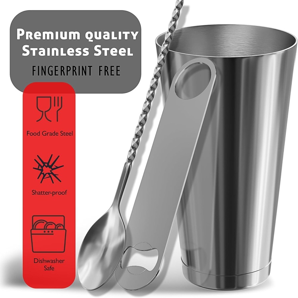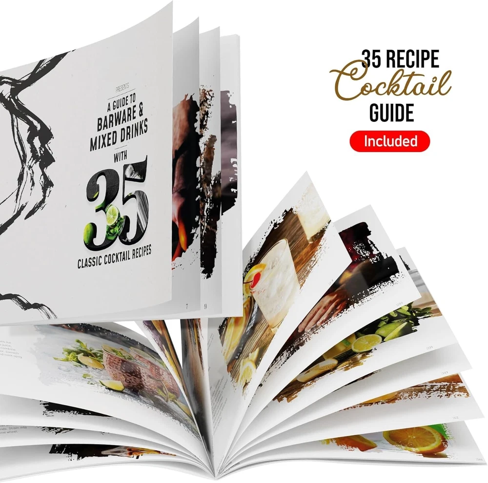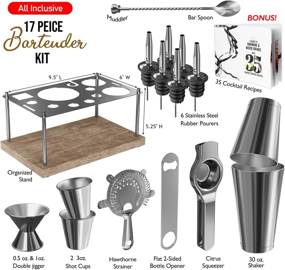 Mixology Bartender Kit: Create your favorite drinks with a cocktail kit gift set. Our Bar Set Cocktail Shaker Set Bartending Kit includes the bar tools and barware you need in a home bar kit. Complete Cocktail Set: Cocktail mixer set includes: wooden stand, 2-piece Boston cocktail shaker, 30 oz; double sided jigger, mixing spoon, Hawthorne strainer, 6 liquor pourers, 7" flat bottle opener, citrus juicer, 2 stainless steel 3 oz shot glasses, and recipe booklet. Compact Barware Set: This cocktail shaker set bartender kit is compact and portable. Place the bar tool set inside the cocktail shaker for elegant storage. Professional Bartender Set: Our shaker set, bartender kit is made from commercial-grade stainless steel. Rustproof and dishwasher safe, this drink mixing set is built to last. cocktail shaker bartender kit set bar accessories tools mixology for the home drink shakers mixer with strainer tool mixing martini boxton bottle opener muddler for cocktails liquor bottle pourers cocktail recipe book lemon juicer squeezer jigger bartending spoon shot glasses silver