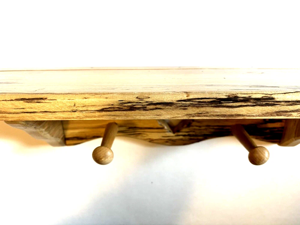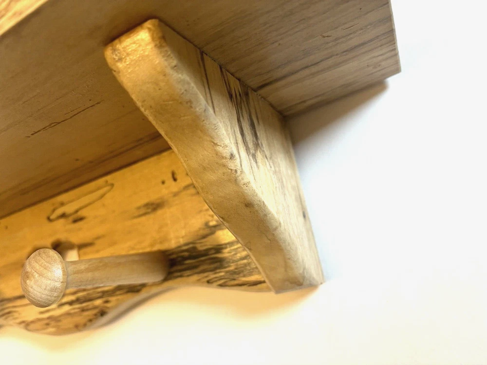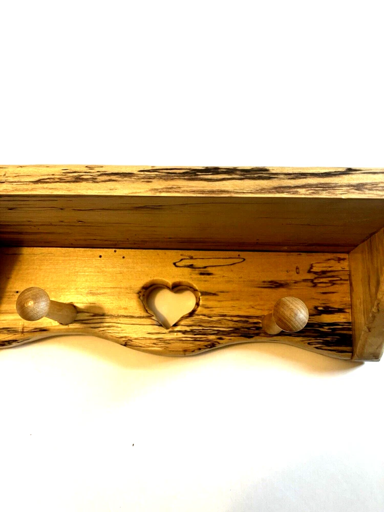 The 17" Wall Hung Shelf with 2 Cloths Hanging Pegs is a stylish and functional addition to any room. Made of solid wood with a light wood tone, this rectangular shelf features a patterned design in brown color. It includes one shelf for displaying plates or decorative items and two hanging pegs for cloths. Made in the United States, this shelf does not require assembly and is perfect for organizing and decorating your home.