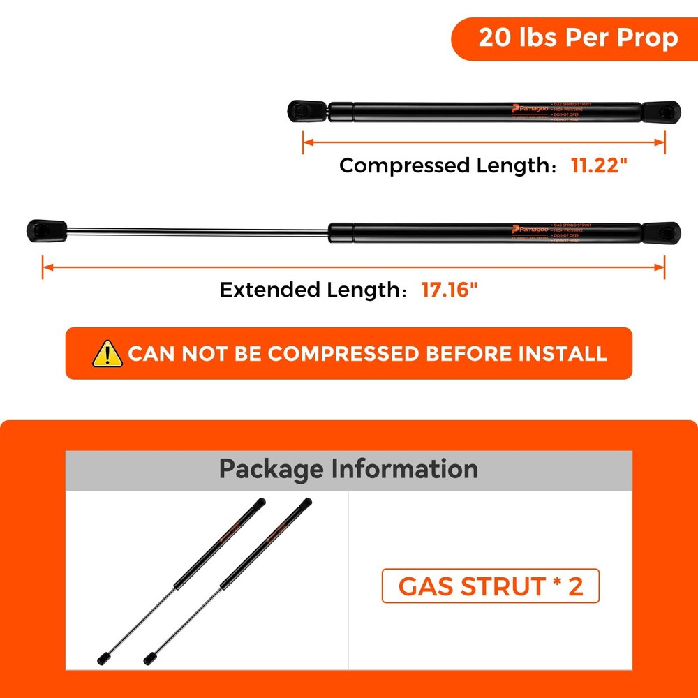 C16-15645 C1615645 17 inch Gas Strut 20 lb 89 N Per Prop, Gas Spring Shock Lift for A.R.E Leer SnugTop Camper Shell Window Canopy Door Pickup Truck Cap RV Door(2 Pack) Parameter: Extended Length: 17.16 Inch; Compressed Length: 11.22 Inch. 20 lb 89 N per prop. 2 PACK OEM number: C16-15645 C1615645 Application: xactly designed based on original lift supports, this 1 pair of lift struts could perfectly replace the worn-out shocks on your ARE Leer Snugtop Tacoma Camper Shell Window / Canopy Door / Pickup Truck Cap / RV Door / Fiberglass Rear Topper / RV Motorhome Compartment Chest High Performances: Our professional manufacturing facility providing you with superior product quality. 180,000 times -passed TUV fatigue test. choose special low-temperature-resistant materials, Working Temperature : -40℃~60 ℃/-40℉~140℉ Warm Services: We will provide 18-MONTHS support service. Whether you have any questions before or after making a purchase, we are here to provide you with professional help and attentive service. Glad you click to help Gas Spring Struts: Need to prop open a door, cabinet, barrier?Your gas struts are construction grade and do all the heavy lifting so you can focus on the real work.Easy Fit & Removal: Plates fitted to each end of your gas springs can easily be fitted and removed to any surface. Best Uses: gas piston lift mechanism truck truck tonneau cover gas props undercover gas strut undercover tonneau strut lift system strut Features: safe and smooth So, What’re You Waiting For? Let your new gas springs do the heavy lifting for you while you can crack on with the job at hand, unhindered and well-executed, click "Add To Cart" Now! Shipping We offer FREE shipping on all orders! We ship within Three business days of payment, usually sooner. We use a selection of shipping services such as UPS, FedEx, USPS etc. We only ship to the lower 48 states, no APO/FPO addresses or PO Boxes allowed. Local pickups and combined shipping options are not provided at this time. Return You can return a product for up to 30 days from the date you purchased it. Any product you return must be in the same condition you received it and in the original packaging. Please keep the receipt. Payment We accept payment by any of the following methods: PayPal Please pay as soon as possible after winning an auction, as that will allow us to post your item to you sooner! Feedback Customer satisfaction is very important to us. If you have any problem with your order, please contact us and we will do our best to make you satisfied. Contact Us If you have any queries, please contact us via ebay. We usually respond within 24 hours on weekdays. Please visit our eBay store to check out other items for sale! Thank you for shopping at our store.