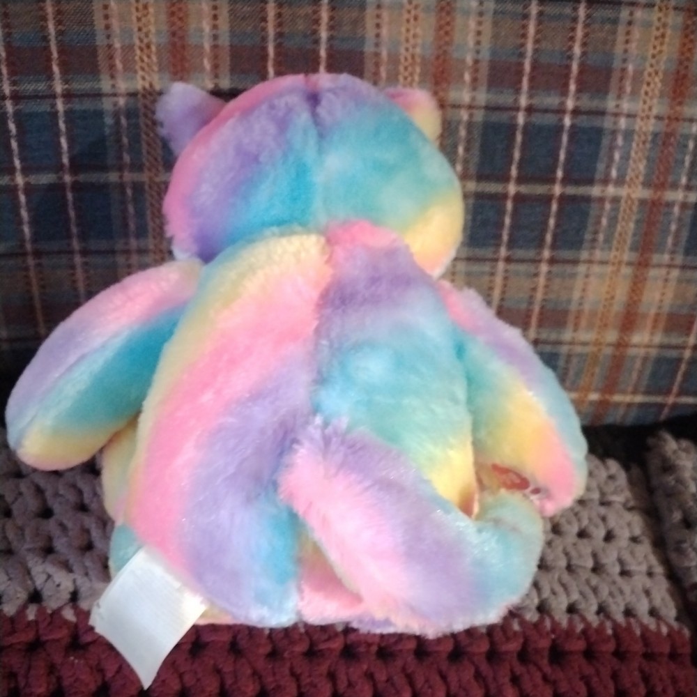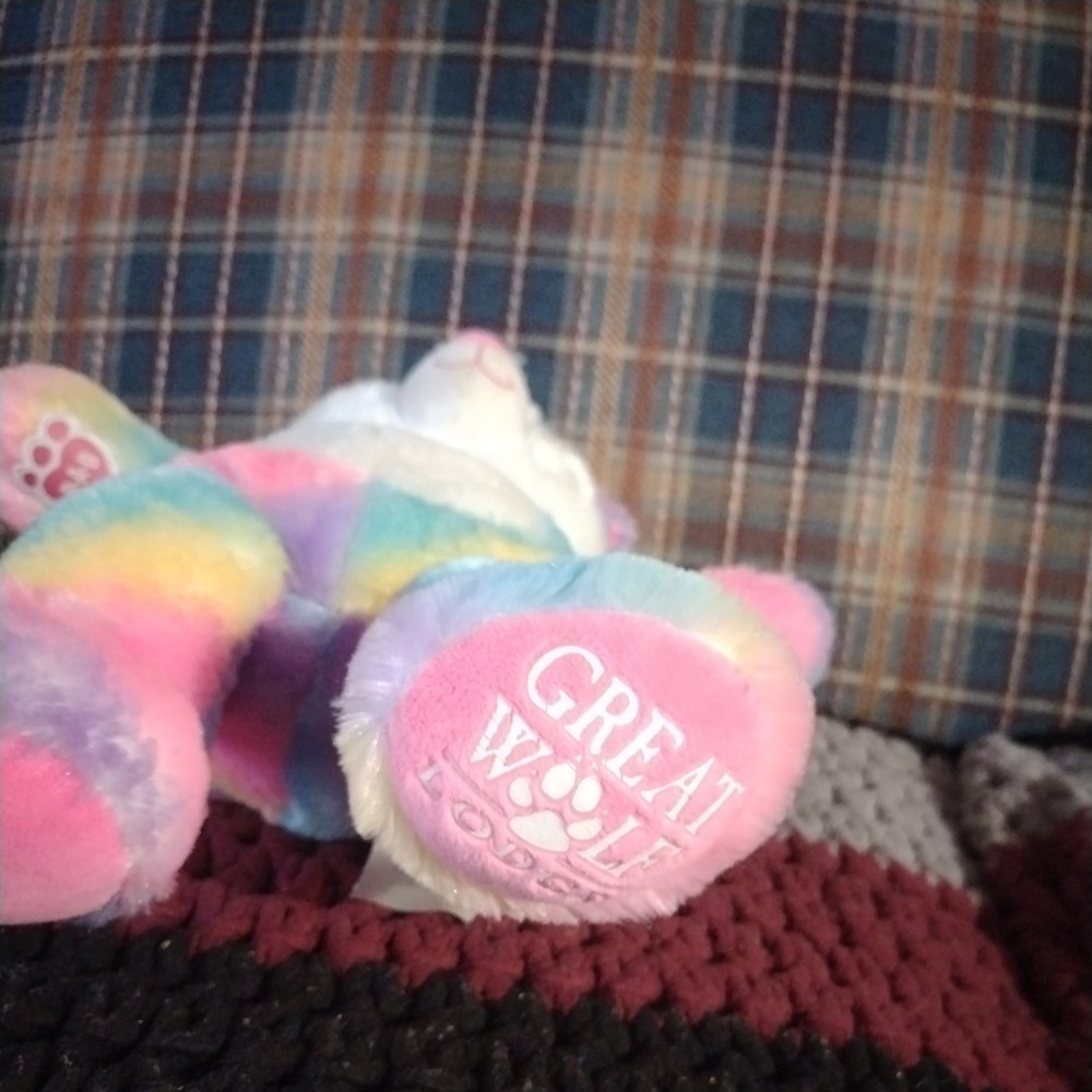 Unleash the spirit of the wilderness with this exclusive 17" Build-A-Bear Workshop Great Wolf Lodge Rainbow Plush. A vibrant mosaic of colors. overall condition is good