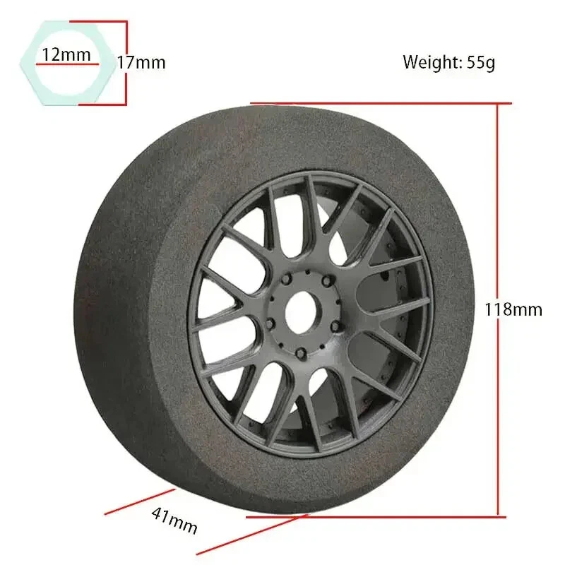 17mm Hex 1/8 RC Foam Tires Wheel Rims 118mm Set for HSP HPI Racing Car Description: Fit :1:8 GT X0-1 RC Racing Car Tyre : Sponge Wheel Hub: Nylon Color:Black Diameter : 118mm (With Tires) Width: 41mm Mount: 17mm Hex NOTICE: The wheels and tires are not glued together and must be glued before use. Please carefully check the tire size before purchase, whether it is the same as your model tire size, and confirm it again before payment, so as not to return the refund, thank you, wish you a happy shopping.