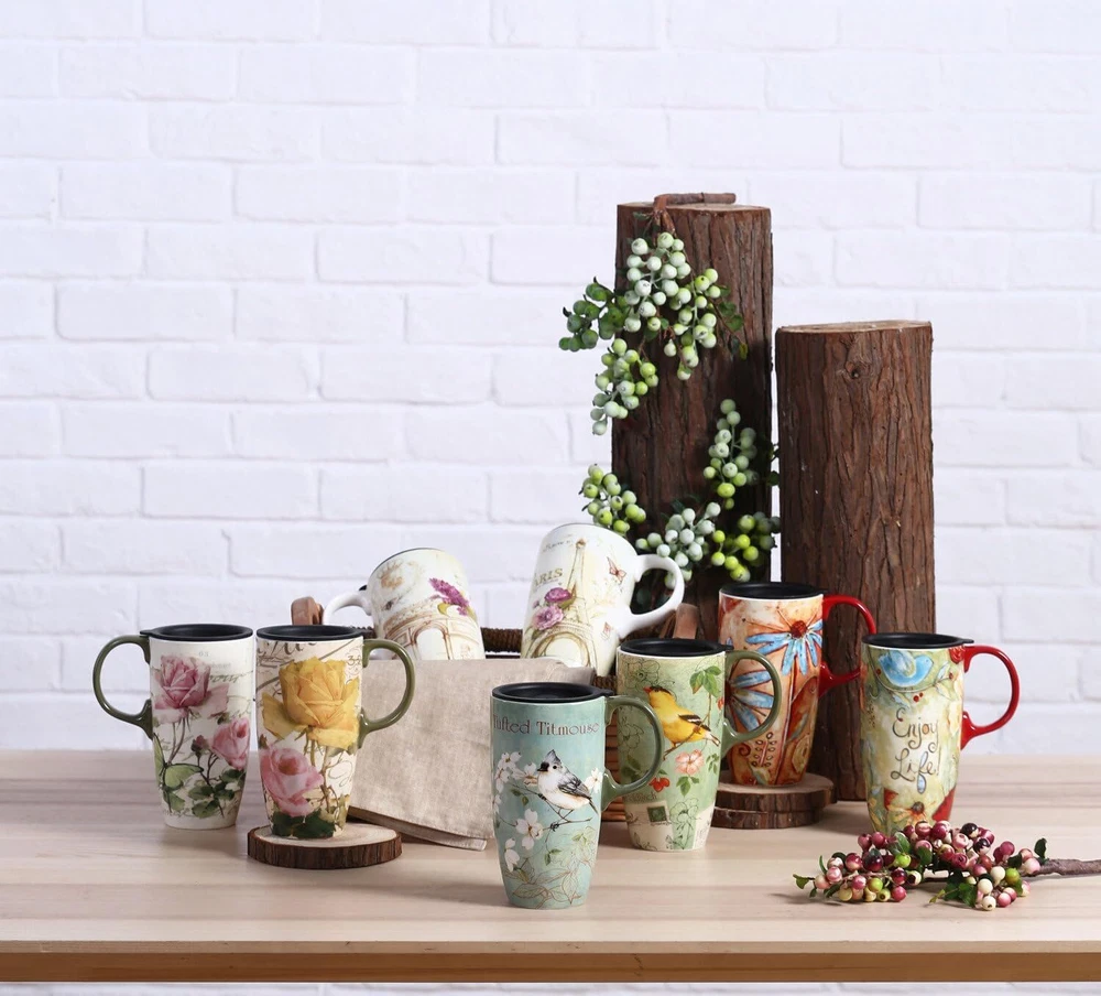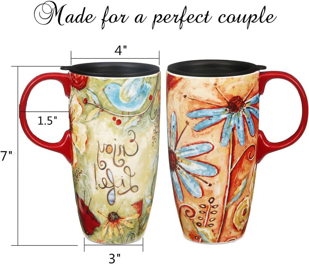 CAPACITY: Hold up to 17 ounces. Size is 3"W x 4"L x 17"H MATERIAL: Dishwasher safe. Made of durable high-fired ceramic . Easy to clean THOUGHTFUL DESIGN: Handmade elegant minimalist. PACKAGE: Set of 2. Comes in a drop resistance box to resist breakage. No questions asked and hassle free returns. Each piece is lead free,dishwasher,oven and micowave safe. Remove lid before putting in microwave. Easy to clean and re-heat drink
