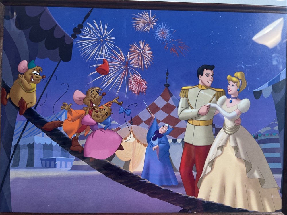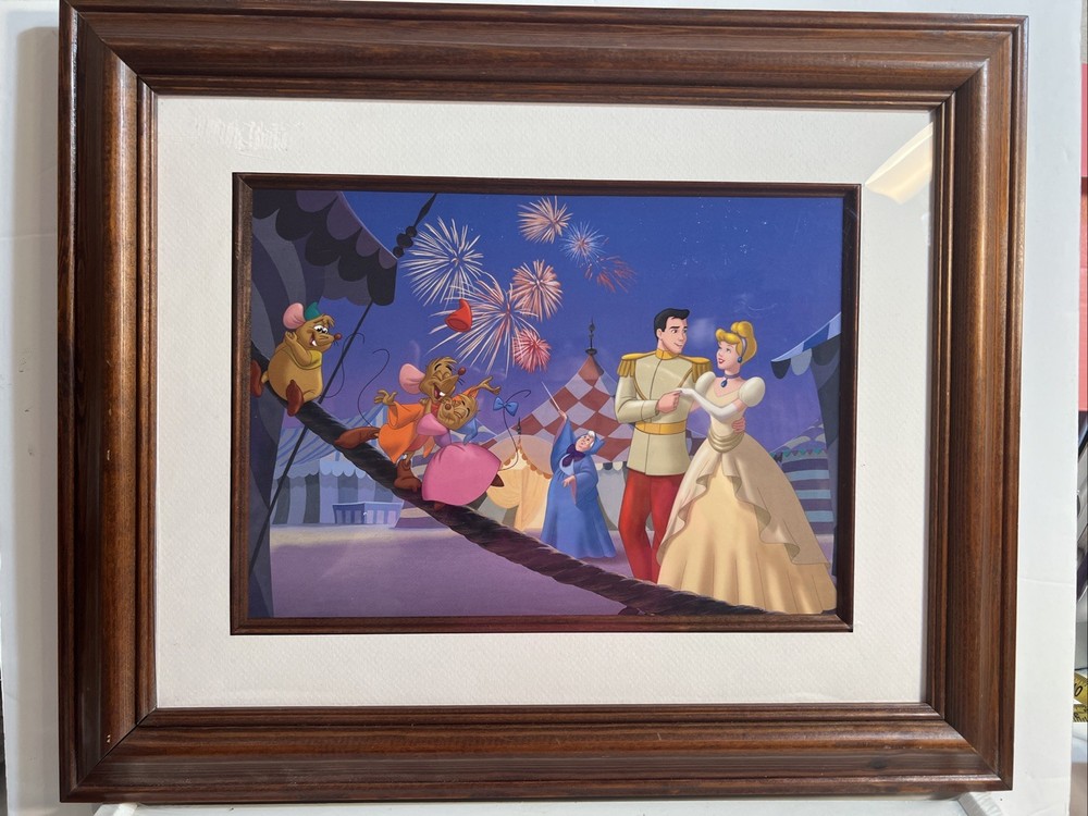 This is a framed Walt Disney Cinderella II: Dreams Come True lithograph print. This specific image is part of a set of four exclusive commemorative lithographs released by the Disney Store in 2002 to promote the direct-to-video movie. The print features Cinderella, Prince Charming, the Fairy Godmother, and the mice Gus and Jaq. The original lithographs are typically sold in a portfolio set of four prints. Each print in the set measures approximately 11 by 14 inches. They were given as a gift with the pre-order of the VHS or DVD of the movie.