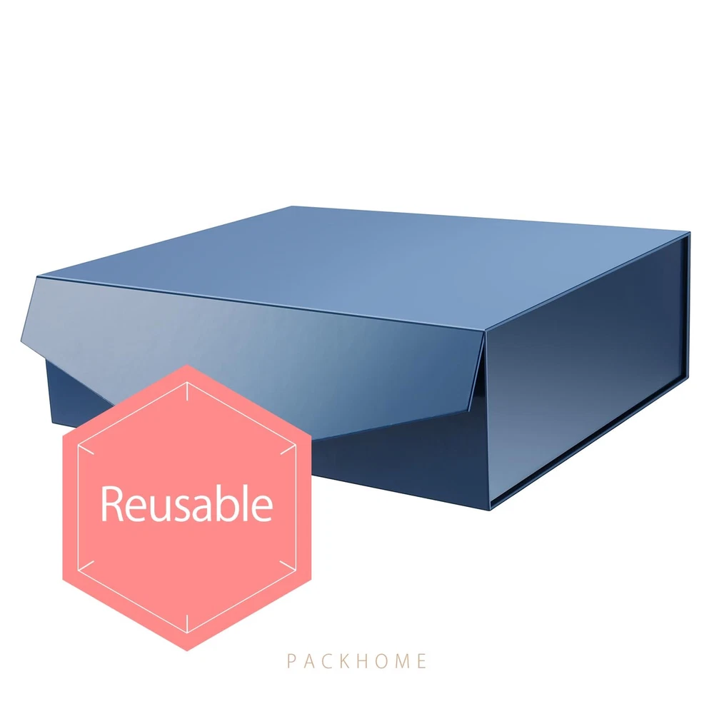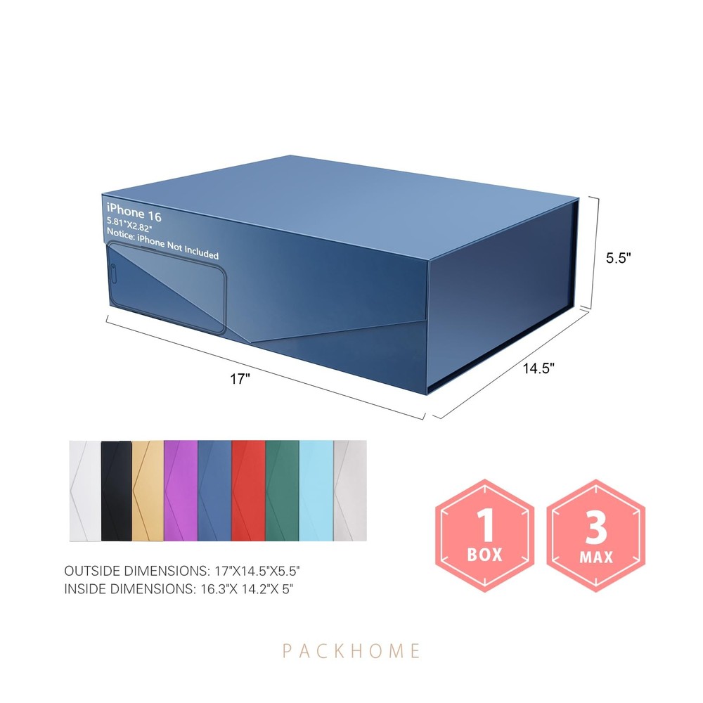 provides various colors by different packaging quantity for what you need, we have different sizes of gift boxes for your options, free feel to visit our amazon store by click "" next to the title High Quality: Heavy-duty bookboard construction with gloss finish paper overwrap inside and outside. The paper is from well-managed forests. The tape used is from Tesa Germany. You can create beautiful gifts by embellishing the box with washi tape, rhinestones, or decoupage paper! Gift box with lid looks effortlessly smart and stylish when left plain Design: Collapsible gift box is shipped flat. It is easy to assemble. Tear off the triangle stickers, then assemble and glue the box. This extra large navy blue glossy presentation gift box has a concealed and robust magnetic closure which allows the box to be opened and closed repeatedly without any problems Size: Assembled box outside measure 17 inch(43.5 cm) x 14.5 inch(36.5 cm) x 5.5 inch(14 cm), inside dimensions 16.3 inch(41.5 cm) x 14.2 inch(36 cm) x 5 inch(12.5 cm). All dimensions are measured manually with deviation (range) at 1-3 mm, subject to the product. It can hold presents like t-shirt, sweater, handbag, shoes, jackets and larger gifts. It's also for everyday or seasonal decorative storage and organization Application: Elegant and easy way to wrap, contain, protect and present a special gift for Christmas, Birthdays, Baby Showers, Weddings, Easter, Mother's Day, Holidays, Anniversaries, Graduations, Housewarmings and so on. This magnetic gift box enhances and transforms your gift into a unique presentation