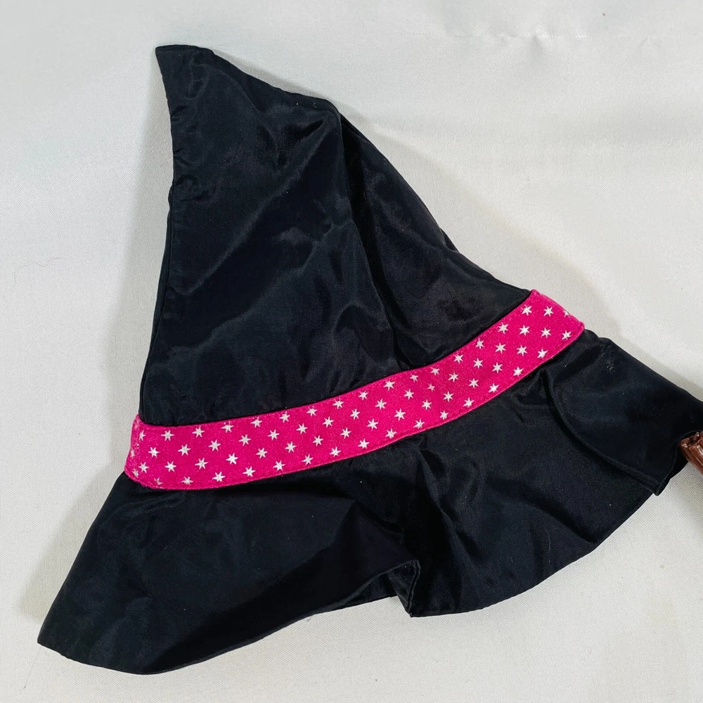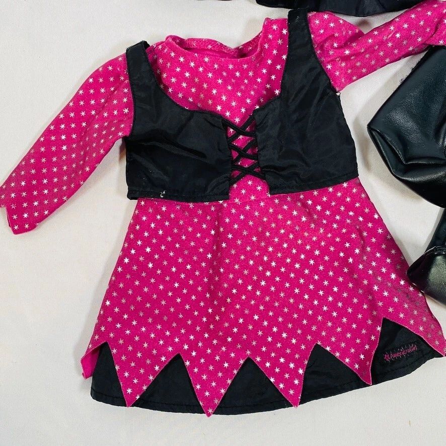 18" American Girl Doll 2013 Pink Halloween Witch Costume, Complete Set. Includes Hat, Dress, Boots, and Broom. In gently played with condition, some white marks on dress hem and hat as pictured, may wash out, I haven't tried. No other flaws noted. Please see all pictures for exact cosmetic condition and other details, and ask any questions before purchasing. We are a husband and wife team with a growing family, and greatly appreciate your support of our small business. Please browse our eBay store for a variety of other American Girl items. We hope you enjoy this set!