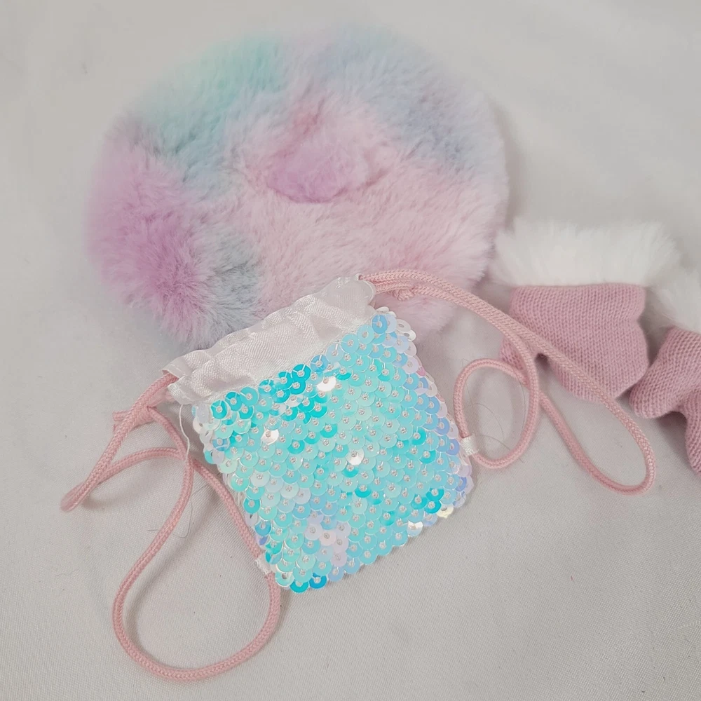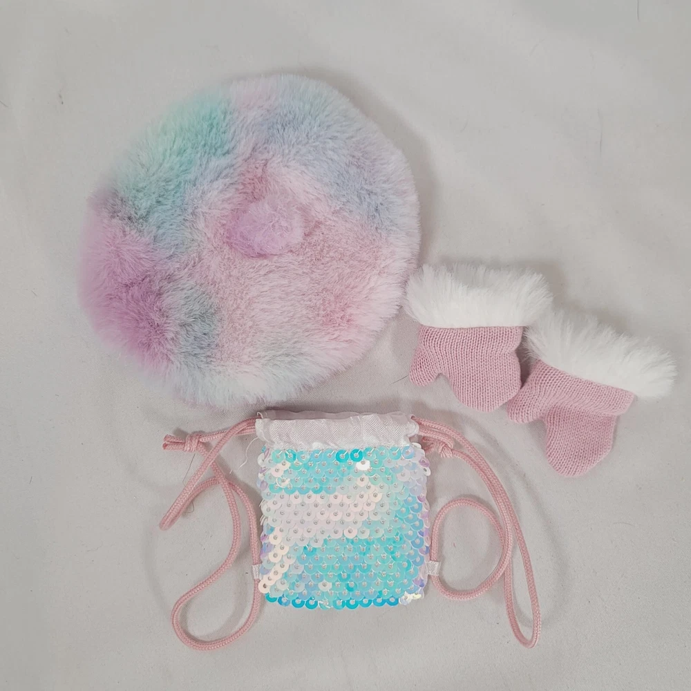 14.5" American Girl Doll Gwynn Tan (2022 GOTY Corinne's Little Sister) Collection: Gwynn's Meet Accessories. Complete Set, includes Faux-Fur Multicolored Beret Hat, Pink Fur-Trimmed Mittens, and Sequin Drawstring Backpack Purse. In like-new condition, just without the original box, no flaws noted. Please see all pictures for exact cosmetic condition and other details, and ask any questions before purchasing. We are a husband and wife team with a growing family, and greatly appreciate your support of our small business. Please browse our eBay store for a variety of other American Girl items. We hope you enjoy this set!