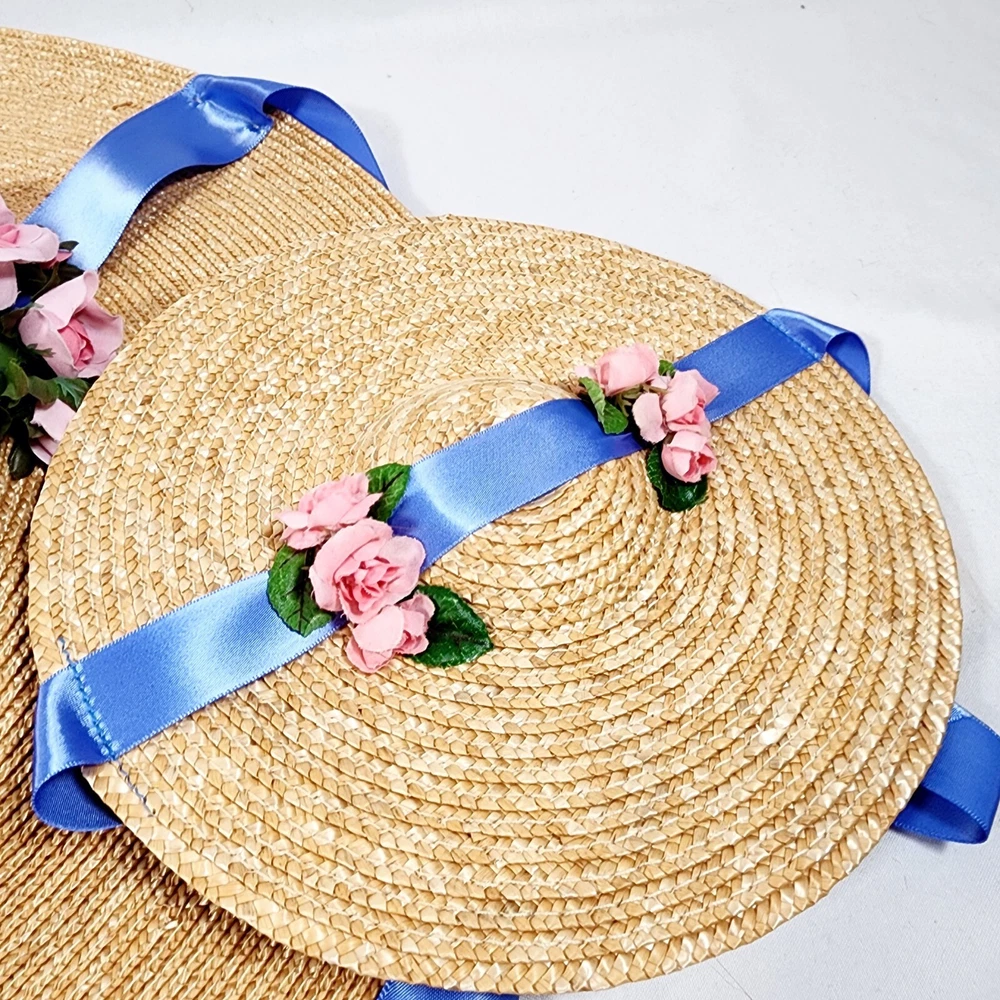 The American Girl Collection - Matching Straw Hats for Felicity's Summer Gown Outfit. Set includes 1 Hat Sized for 18" Dolls and 1 Child-Sized Hat. These are from the Pleasant Company era of American Girl, and definitely genuine. The Girl-Sized one is from the "Dress Like Your Doll" Line, which was phased out around 2000. Extremely rare and hard to find. Hats are both Rose-Trimmed, Wide-Brimmed, Straw Hats, and tie on with blue satin ribbons. Ribbons are stitched along edges of hats to keep them from slipping around. Set is in excellent condition, may have a tiny flaw in the weaving here and there but nothing noticeable. Ribbons in both hats are in great shape, as are the flowers. I think the hats are fairly flexible in sizing and could likely fit a girl or adult, depending on how you want them to fit and the size of your head, of course. Measurements of the girl-sized hat are as follows: 15 3/4" brim edge to edge, 6" diameter of hat inner crown Please see all pictures for exact cosmetic condition and other details, as they are part of the description as well, and ask any questions before purchasing. We are a husband and wife team with a growing family, and greatly appreciate your support of our small business. Please browse our eBay store for a variety of other American Girl items. We hope you enjoy this set!