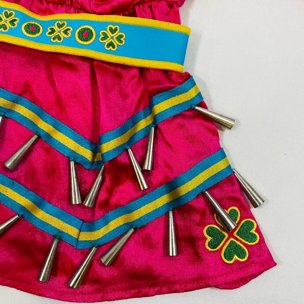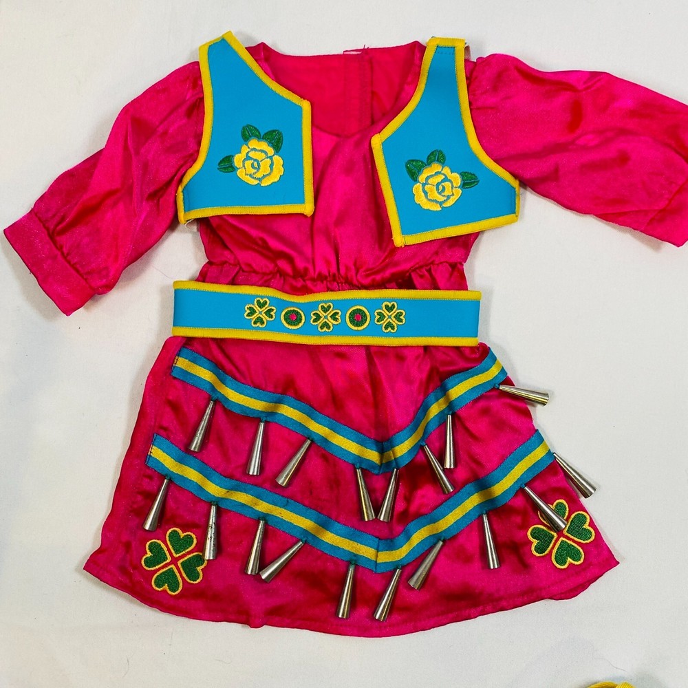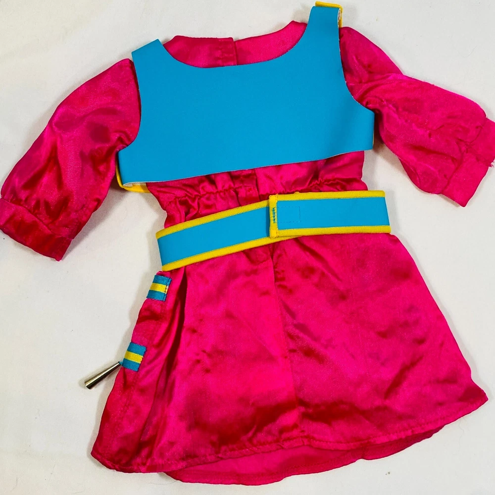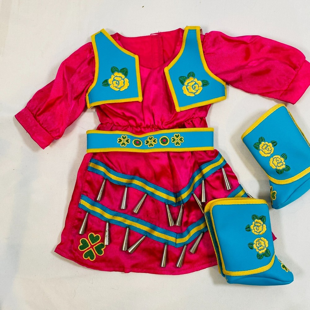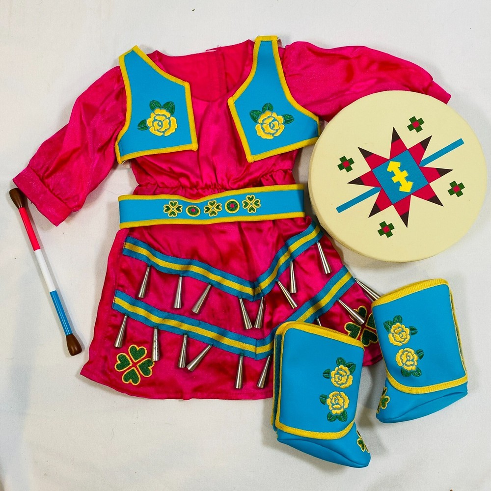 18" American Girl Doll 2014 Kaya's Modern Jingle Dress of Today II. Includes Pink Satin Jingle Dress, Embroidered Blue Vest, Belt, & Boots, and Drum w/ Mallet. Also includes one hair tie, the other hair tie is missing, as well as the comb. All in excellent condition, no flaws to note beyond some discoloration on a few of the metal jingles from age, and one small run/snag on the front of the dress as pictured. Adult-collector owned, never played with, these flaws occurred in storage, and some pieces got lost in the process. Please see all pictures for exact cosmetic condition and other details, as they are part of the description as well, and ask any questions before purchasing. We are a husband and wife team with a growing family, and greatly appreciate your support of our small business. Please browse our eBay store for a variety of other American Girl items. We hope you enjoy this set!