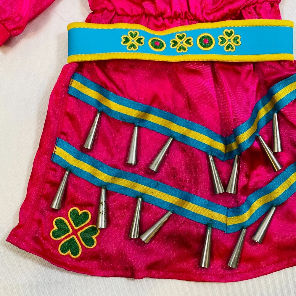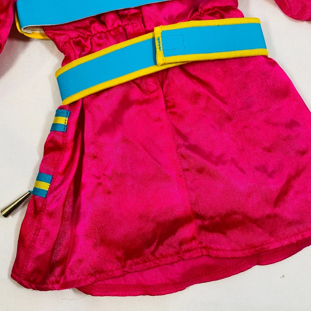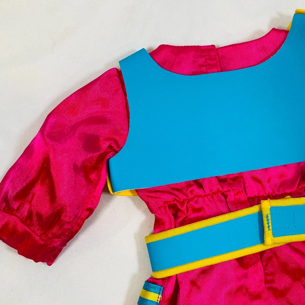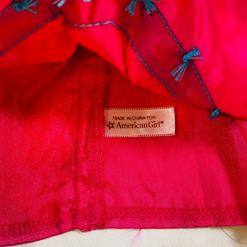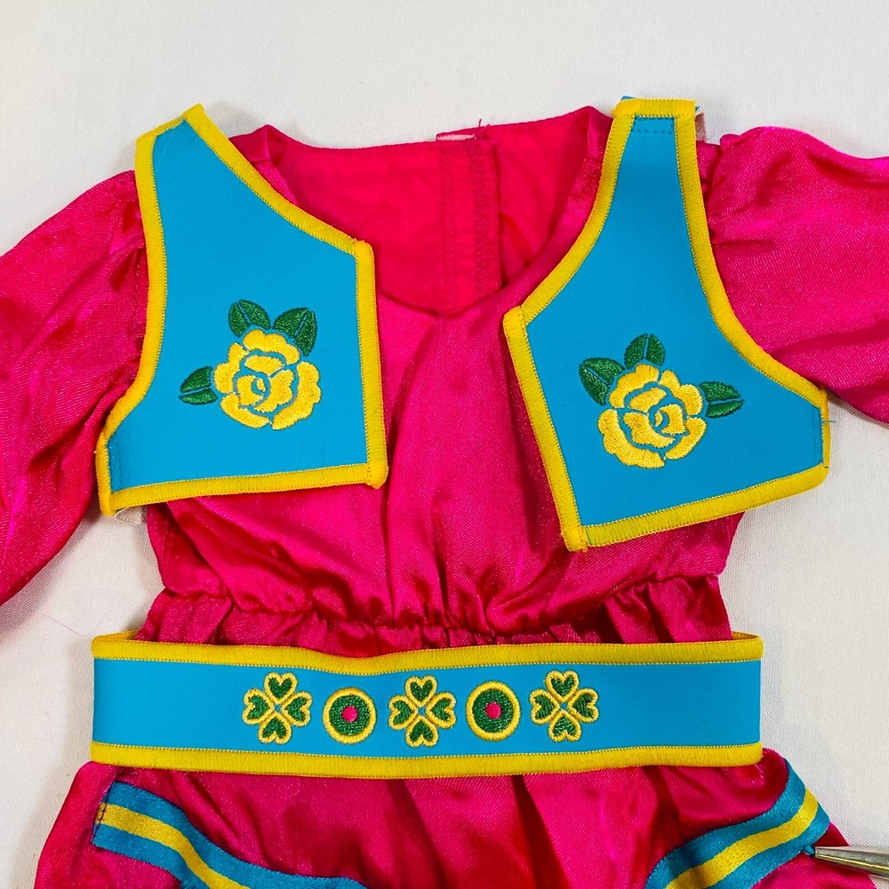 18" American Girl Doll 2014 Kaya's Modern Jingle Dress of Today II. Includes Pink Satin Jingle Dress, Embroidered Blue Vest, Belt, & Boots, and Drum w/ Mallet. Also includes one hair tie, the other hair tie is missing, as well as the comb. All in excellent condition, no flaws to note beyond some discoloration on a few of the metal jingles from age, and one small run/snag on the front of the dress as pictured. Adult-collector owned, never played with, these flaws occurred in storage, and some pieces got lost in the process. Please see all pictures for exact cosmetic condition and other details, as they are part of the description as well, and ask any questions before purchasing. We are a husband and wife team with a growing family, and greatly appreciate your support of our small business. Please browse our eBay store for a variety of other American Girl items. We hope you enjoy this set!