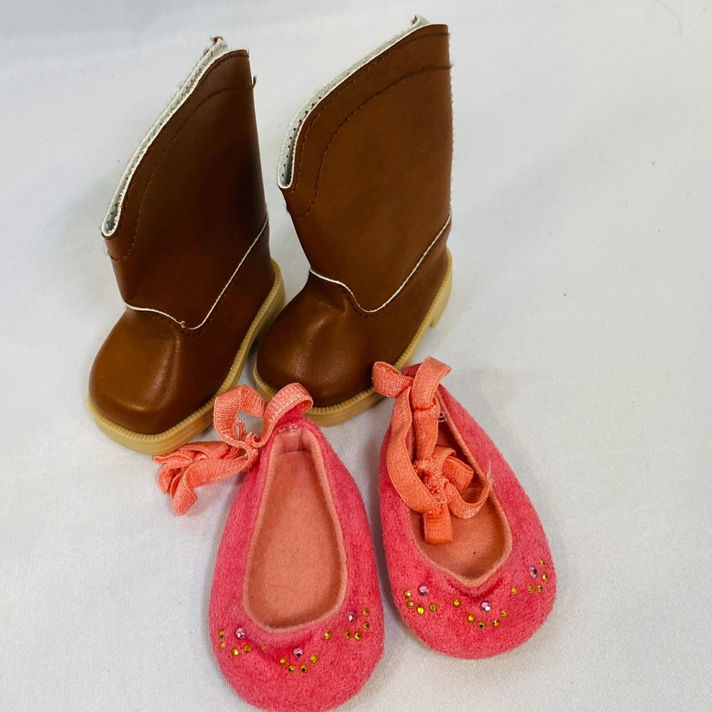 18" American Girl Doll 2005 GOTY Marisol Luna's Meet Shoes, 2007 GOTY Nicki Fleming's Gala Outfit Slippers, and MyAG 2010 Western Riding Outfit Boots. In excellent condition overall, no flaws noted. Please see all pictures for exact cosmetic condition and other details, and ask any questions before purchasing. We are a husband and wife team with a growing family, and greatly appreciate your support of our small business. Please browse our eBay store for a variety of other American Girl items. We hope you enjoy this set!