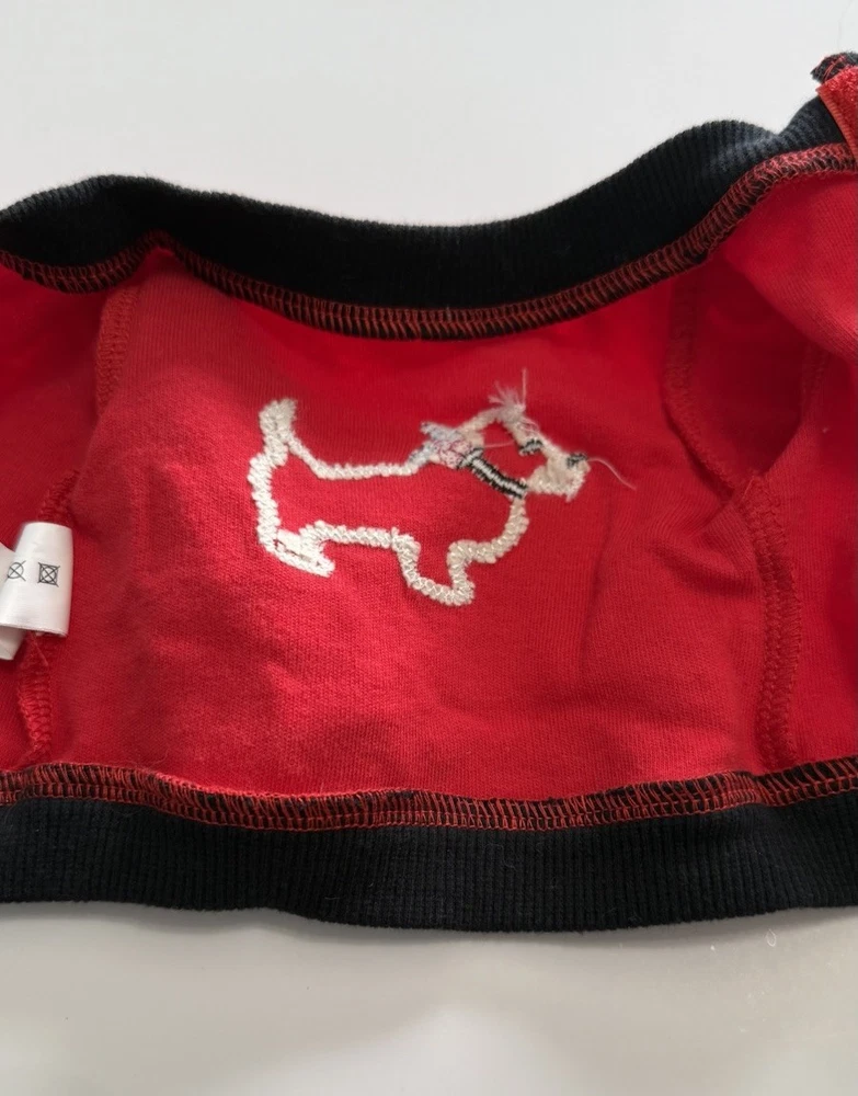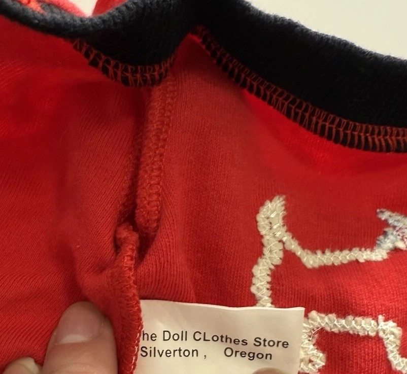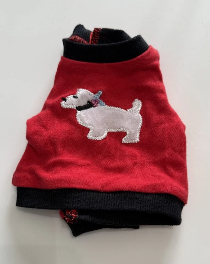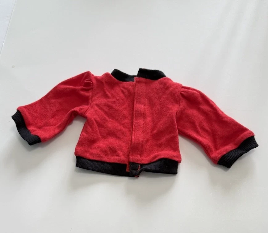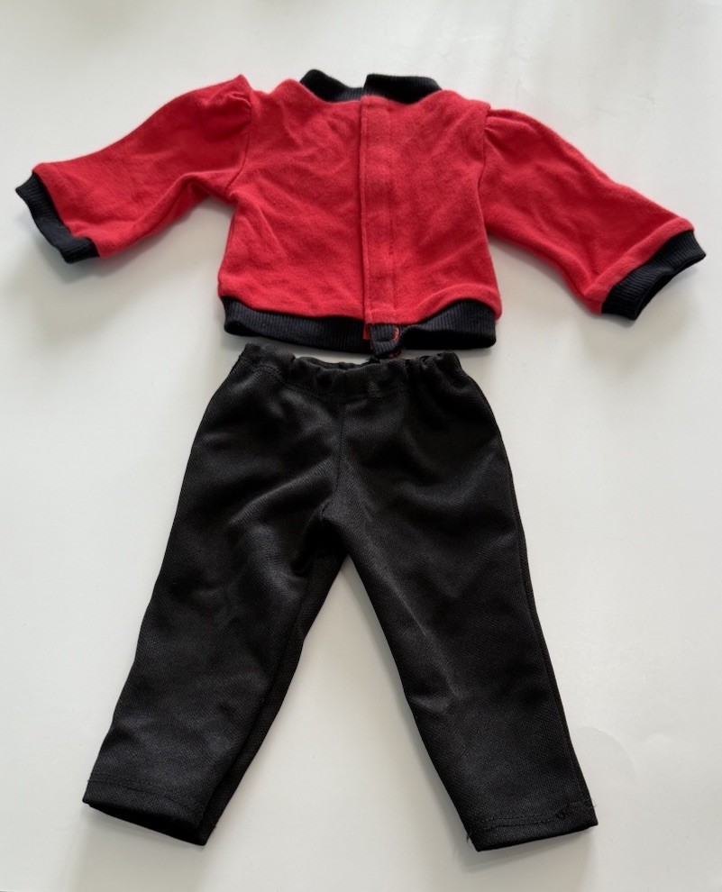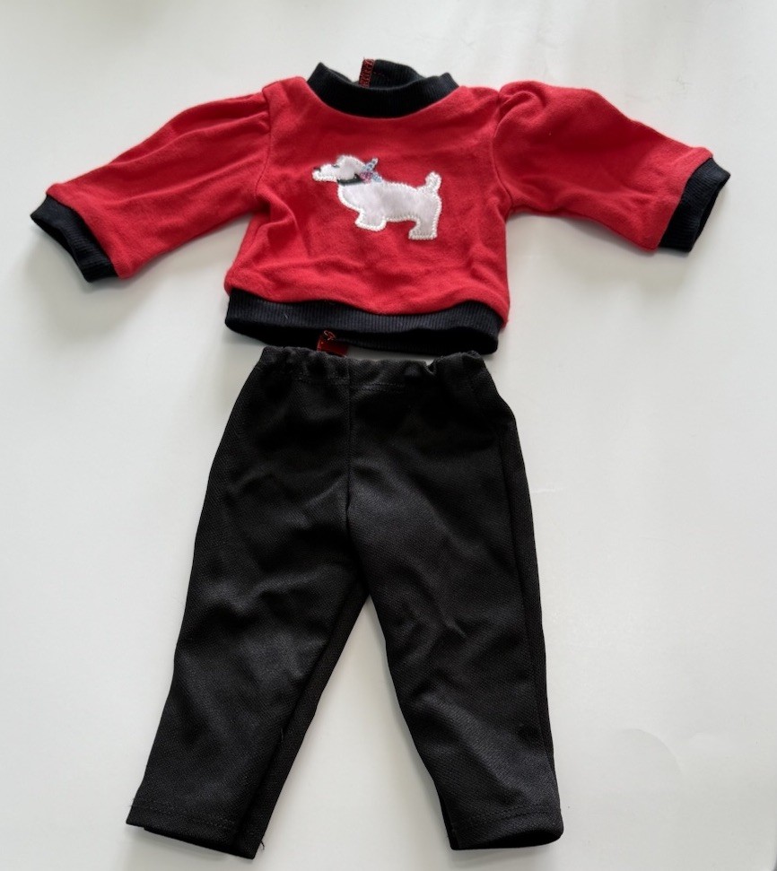 The product is a set of doll clothes that fits 18-inch American Girl dolls. The set includes a red and black long sleeved dog shirt, black pants, and a hanger. The clothes are made of cloth and are suitable for everyday wear. The set is designed for play dolls and is compatible with dolls of the same size.
