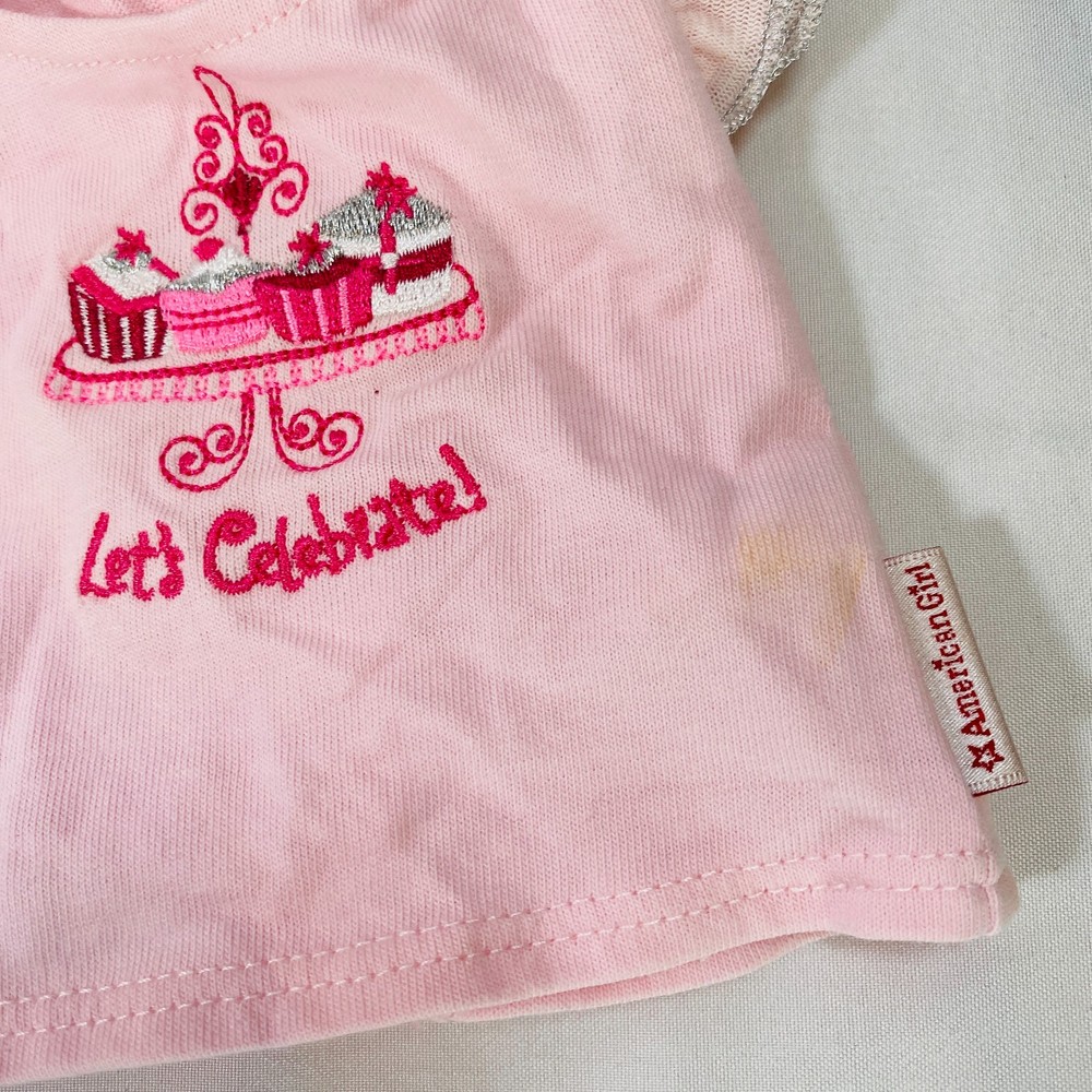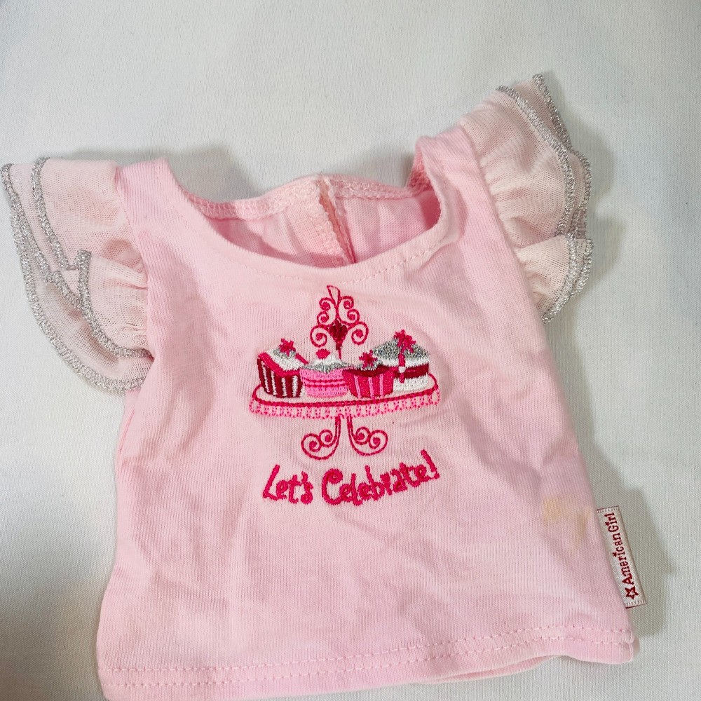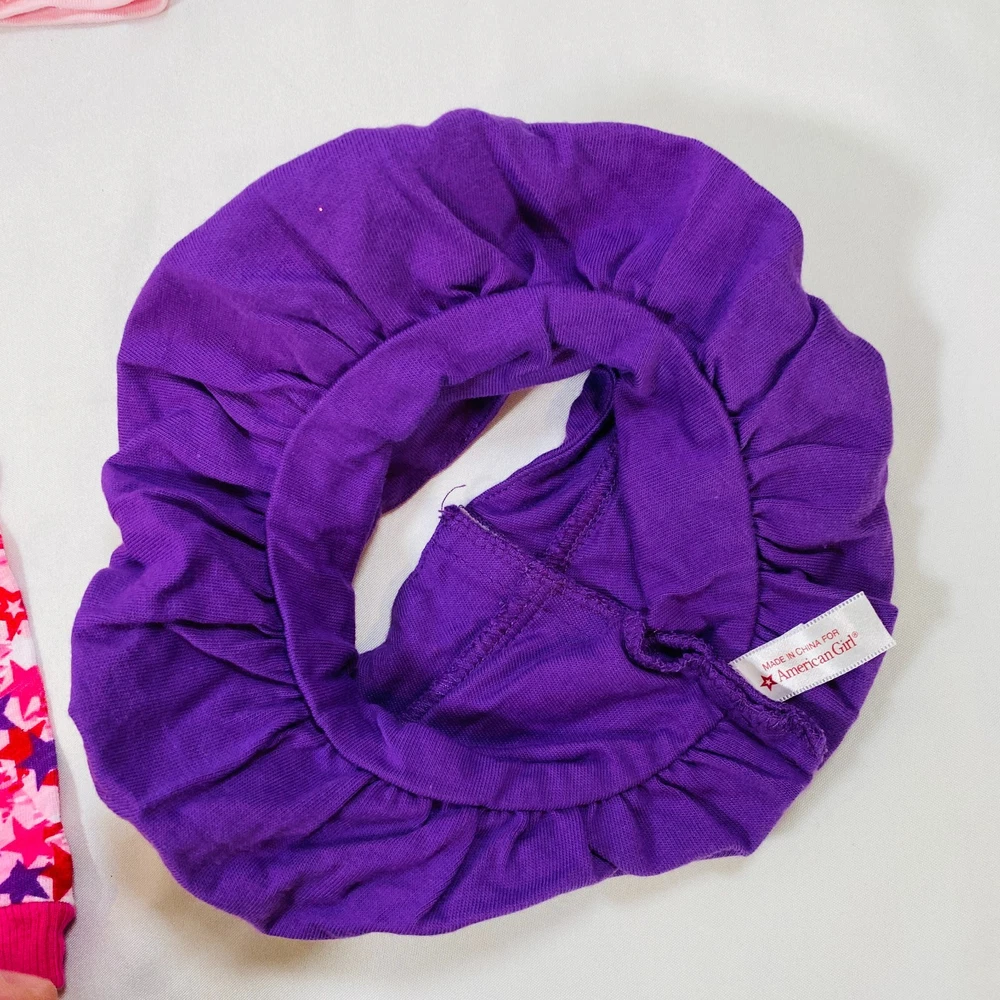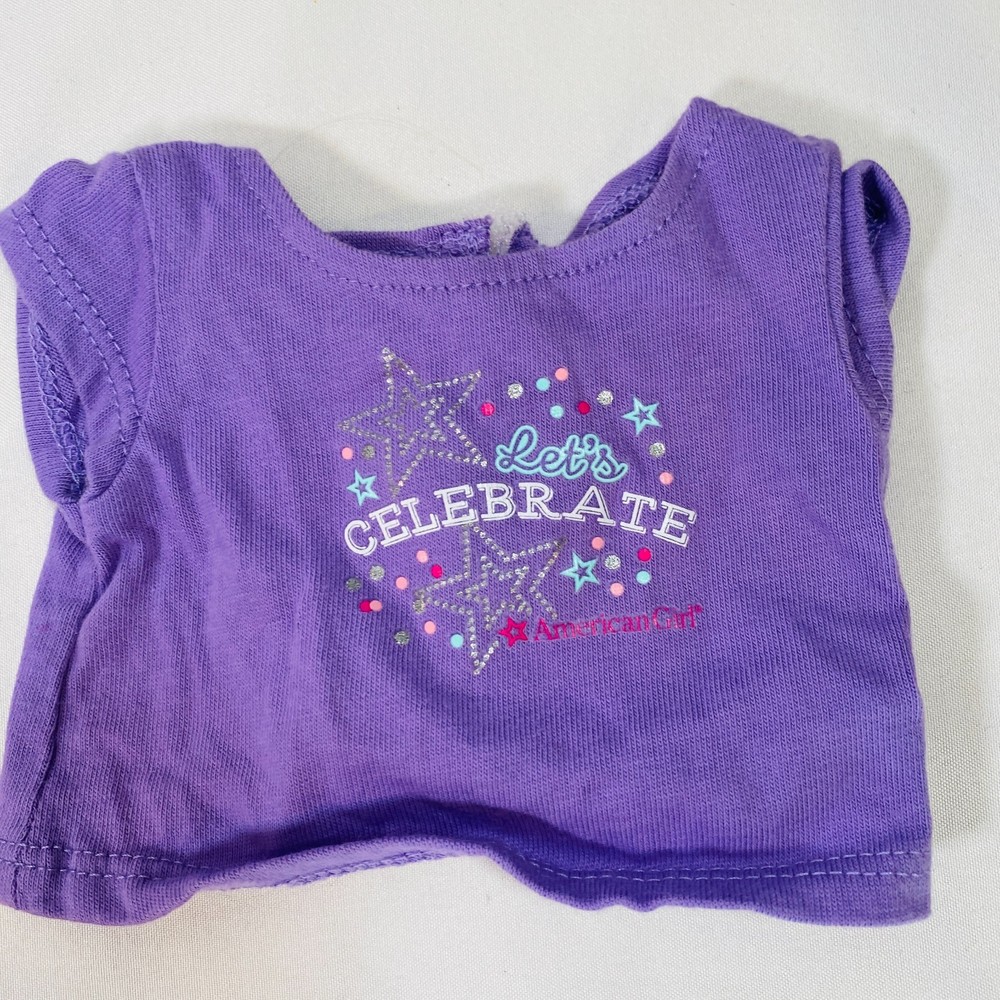 18" American Girl Doll Assorted Accessories. Set includes the following: "Let's Celebrate" Pink & Purple Shirts, Purple Bubble Skirt, and Star-Print Pants. In excellent pre-owned condition, no stains or rips besides a small mark on the pink top as pictured. Please see all pictures for exact cosmetic condition and other details, and ask any questions before purchasing. We are a husband and wife team with a growing family, and greatly appreciate your support of our small business. Please browse our eBay store for a variety of other American Girl items. We hope you enjoy this set!