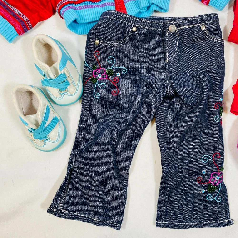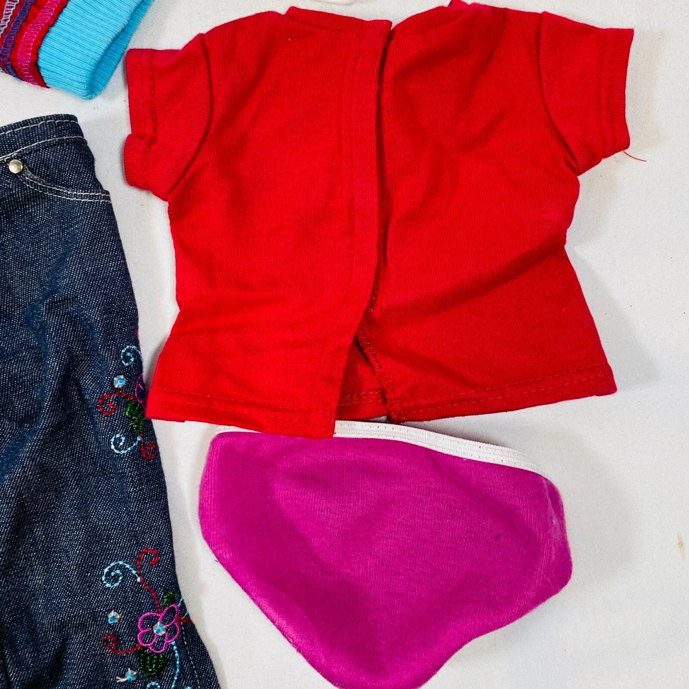 18" American Girl Doll Just Like You "Ready For Fun" Meet Outfit: Red Jacket, White Top, Embroidered Jeans, Magenta Underwear, Tennis Shoes. Just missing the socks. Also includes a bonus American Girl Place Chicago Red T-Shirt. All in gently played with condition, main flaw noted is some smudging on white shirt. Please see all pictures for exact cosmetic condition and other details, and ask any questions before purchasing. We are a husband and wife team with a growing family, and greatly appreciate your support of our small business. Please browse our eBay store for a variety of other American Girl items. We hope you enjoy this set!