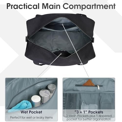 Narwey 18" Carry on Bag Underseat for Airplane Spirit Airlines Personal Item Travel Bag 18x14x8 Small Duffle Bag Duffel Bag Gym Weekender Overnight Bag with Wet Pocket for Women and Men (Black) Description : Airline-friendly Travel Bag. Bag size 17x11.5x7.5 inch (Capacity 25L) fits personal item size 18x14x8 of Spirit Airlines & Frontier Airlines, which can be placed under seat and no need to pay carry-on. 25L main compartment could accommodate all your travel items for 3 to 4 days or a week's worth of clothe Wet Dry Separated Small Gym Bag. Spacious enough for all your gym essentials yet compact enough to fit in a gym locker. Waterproof material lined wet pocket is ideal for storing wet or leaky items, such as toiletries and towels. Both sides feature pockets for water bottles and umbrellas Premium Weekender Bag. Go hands-free with adjustable and detachable padded shoulder strap and suitcase sleeve band. Sturdy and water resistant fabric avoid any rip and protect your gears well from rain or wet during trips. Convenient for a weekend get away Multiple Reasonable Pockets. Front zippered pocket allows quick access to frequently used items like tickets or passport. 3 inner mesh pockets could keep small items organized. No more scrambling - this bag keeps your essentials handy Multi-purpose Design. More than carry-on, it tackles a wide variety of situations. Ideal for garment bag, hospital bag, sports, gym use, yoga, travel, weekend shopping, overnight, camping and picnic