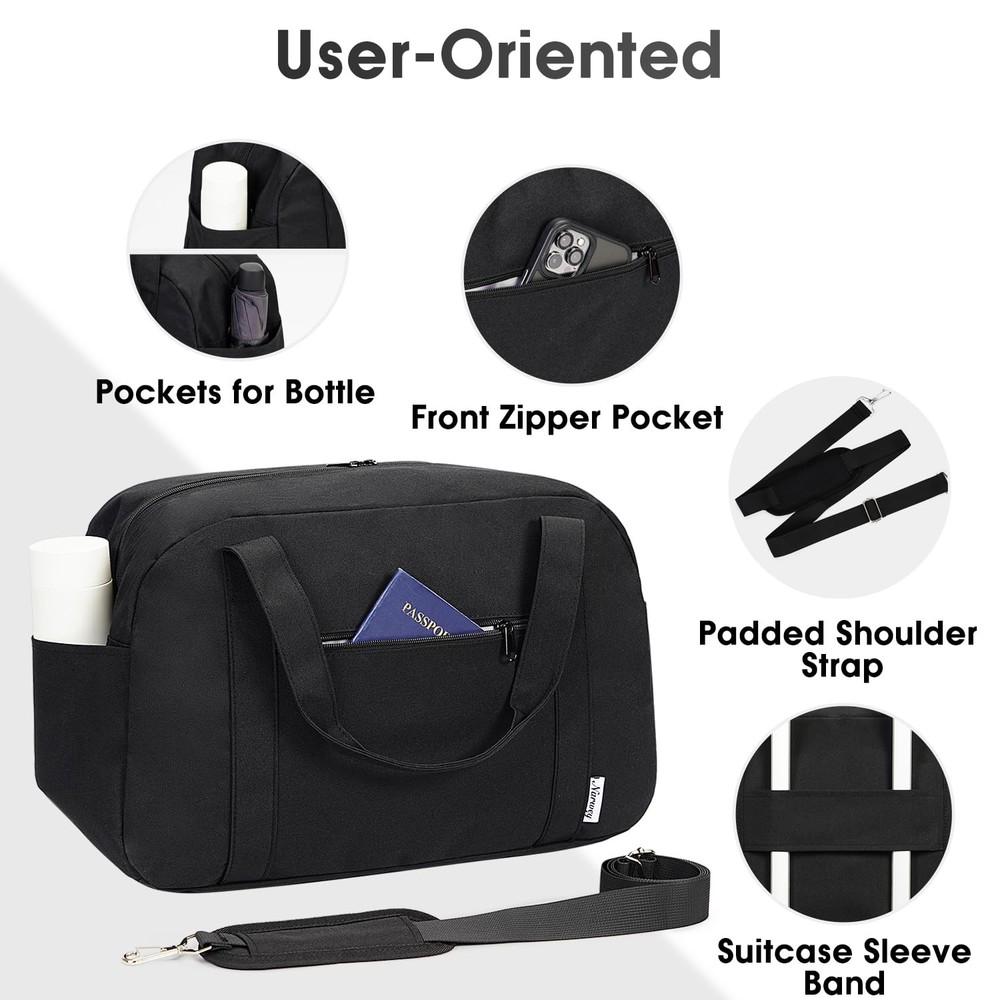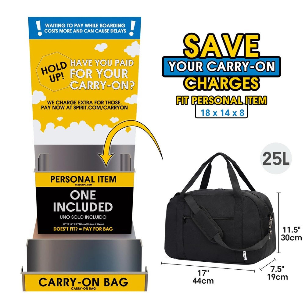 This airline-friendly travel bag, sized at 17x11.5x7.5 inches with a 25L capacity, is tailored to fit as a personal item under the seat in Spirit and Frontier Airlines without incurring carry-on fees. Its spacious main compartment can easily accommodate 3 to 4 days or a week's worth of clothing, while also serving as a practical small gym bag, complete with a waterproof-lined wet pocket for leaky items such as toiletries and towels. The bag is designed with convenience in mind, featuring detachable padded shoulder straps and a suitcase sleeve band for hands-free carrying, alongside water-resistant and sturdy fabric to protect your belongings from rain or damage. It includes multiple pockets for easy organization, including a front zippered pocket for quick access to essentials like tickets or passports, and three inner mesh pockets for keeping smaller items in order. This versatile weekender bag adapts seamlessly to various uses, making it perfect not only for air travel but also as a garment, hospital, sports, gym, yoga, overnight, camping, and picnic companion Airline-friendly Travel Bag. Bag size 17x11.5x7.5 inch (Capacity 25L) fits personal item size 18x14x8 of Spirit Airlines & Frontier Airlines, which can be placed under seat and no need to pay carry-on. 25L main compartment could accommodate all your travel items for 3 to 4 days or a week's worth of clothe Wet Dry Separated Small Gym Bag. Spacious enough for all your gym essentials yet compact enough to fit in a gym locker. Waterproof material lined wet pocket is ideal for storing wet or leaky items, such as toiletries and towels. Both sides feature pockets for water bottles and umbrellas Premium Weekender Bag. Go hands-free with adjustable and detachable padded shoulder strap and suitcase sleeve band. Sturdy and water resistant fabric avoid any rip and protect your gears well from rain or wet during trips. Convenient for a weekend get away Multiple Reasonable Pockets. Front zippered pocket allows quick access to frequently used items like tickets or passport. 3 inner mesh pockets could keep small items organized. No more scrambling - this bag keeps your essentials handy Multi-purpose Design. More than carry-on, it tackles a wide variety of situations. Ideal for garment bag, hospital bag, sports, gym use, yoga, travel, weekend shopping, overnight, camping and picnic