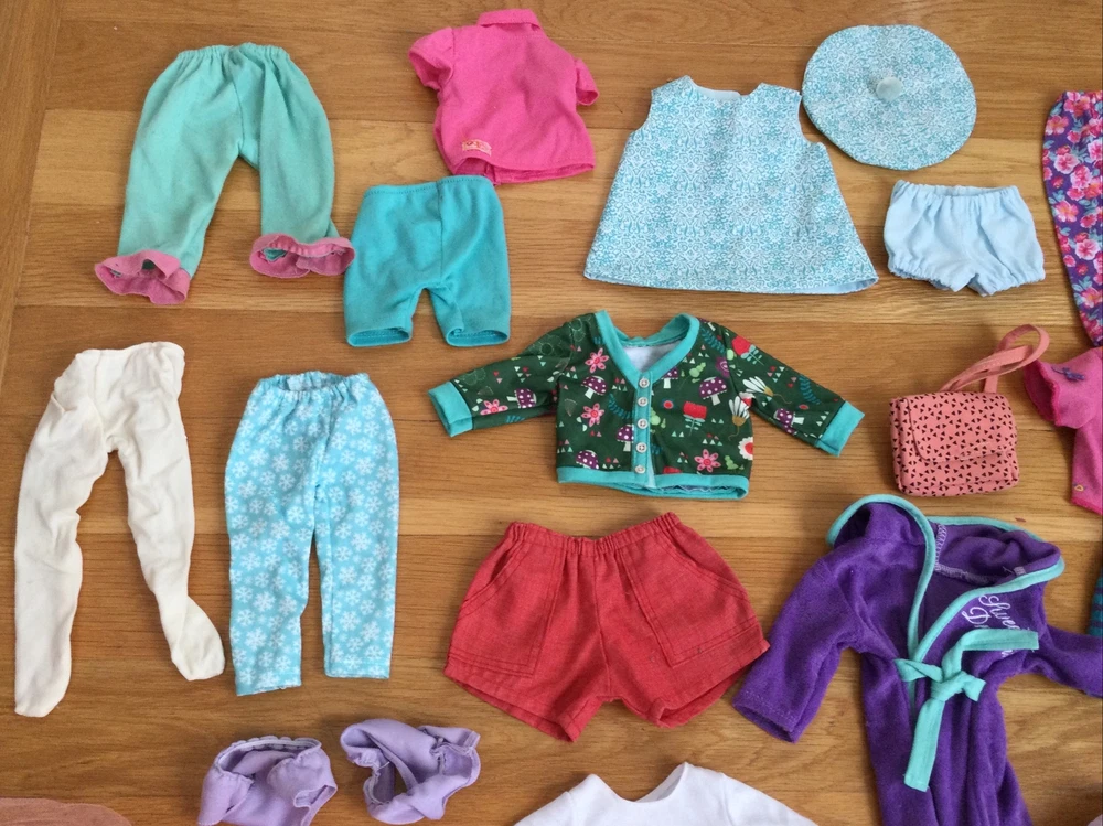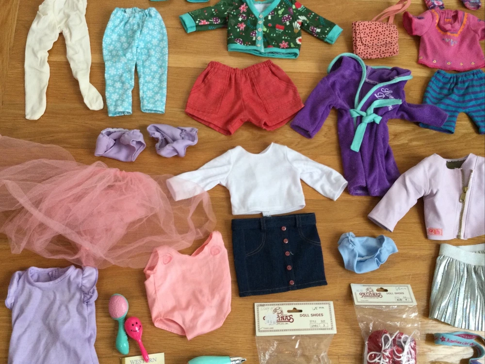 Doll Clothing and accessories lot: -Ballet Dance Leotard (OG) -Yellow Purse/ Bag -White and Teal Floral Dress w/ hat (Homemade) -Tutu -Red and White Shoes (Tallina’s) -Zippered Faux Leather Jacket/ Coat (OG) -Black and White shoes (Tallina’s) -Beige Top with Buttons (OG) -Bathrobe -Denim Skirt -MORE From a smoke-free and pet-free home. Freshly laundered! Mixed brands as noted above, some Unbranded. Some vintage. Clothing fits 18” American Girl/Battat OG dolls. Please see photos to supplement this description. Ruler indicates size. I am happy to combine shipping so please see my other listings (including LOTS of vintage and collectible items INCLUDING OTHER 18” DOLL/ AMERICAN GIRL DOLL LOTS THIS WEEK!). Thanks and good luck!!
