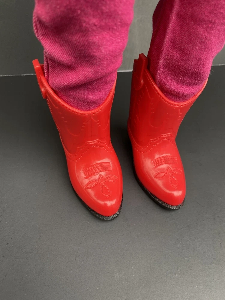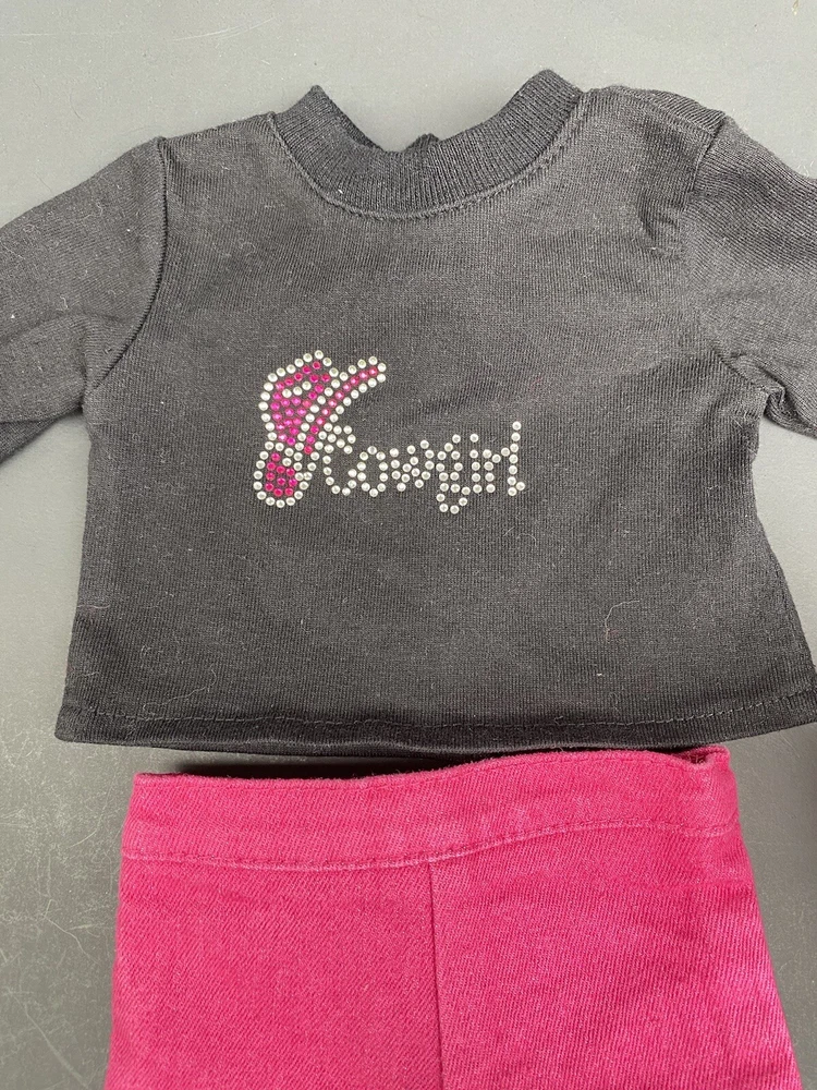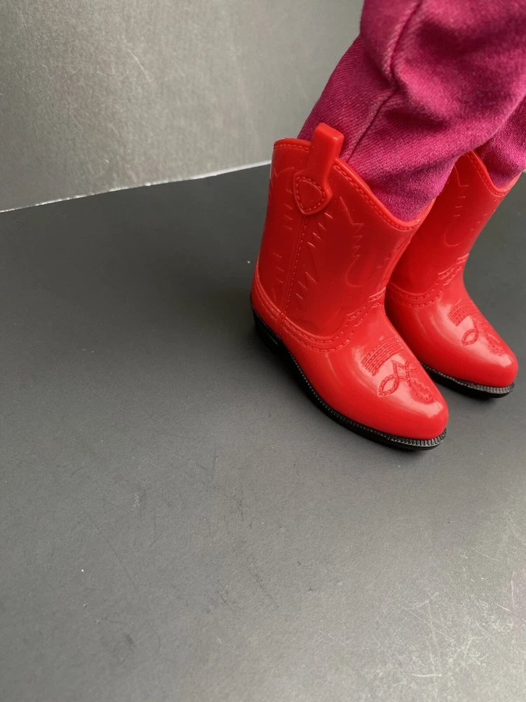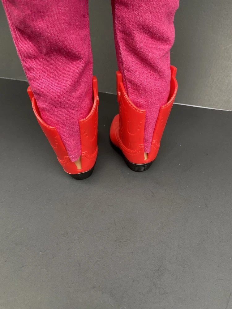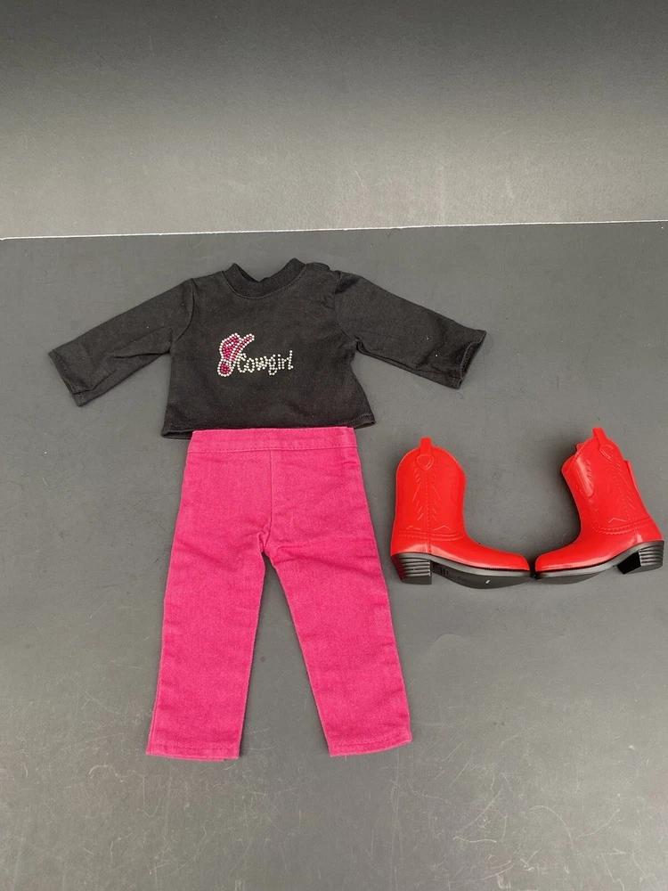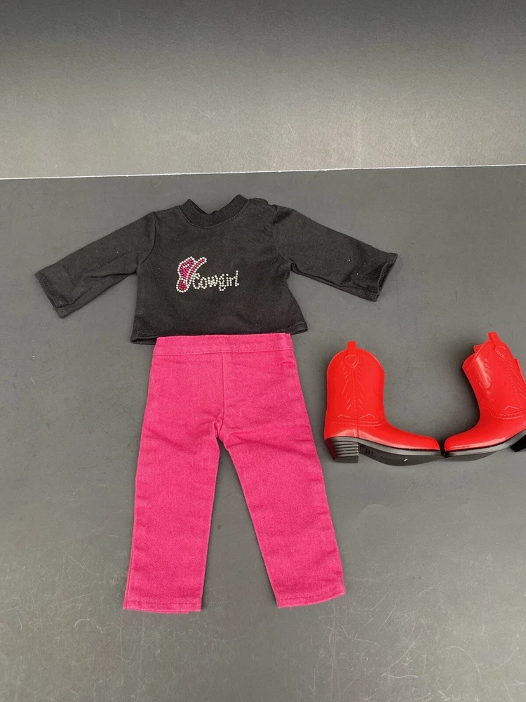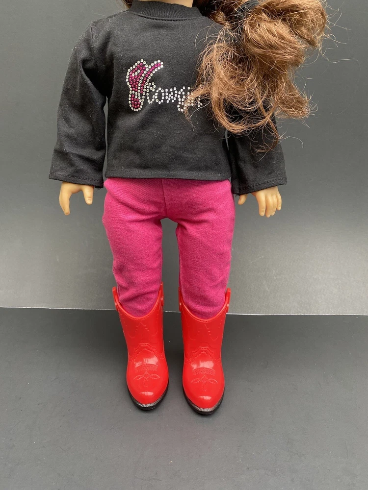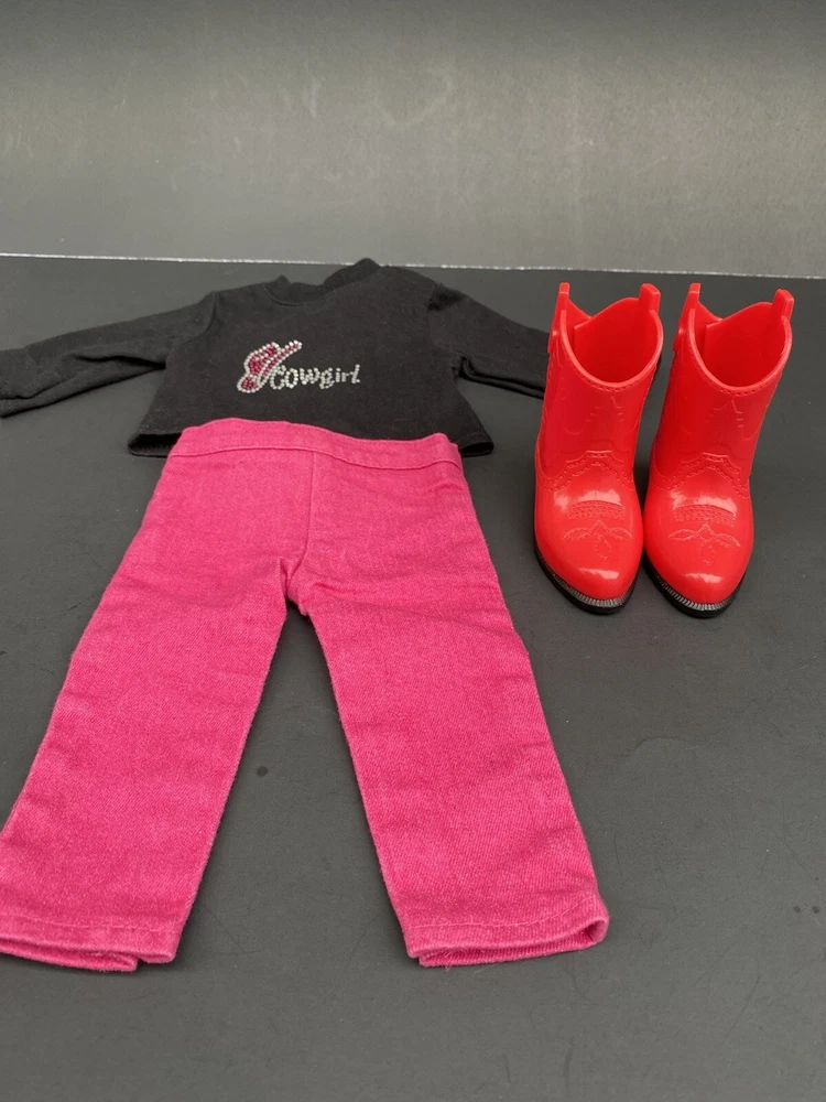 18 Inch Doll Clothes American Girl Our Generation Red Boots Pink Pants Cowgirl. Three piece outfit long sleeve shirt “Cowgirl” in rhinestones, stretched jeans and red cowgirl boots. Shirt and pants are unbranded. Funrise boots. Doll NOT included. Ships USPS ground shipping