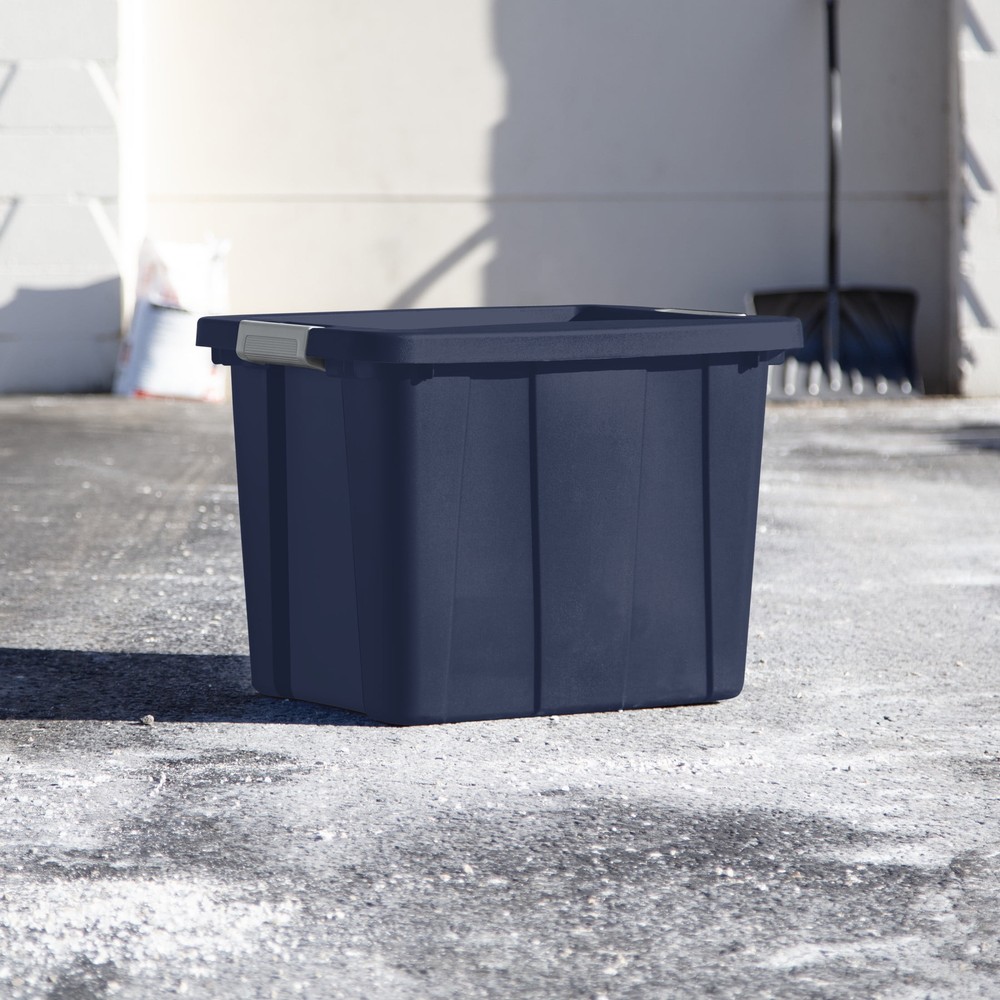 About this item 18 Gallon Latching Tote, Rugged Plastic Bin with Lid, Dark Blue Temperature and impact resistant, ideal for use in garage, attic or basement areas Latching Totes are a great storage solution for camping supplies, sporting equipment and seasonal items Heavy duty latches and contoured end panels create integrated handles for easier lifting Indexed lids offer secure stacking capabilities for efficient use of vertical space