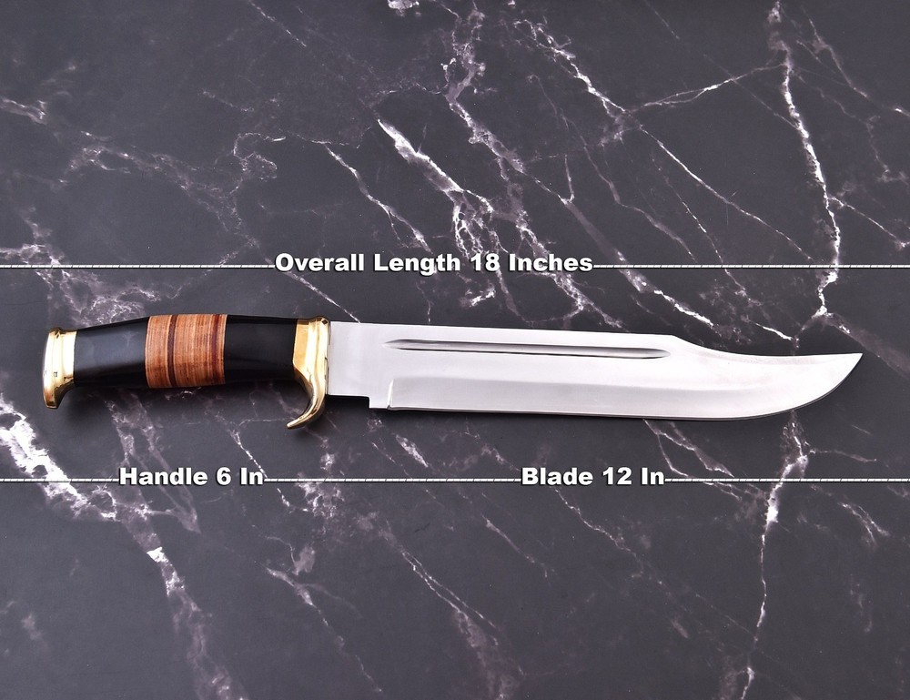 18" SHARD BLADE Handmade D2 Steel Hunting Crocodile Dundee Bowie Knife W/Sheath This is a catalog picture. You will receive the knife as shown in the picture but the blade patterns and handle material may vary slightly. Overall Length: 18.0” Inches Blade Length: 12.0”Inches Handle Length: 6.0”Inches Damascus Design: Twisted Patterns Layers: 512 Handle: Brass Guard & Bull Horn Handle Sheath: Leather Hardness: 50-55 HRC ''All of our knives are 100% hand crafted. True quality material used to form the blade. The handle materials, blade steels, and leather sheaths are made professionally with no expense spared. Great handle fitting, exception sharp edge, nicely balanced grasp'' Payment: Immediate payment is required and we accept PayPal ONLY. Please feel free to email us in case there is an expected delay or if you intend to combine payment with payments of other auctions ending soon. We will file for "Unpaid Item Claim" with eBay after 7 days if we don't hear from the buyer or the payment is not received. Shipping and Handling : We offer free shipping on all products Handling Time: All items are shipped within 48-72 hours of the receipt of payment (excluding weekends). Delivery Time: First Class (13 oz or less) 3-7 business days, Priority Mail 2-4 business days. Tracking Info: The buyer will receive the tracking number through email (if available). You can also track the shipment through "Order Details" section of the item within eBay. USPS updates tracking information every evening (if available). Our Guarantee: The products sold here are of very high quality and we guarantee your complete satisfaction. To maintain high quality, each knife goes through a rigorous Quality Assurance process. We also check each knife before shipment and ensure that our customer receive the finest quality knife. In case there is a problem with the knife/shipment, please feel free to contact the seller. We value your timely payments. That's why we will leave you positive feedback immediately after the item is shipped. We expect buyers to leave positive feedback once the item is received. If the buyer is happy with the item and process, we expect 5-Star Rating in all categories. Legal Disclaimer: By bidding on this item, you certify that you are over the age of 18 and legally responsible for the purchase and use of the item. The seller will not be responsible for any illegal purchase or use of the product.