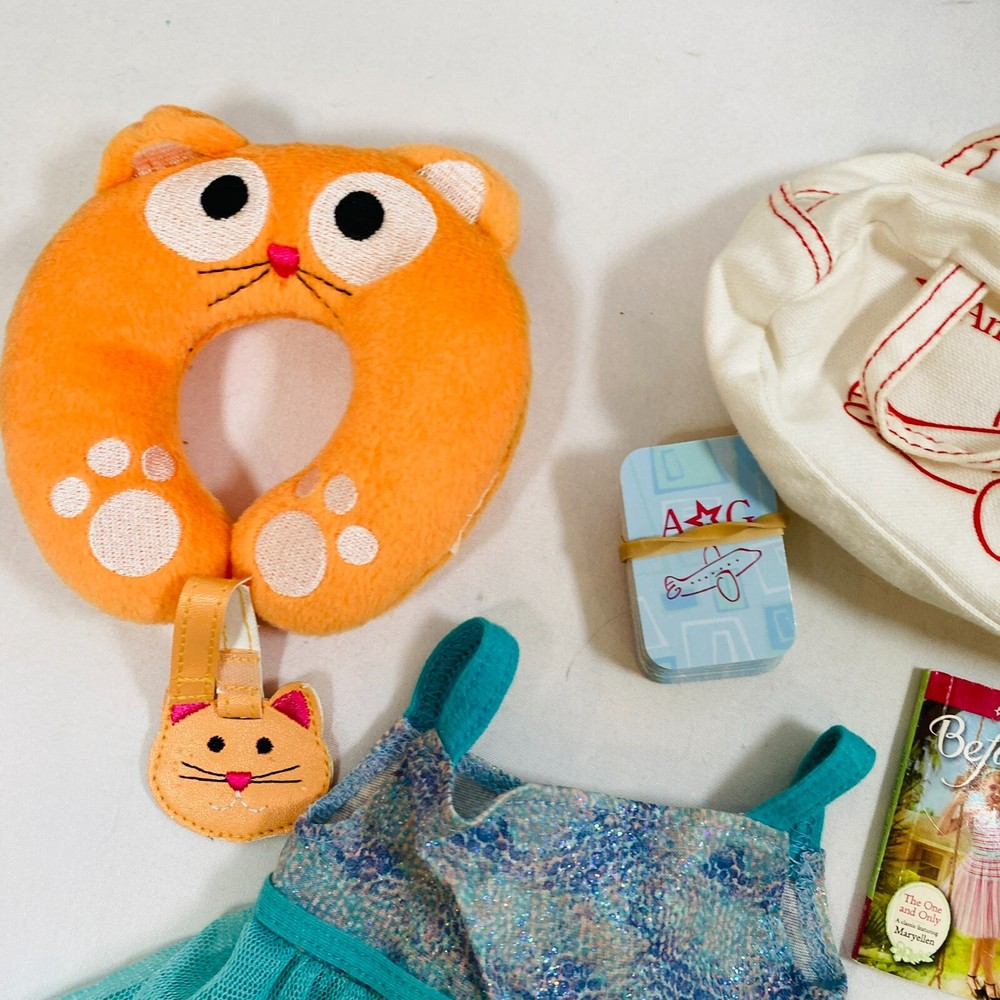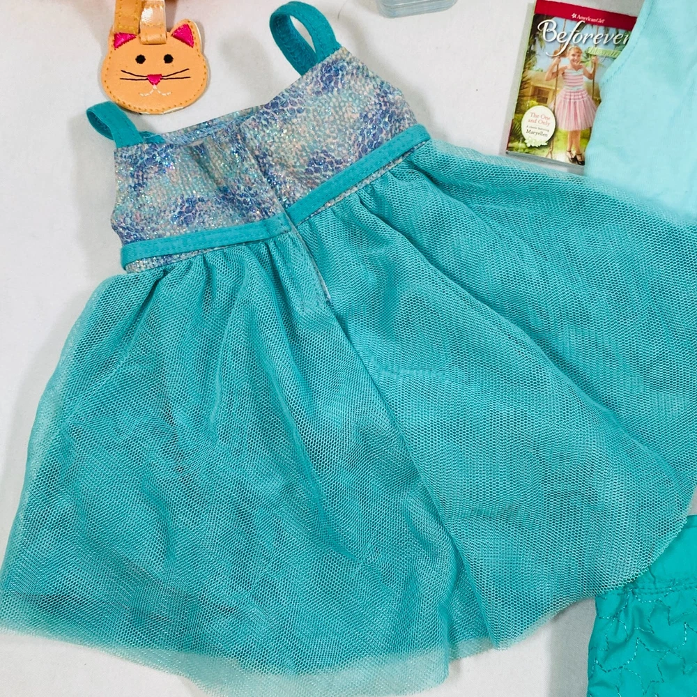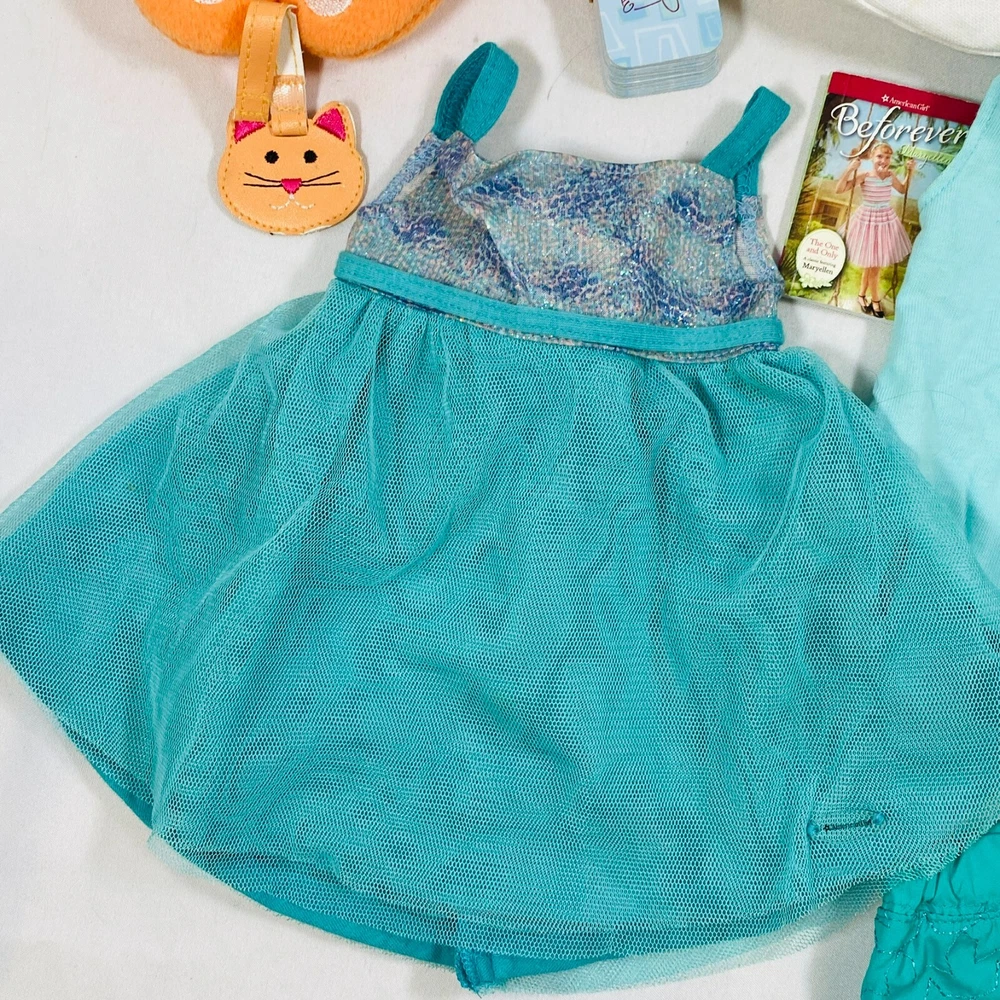 18" American Girl Doll Truly Me Mix & Match Set. Includes 2018 Blue Sea Dress, Side-Cinch Tank, Star Quilt Skirt, Travel Bag w/ Playing Cards & Hair Accessories, & OG Neck Pillow. In excellent condition, no flaws noted. Please see all pictures for exact cosmetic condition and other details, and ask any questions before purchasing. We are a husband and wife team with a growing family, and greatly appreciate your support of our small business. Please browse our eBay store for a variety of other American Girl items. We hope you enjoy this set!