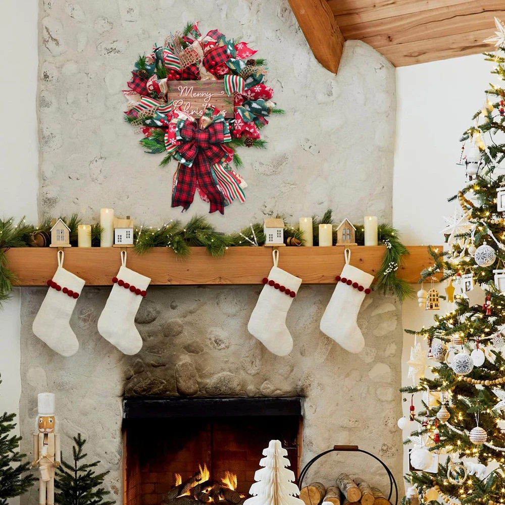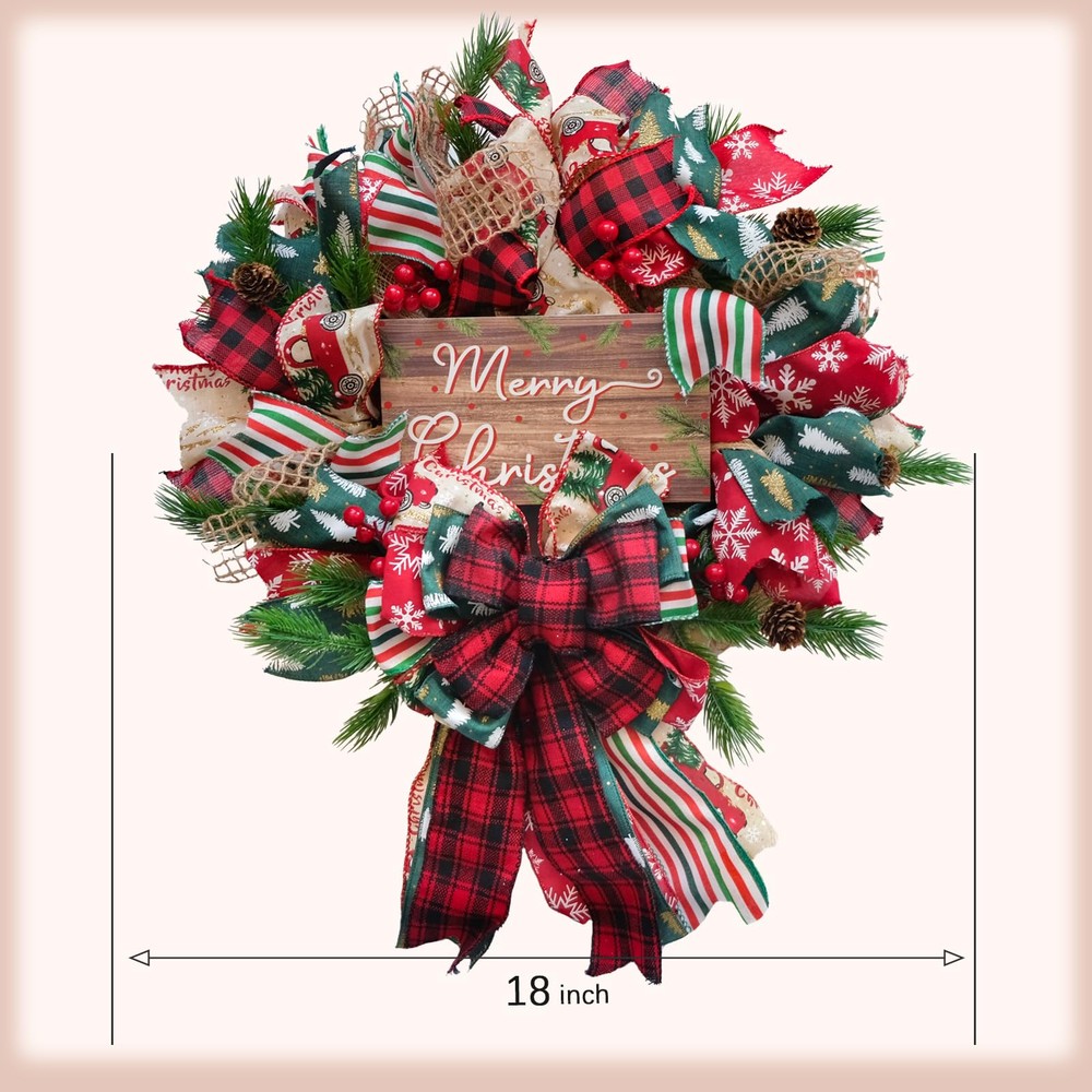 18 Inch Christmas Mesh Wreath for Front Door with Red Green Ribbon Bow Holiday Decor