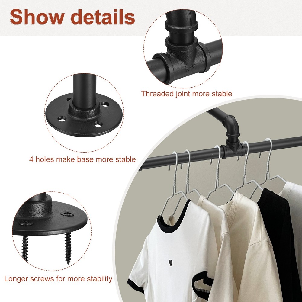 Document QUALITY MATERIAL - The industrial pipe wall-mounted clothing rack is made of sturdy iron, sturdy and durable, straight, and not easy to bend. The matte black painting surface can enhance corrosion protection and avoid rust accumulation for long-term use. Our clothes rack can let your room get rid of the mess, and make your living room look clean and tidy.SPACE-SAVING HELPER - The wall clothing rack can hold enough clothes to organize and display your daily clothes or seasonal outfits, keeping your garments organized and tidy without wrinkle. Add extra hanging space for a clothing retail store, cloth boutique, and dance room. This clothing rack creates extra storage space and increases the efficiency of space utilization.EASY TO ASSEMBLE - All accessories of a wall-mounted clothes rack and detailed installation instructions are contained. It's easy to install and holds lots of clothes and has the amount of space between the clothes hanger and the wall. All parts are detachable, be sure to screw them tight then mount them to the wall.MULTI-PURPOSE - The wall mount clothes rack can be widely used in bedroom, bathrooms, kitchens, garages, balcony, closets, and also boutique and clothing stores. Hanging clothes racks also can be used to display necklaces, scarves, or caps in retail settings. 18 Inch Industrial Pipe Clothes Racks, 2 Sets Wall Mounted Garment Clothing Rack QUALITY MATERIAL - The industrial pipe wall-mounted clothing rack is made of sturdy iron, sturdy and durable, straight, and not easy to bend. The matte black painting surface can enhance corrosion protection and avoid rust accumulation for long-term use. Our clothes rack can let your room get rid of the mess, and make your living room look clean and tidy. SPACE-SAVING HELPER - The wall clothing rack can hold enough clothes to organize and display your daily clothes or seasonal outfits, keeping your garments organized and tidy without wrinkle. Add extra hanging space for a clothing retail store, cloth boutique, and dance room. This clothing rack creates extra storage space and increases the efficiency of space utilization. EASY TO ASSEMBLE - All accessories of a wall-mounted clothes rack and detailed installation instructions are contained. It's easy to install and holds lots of clothes and has the amount of space between the clothes hanger and the wall. All parts are detachable, be sure to screw them tight then mount them to the wall. MULTI-PURPOSE - The wall mount clothes rack can be widely used in bedroom, bathrooms, kitchens, garages, balcony, closets, and also boutique and clothing stores. Hanging clothes racks also can be used to display necklaces, scarves, or caps in retail settings. Hot Item Payment 1.We accept eBay payment . 2.Payment must be received within 7 business days of auction closing. Shipping 1.We ship to your eBay or Paypal address. Please make sure your eBay and Paypal address is correct before you pay. 2.Items will be shipped within 1-3 business day when we received payment. 3.Delivery time depends on destination and other factors. Description Policy 18 Inch Industrial Pipe Clothes Racks, 2 Sets Wall Mounted Garment Clothing Rack QUALITY MATERIAL - The industrial pipe wall-mounted clothing rack is made of sturdy iron, sturdy and durable, straight, and not easy to bend. The matte black painting surface can enhance corrosion protection and avoid rust accumulation for long-term use. Our clothes rack can let your room get rid of the mess, and make your living room look clean and tidy. SPACE-SAVING HELPER - The wall clothing rack can hold enough clothes to organize and display your daily clothes or seasonal outfits, keeping your garments organized and tidy without wrinkle. Add extra hanging space for a clothing retail store, cloth boutique, and dance room. This clothing rack creates extra storage space and increases the efficiency of space utilization. EASY TO ASSEMBLE - All accessories of a wall-mounted clothes rack and detailed installation instructions are contained. It's easy to install and holds lots of clothes and has the amount of space between the clothes hanger and the wall. All parts are detachable, be sure to screw them tight then mount them to the wall. MULTI-PURPOSE - The wall mount clothes rack can be widely used in bedroom, bathrooms, kitchens, garages, balcony, closets, and also boutique and clothing stores. Hanging clothes racks also can be used to display necklaces, scarves, or caps in retail settings. Hot Item Payment 1.We accept eBay payment . 2.Payment must be received within 7 business days of auction closing. Shipping 1.We ship to your eBay or Paypal address. Please make sure your eBay and Paypal address is correct before you pay. 2.Items will be shipped within 1-3 business day when we received payment. 3.Delivery time depends on destination and other factors.