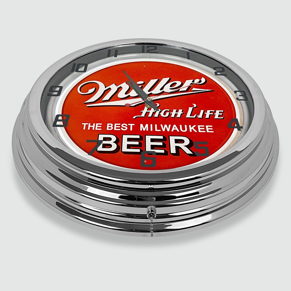 *Product is officially licensed. *Licensing information is printed on front or back of sign. *Image of licensed holographic logo or serialized QR code is in pictures. 18" Miler High Life The Best Milwaukee Beer Metal Sign Designed White Neon Clock - SIGNBOX-QLN720284 2.5" Inch Thick Triple Outer Bevel White Neon Handmade Ships from a Small Business in Ohio Materials: Metal, Steel Width: 17.25 inches Height: 17.25 inches Depth: 2.50 inches