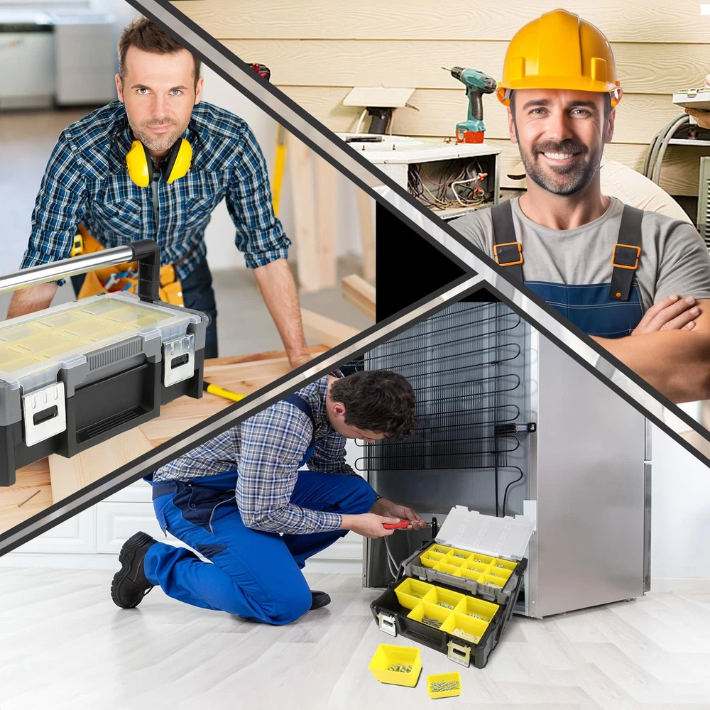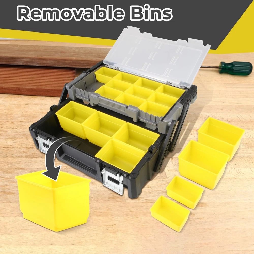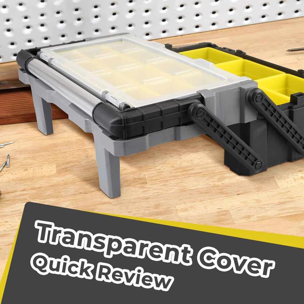 CANTILEVER JOINTS: Smooth gliding cantilever joints for raising and lowering the top tray DURABLE CONSTRUCTION: Water-proof polypropylene construction, heavy duty aluminium handle and metal latches REMOVABLE BINS: Includes 2 sizes of removable bins 6 deep & 12 standard, perfect for organization and storage for Hardware, Assorted Nails, Dowels, Washers, Screws, Nuts and Bolts CONVENIENT DESIGN: Back support legs provide extra support and keep the tool box stable. Transparent cover for quick view of eveything in the top tray DIMENSIONS: 18.0 in. W x 9.4 in. D x 5.7 in. H