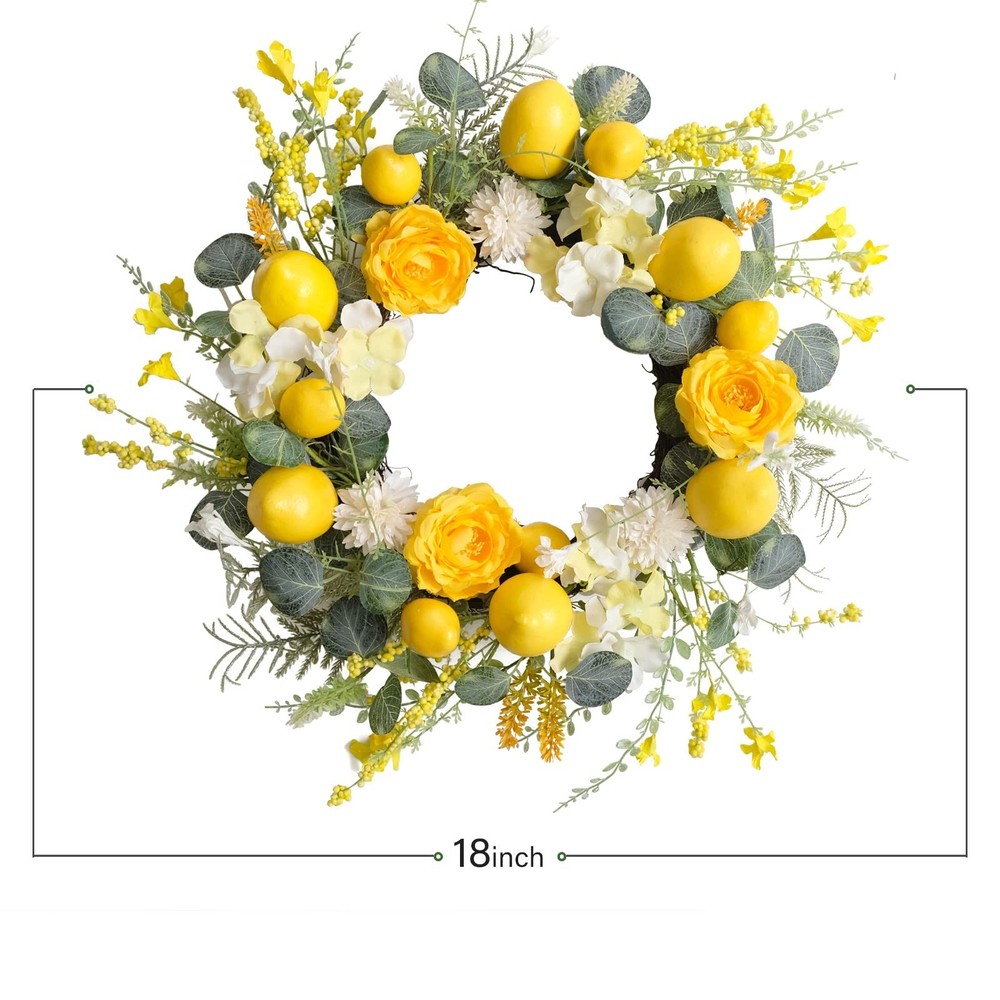 18 Inch Summer Yellow Lemon Roses Wreath for Front Door, Eucalyptus Leaves with Hydrangea Forsythia Flowers Wreath for Indoor and Outdoor, Rustic Farmhouse Door for Home Decor Product Details Color: Yellow Brand: Floribus Material: Artificial Flowers, Foliage, Plastic/Wire Base Shape: Round Item Weight: 0.8 Kilograms Product Dimensions: 4"D x 18"W x 18"H Manufacturer: Floribus Color: Yellow Brand: Floribus Material: Artificial Flowers, Foliage, Plastic/Wire Base Shape: Round Item Weight: 0.8 Kilograms Product Dimensions: 4"D x 18"W x 18"H Manufacturer: Floribus Item Weight: 1.76 pounds Item model number: 2414 Date First Available: November 14, 2024 [Summer Yellow Lemon Door Wreath] Summer is wet and hot, some fresh and cool decorations will add some points for your live place, summer yellow lemon wreath will be a good choice for your doors, the fresh yellow color and the fresh lemon together with well opening yellow roses, this summer will be beautiful and fresh. [18 Inch Front Door Wreath] The outer diameter of this summer lemon wreath measures 18 Inch, this size wreath has a really wide use, such as hanging on your front door, porch door, hanging on your yards to appeal to the season atmosphere, hanging on wall, windows and your home enter place. [Yellow Roses Forsythia Flower Wreath] To appeal to the fresh yellow color, we add two different yellow artificial flowers, one is the romantic yellow roses with ninety percent opening, and the other one is the cute forsythia flowers. [Eucalyptus Leaves Flowers Wreath] The leaves selected for this wreath is extremely strict, we passed some common leaves and we finally selected this cute dollar eucalyptus leaves for this wreath, because the shape of the leave is round and color is fresh and real. [TIPS] 1.Fluff the wreath up before hanging on. 2.This lemon wreath is recommended indoor use, if use outside, please avoid directly exposed to the strong sunlight to protect the wreath.