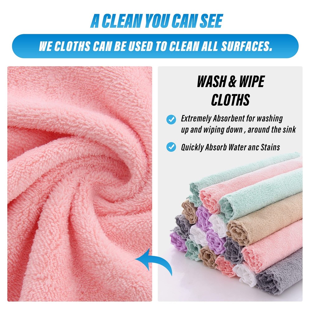 Does Not Shed Fluff - High Quality Coral Fleece Machine Washable & Reusable Cut down your spending on paper towels and reduce your carbon footprint. Dish cloths can be reused up to 50x times. Just toss them in the washer or place them on the top rack of your dishwasher. Does Not Shed Fluff - High Quality Coral Fleece SIZE:10 x 10'' QUALITY COUNTS - Dish cloths have a looped outer weave that gives them high absorption and scrubbing power, while the tight under-weave supports the integrity of the fabric, adding to its strength and durability. Coral fleece fabric is naturally sustainable and soft to the touch. No Odor - Get tough on dirt with a dish cloth. Each sewn edge of the cloth is finished with durable and colorful piping to prevent fraying or ripping during use. At 10 x 10'', our dish cloths fit comfortably in your hand without folding or wadding up when itÍs time to do the dishes, clean appliances, or wipe down counters. They are a great size for storage around the sink, too. These quick-drying, easy-to-clean and odorless kitchen wipes, are a perfect sponge replacement! WHOLESALE PRICING - Washable, reusable, durable, and sanitary, Coral fleece dish cloths last a long time when compared with cotton dish rags, cellulose dishcloths and sponges. You can expect long-lasting productivity from these dish cloths that wonÍt fall apart or smell too bad to keep. Each package contains 18 cloths. EASY-CLEANING CLOTHS - Keep these dish cloths sanitary and smelling fresh with a regular laundry routine.