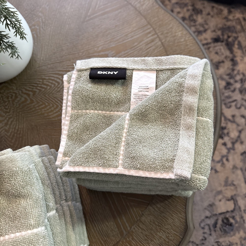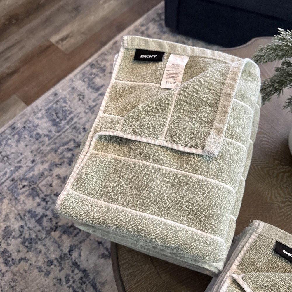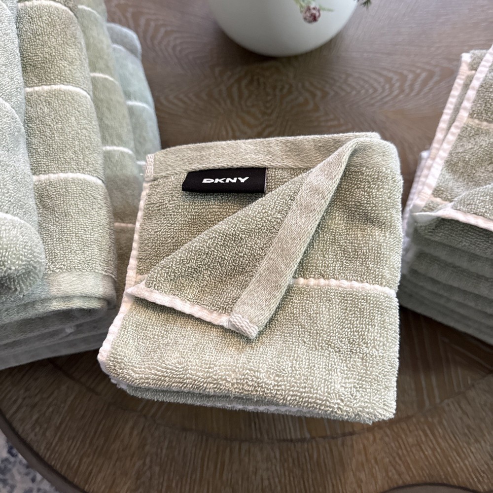 DNKY 18 Piece Towel Set Green White Stripe - (4) Bath Towels - 34 in x 64 in (4) Hand Towels - 16 in x 28 in (10) Face / Wash Cloths - 13 in x 13 in 100% Cotton Stored in Smoke Free, Clean Environment Only reason for selling is changing decor, these were used mainly as decor and some were used a handful of times. These have been washed and are ready for their new home!