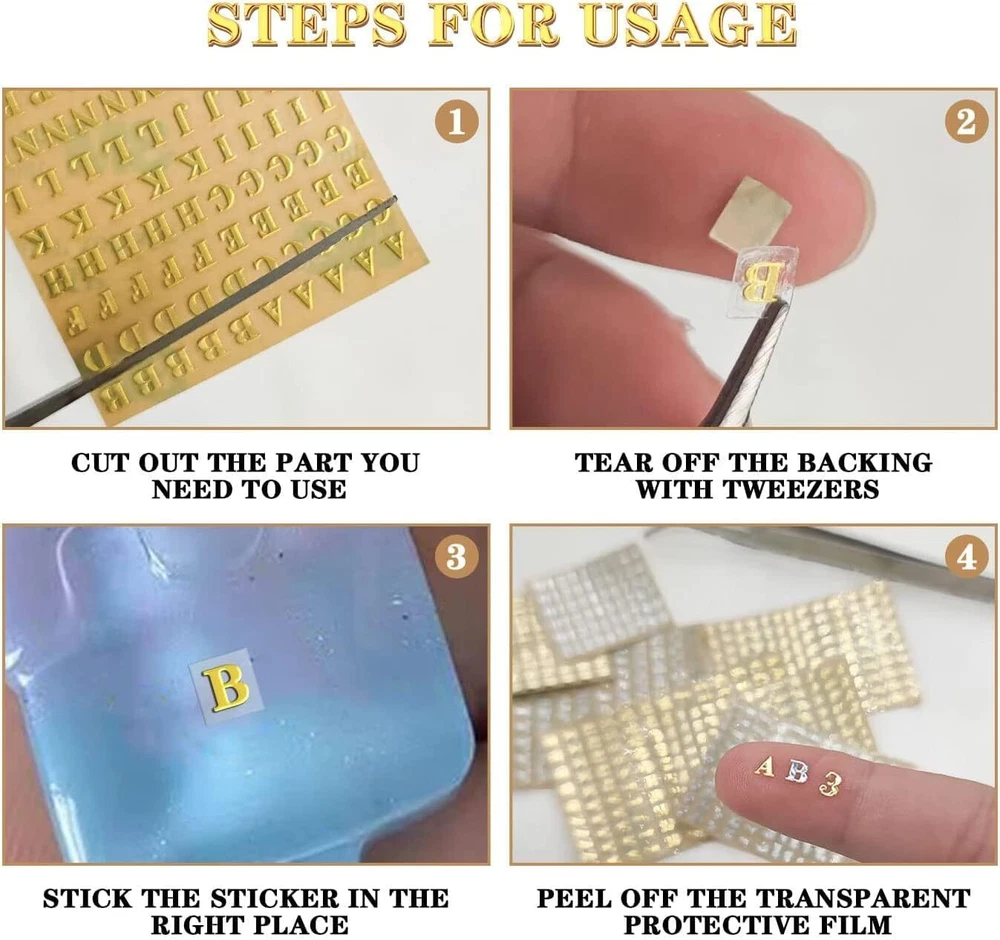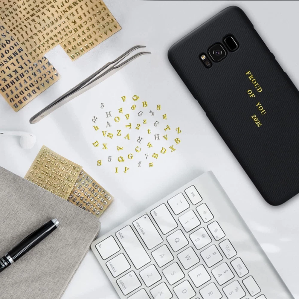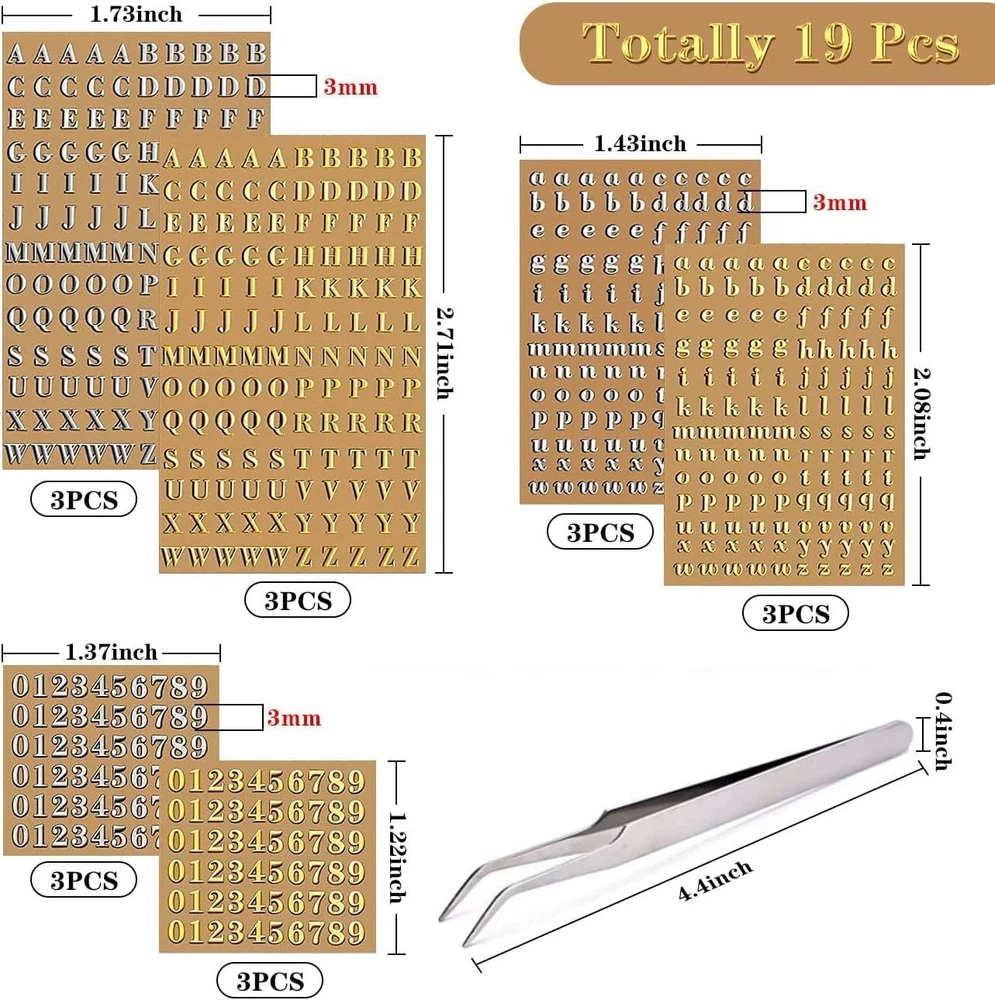 【What You Will Get】You will receive total of 18 sheets mini glitter letters number stickers and 1 tweezers.All gold and silver epoxy stickers sizes of high are 3mm/0.12inch,9 sheets of each color,including 3 sheets uppercase letters,3 sheets lowercase letters and 3 sheets number stickers.Sufficient quantity and style can meet your different needs.You can also share with your good friends and enjoy the fun of DIY activities together. 【Tiny Metal Stickers Resin Craft Supplies】Letter stickers very small,so they are perfect for resin crafts and dog name brand resin molds.Use your creativity to design your unique special resin jewelry.These shiny 3D alloy small letters numbers stickers can make your pet dog tags more sophisticated and personal.You can paste names,age or house number on the resin pieces. 【Glitter Alloy Mini Letter Stickers】Alphabet number letters stickers for resin art is made of high-quality copper-nickel,small and light,full of strong metal shiny effect and 3D three-dimensional.Waterproof,strong and tear-resistant,gold letter stickers beautifully cut easy to peel and stick,not easy to fade or fall off,can be stored for long time.The surface of the tiny silver letter stickers is smooth and burr-free,no need to worry about scratching your fingers. 【Thoughtfully Prepared】Metallic resin letter number stickers is self-adhesive easy to use.You just need cut out the part of letters or numbers you want to paste,tear off the backing paper and use we provide tweezers to stick it firmly where you need,and finally tear off the protective film and you're done.You can DIY many works as you want,small letter stickers is great option for scrapbooking crafts and home decor. 【DIY Combinations Widely Applicable】Gold/Silver scrapbook stickers can make meaningful sentences by combining uppercase letters,lowercase letters and numbers.Such merry christmas,happy birthday,thank you,etc.Suitable for epoxy casting crafts,nail art decoration,gift box packaging,home decoration,DIY scrapbooking,card making.Mini letter number stickers also stick to many smooth surfaces such as cell phones,laptops,helmets,cups and more,make them different. Product Description 18 Sheets Mini Glitter Letters Number Stickers Glittering number and letter stickers are not only beautiful and stylish,sufficient quantity can help you freely combine into sentences,people's names or house numbers. Glitter Alloy Mini Letter Stickers Letter stickers very small,so they are perfect for resin crafts and dog name brand resin molds. Intimate Match Since the equipped tweezers are brand new,please gently break them apart and combine them a few times before use for better use. DIY Combinations Widely Applicable Let your imagination run wild and use our sticker letters to choose and mix at will to create a special logo or text to express your unique ideas.