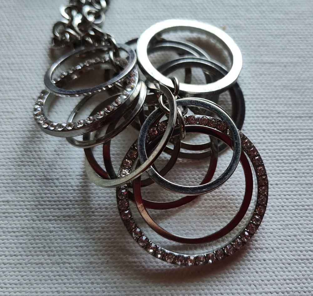 This beautiful silver necklace is a must-have for any jewelry collection. The necklace is 18 inches long and features multiple rings, adding a unique touch to the piece.