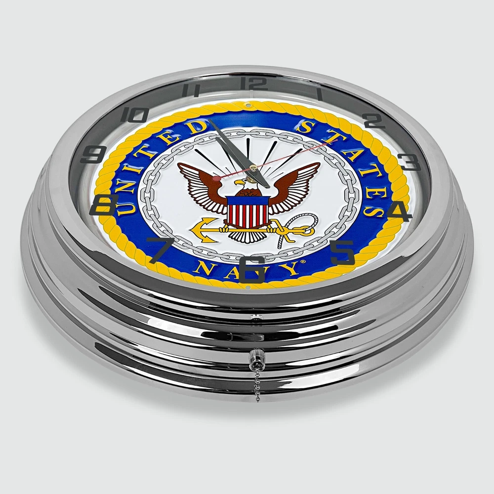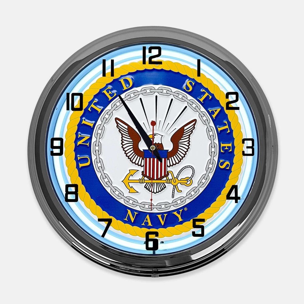 *Product is officially licensed. *Licensing information is printed on front or back of sign. *Image of licensed holographic logo or serialized QR code is in pictures. 18" United States Navy Metal Sign Designed White Neon Clock - SIGNBOX-QLN720317 2.5" Inch Thick Triple Outer Bevel White Neon Handmade Ships from a Small Business in Ohio Materials: Metal, Steel Width: 17.25 inches Height: 17.25 inches Depth: 2.50 inches
