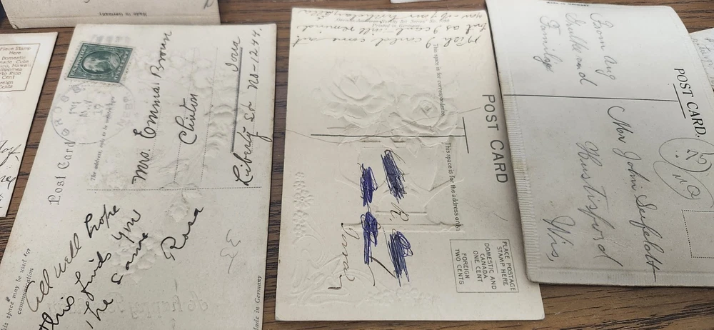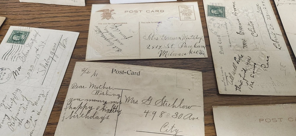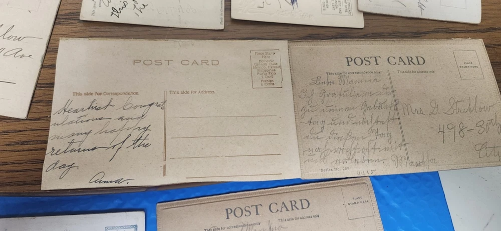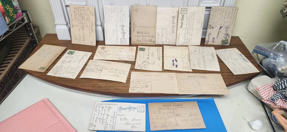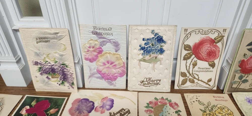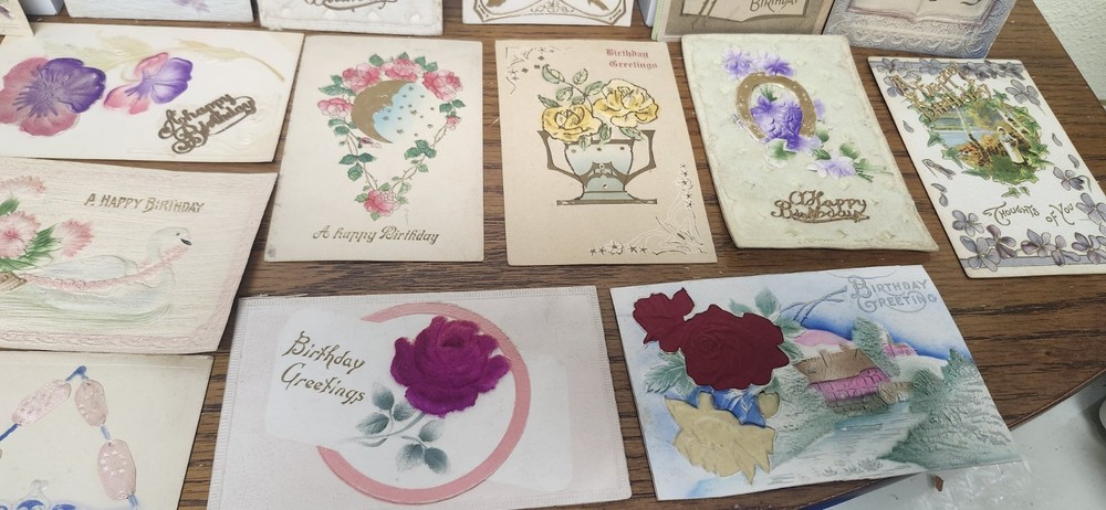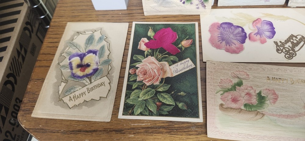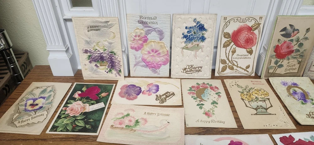 This product is a set of 18 vintage postcards from the early 1900s, perfect for celebrating a birthday. Each postcard is an original piece from the specified time period, adding a unique touch to any collection or correspondence. These postcards offer a glimpse into the past and can serve as a charming and nostalgic way to send birthday wishes to a loved one. Please examine photos they are part of description. One is stamped with a vintage green stamp