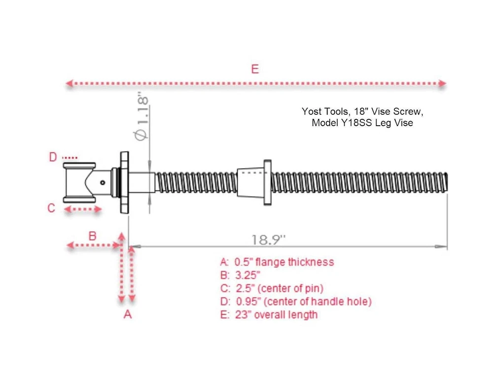 18" Woodworking Bench Screw Leg Vise Wood Holding Tool Workbench Press Clamp New DIY VISE SCREW: The Y18SS Vise Screw is the perfect tool if you like making your own customized bench vise. Has an 18-inch solid steel main screw that gives you a wide range of jaw openings and a tough cast iron body construction. TECHNICAL SPECS: 1.18" L (2.99 cm) x 18.9” (48 cm) Long Solid Steel Bench Screw, Pitch: 0.33" (.83 cm), Threads / 3" (7.26 cm), Thread type: Acme. BEST USE: Ideal for creating your own wood vise. Gives the flexibility of choosing the jaw width that you want you use for your DIY vise. QUALITY: Every tool that bears is engineered to have high standards of quality, strength, and durability that will last over the years to come. We value quality before quantity making our products perform as it intended to be with ease and safety. With a lifetime tech support to back our quality guarantee. SAFETY INFORMATION: Misuse of vises can cause severe injury to your eyes, hands and or other body parts. Vises must be set up and used properly. Before setup and use, read, understand, and follow all instructions outlined in the manual.