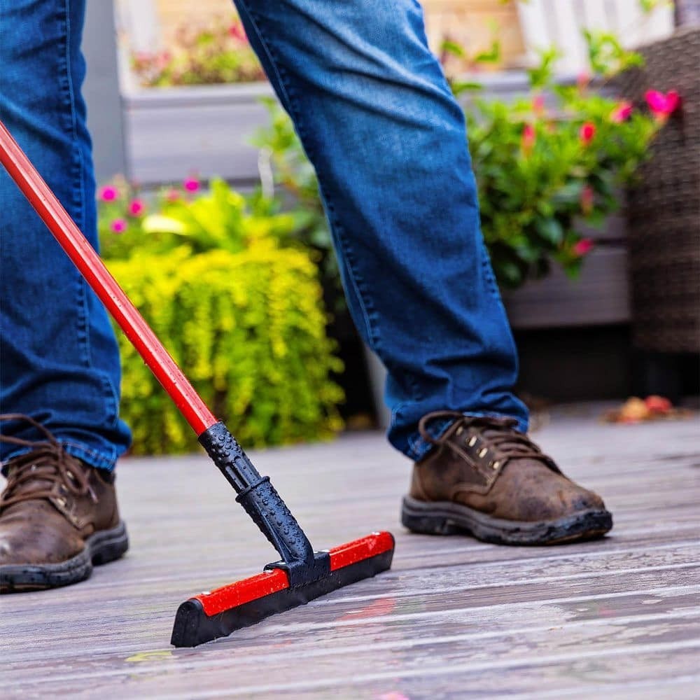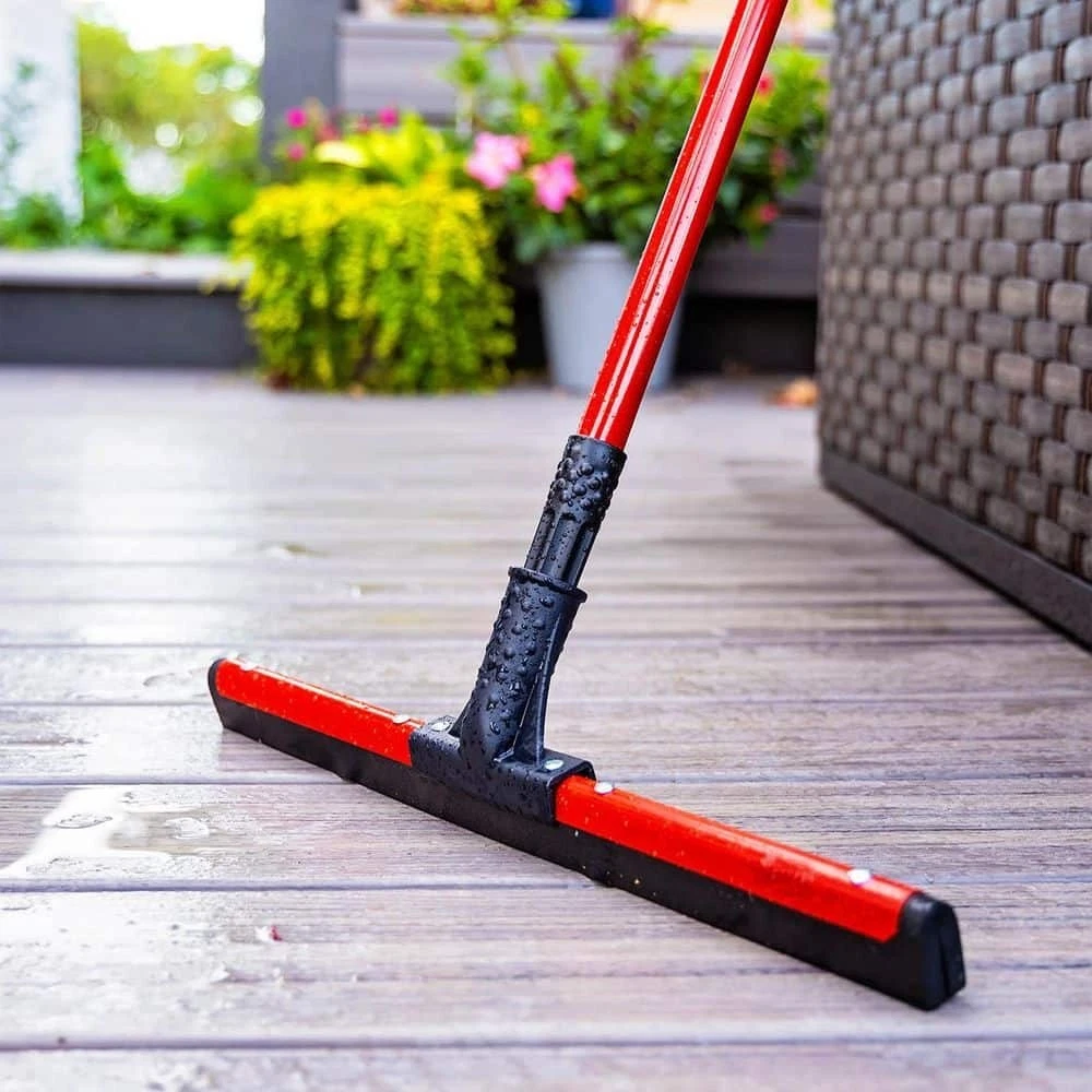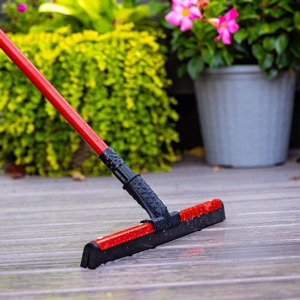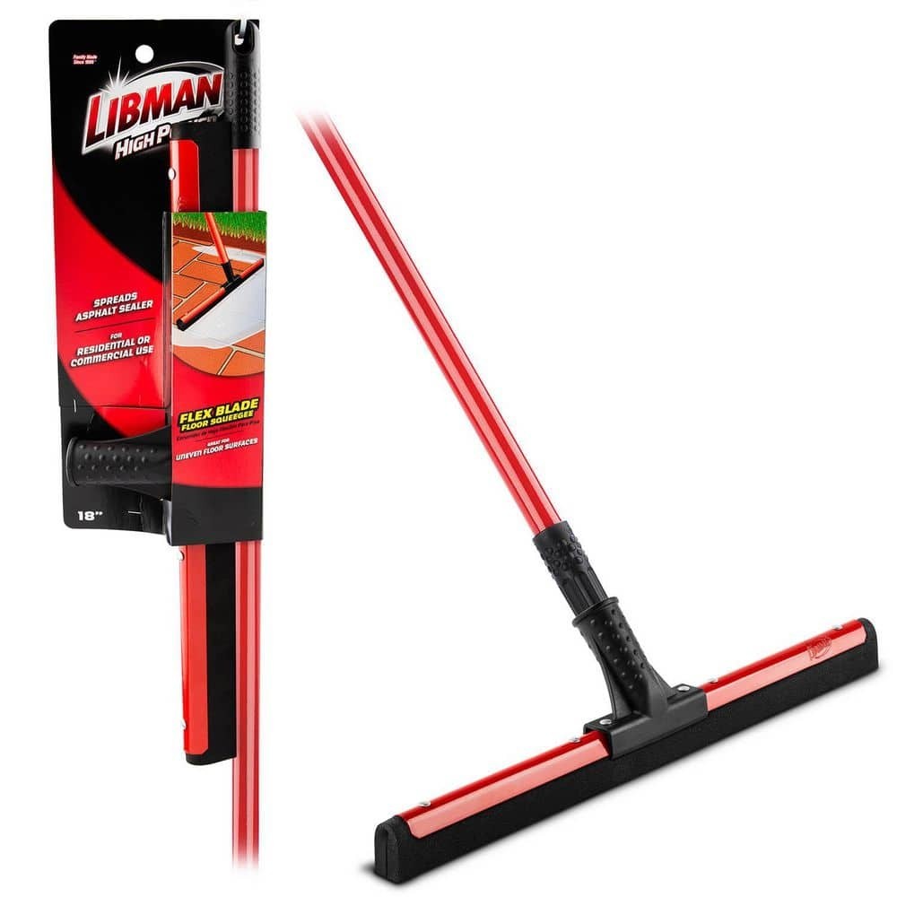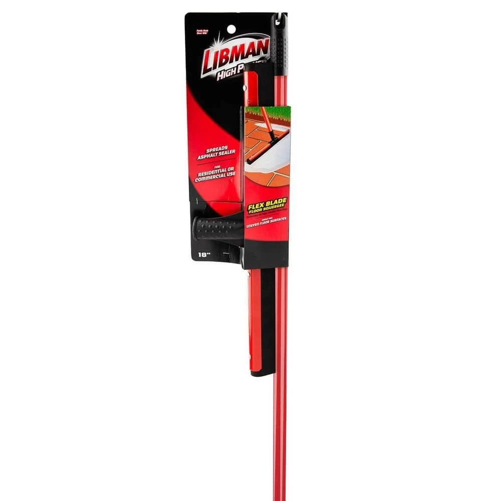 18 in. Flex Foam Blade Floor Squeegee with 52 Handle Steel Straight Durable New This dual flex blade floor squeegee from Libman works great on any surface, but is particularly effective on uneven surfaces such as tile. The flexible moss foam double blade does a great job of getting into the lines, cracks and textures of various floor surface types. The flexible rubber is mounted perfectly straight to remove water from uneven and rough surfaces. Ideal for removing water, chemicals, melting ice/snow and mud. 18 in. W black, closed-cell foam rubber blade Strong handle to head connection point 52 in. L steel handle, connected with standard thread Rivet set to hold squeegee onto the handle neck Great tool to have in your garage, on the jobsite or in foodservice and hospitality environments Handle grip with hanger hole for convenient storage Electrostatic coated handle paint will not chip even if handle gets dinged Style of floor squeegee blade will leave floors dryer faster than other blade types Steel squeegee blade frame is also painted red to prevent rust and corrosion