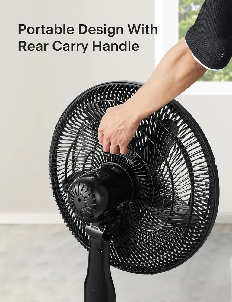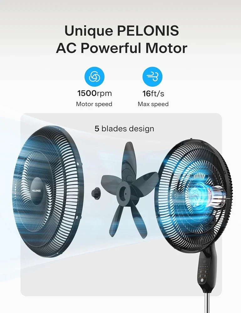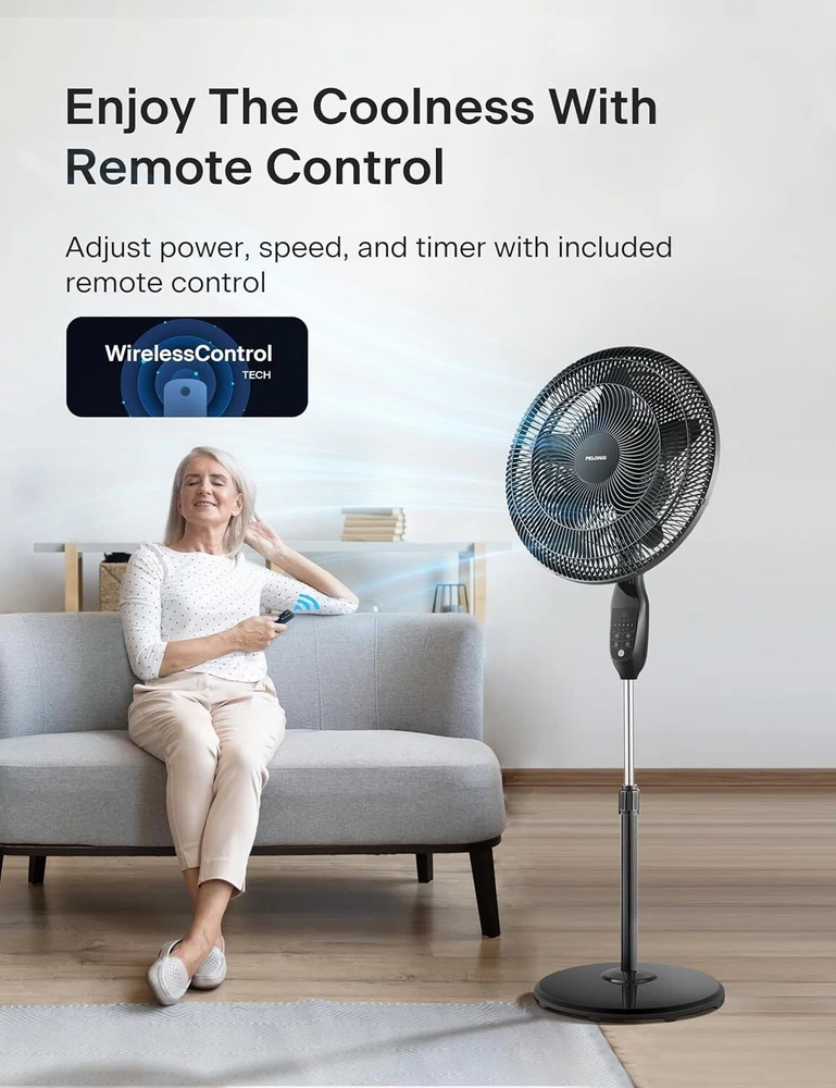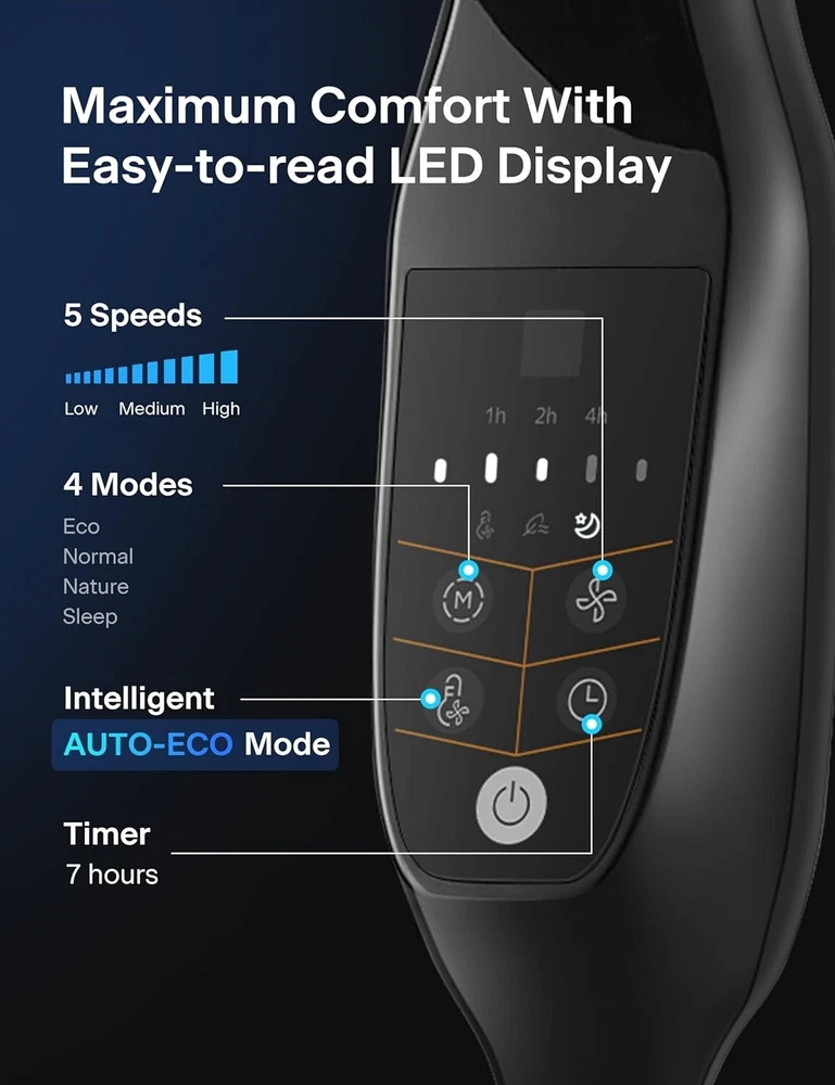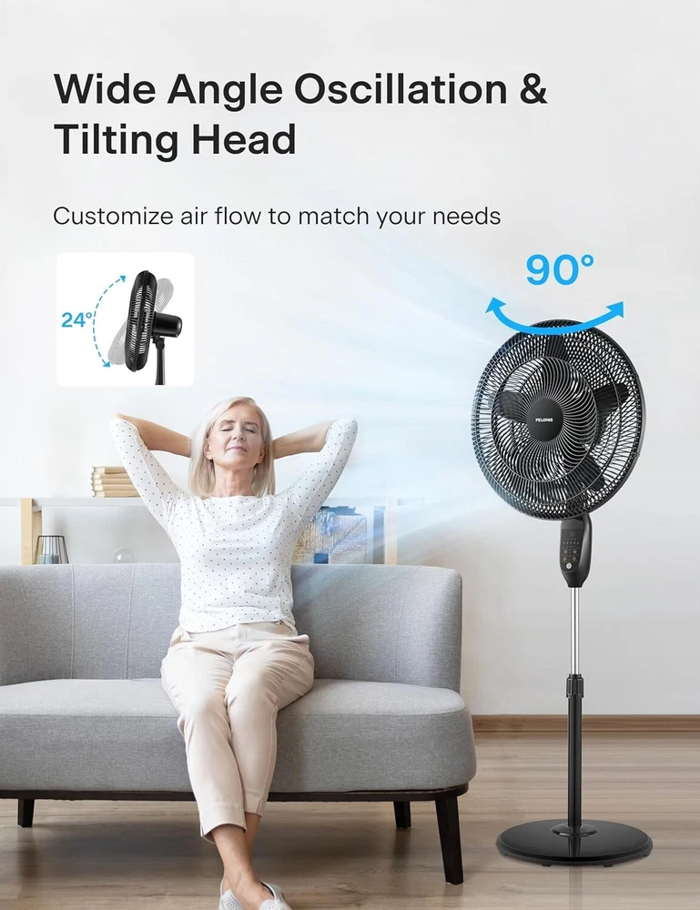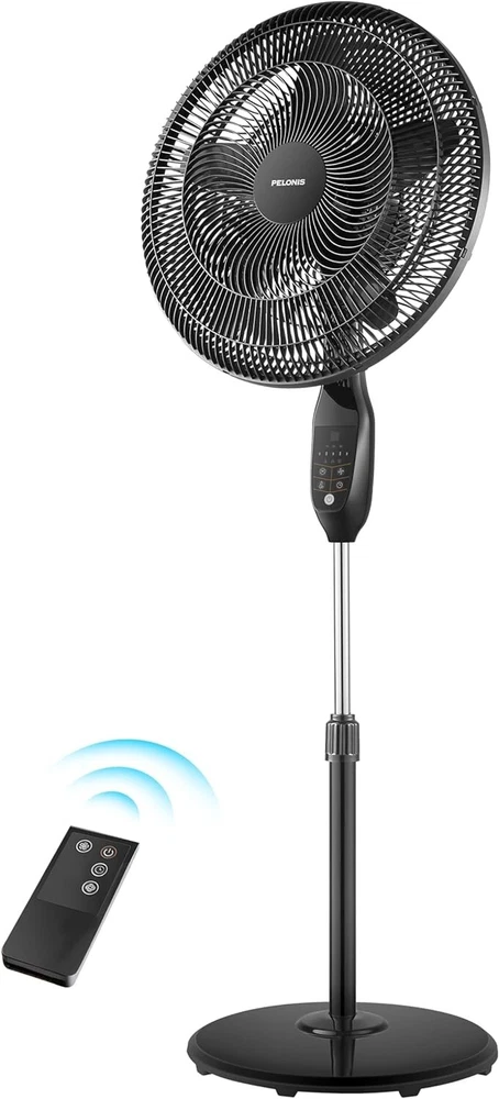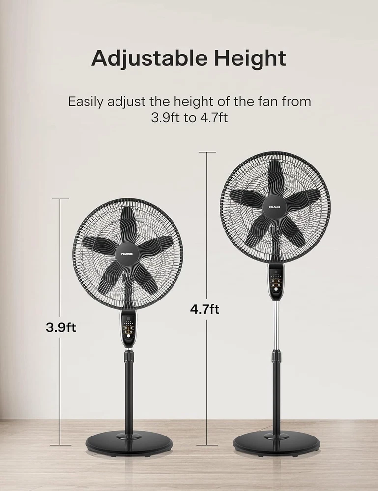 18 inch 5-Blade Oscillating, Adjustable Standing Pedestal Remote, LED Display, 5 Speed Setting and 7-Hour Timer Fan, Black INTELLIGENT AUTO-ECO TEMPERATURE CONTROL: Featuring an intelligent ECO temperature control sensor, which automatically increases or decreases the fan speed according to the room temperature for the most optimized setting and saves energy of speeds:5 CUSTOMIZABLE COOLING & REMOTE CONTROL: The LED display is easy to read and features 4 modes, 5 speed settings, and a 7-Hour Programmable Timer. Choose between Normal Mode, Nature Mode, ECO Mode and Sleep Mode to adjust the fan according to your needs and personal preference. Also, select between the 5 adjustable speed settings either on the control panel or by using the included remote control. WIDE OSCILLATION ANGLE & ADJUSTABLE HEIGHT: The 90° oscillation angle and 24° tilt angle will extend the wind coverage to every corner of the room. The height of the fan can be adjusted between to feet and the tilt-back head allows you to direct the airflow where you need it to provide comfort throughout your home or office. WIDE OSCILLATION ANGLE & ADJUSTABLE HEIGHT: The 90° oscillation angle and 24° tilt angle will extend the wind coverage to every corner of the room. The height of the fan can be adjusted between to feet and the tilt-back head allows you to direct the airflow where you need it to provide comfort throughout your home or office. MANUFACTURER satisfaction: With confidence in the quality of our products, offers a 1- manufacturer satisfaction with your purchase of any of our products. This Pedestal Fan is equipped with a powerful motor and high-quality 5 blades. It has an Intelligent Auto-Eco Temperature Control function and 7-hour timer with Auto Shut-off. Equipped with 4 modes, 5 speed settings, an easy to read LED display and remote contoller. The 85° oscillation angle and 24° tilt angle and the height of the fan can be adjusted between to feet for maximum convenience.