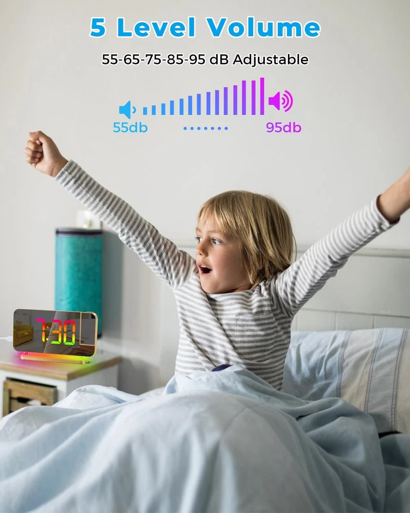 Product: projection Alarm Clock Brand: Colour: Gold Electronic alarm clock—Combines mirror, clock, alarm, night light,USB charging and other functions. It is not only a clock, but also a fashionable modern art decoration, very suitable for places such as bedroom, living room, office and so on. It is a necessity for your life and work, and the best gift for lovers, children, parents and friends. Feature: HD PROJECTION ALARM CLOCK — The projection alarm clock can be rotated 180, and the projection brightness can be adjusted in 4 levels. LED RGB COLORFUL CLOCK — The RGB alarm clock has 11 color display modes (4 dynamic modes + 7 fixed modes). Dynamic RGB Night Light — The Light alarm clock has 10 color night light modes (3 dynamic modes + 7 fixed modes). 7.4 INCH LED MIRROR DISPLAY — Not only an alarm clock, but also a makeup mirror. DUAL USB CHARGING PORTS — You can power your mobile phones, tablets, etc. at the same time, so you don't have to worry about charging nowhere. 6-LEVEL BRIGHTNESS SETTING — You can freely adjust the display brightness as needed, which saves energy and protects your eyes. 2 BRIGHTNESS CONTROL MODES — Built-in photosensitive element, can automatically adjust the screen display brightness according to the room light intensity. SHUTDO WN PROTECTION — Equipped with a button battery, you can save the time and alarm settings when the alarm is off. Custom mode selection: 12/24 HOUR SYSTEM — You can switch freely according to your own habits. SNOOZE MODE — After the first alarm, you will get 5 to 60 minutes of lazy bed time, and then remind you again. You will get: Projection Alarm clock x 1 Power adapter x 1 USB cable x 1 Button battery x 1 Instruction manual x 1 1 year warranty HD PROJECTION ALARM CLOCK -- The projector of the Alarm Clock can be rotated 180°, one-key flip time display, 4-level brightness is adjustable, 1.64-11.4 feet (0.5-3m) effective projection distance, can clearly project the time on the wall Or the best position on the ceiling for you to easily watch the time. 11-COLOR RGB DIGITAL DISPLAY -- The Digital Clock adopts a color-changing LED display, with 4 dynamic RGB colors + 7 fixed color modes, 6 level brightness adjustable + auto dimming,bringing you a different visual experience. 10-COLOR MODES NIGHT LIGHT --The Digital Alarm Clock has a built-in LED light, with 3 dynamic RGB colors + 7 fixed color modes, one key to switch the light color, 5 levels of brightness adjustable, and can also be used as an atmosphere light. USB-C CHARGING PORT -- The Digital Desk Clock is equipped with one USB Type C + one USB A output port, which can charge 2 electronic devices at the same time, meeting most of your charging needs. 7.4-INCH MIRROR DISPLAY — The LED Alarm Clock is equipped with a 7.4-inch HD display and large digital fonts, you can clearly watch the time within 30 feet; the unique acrylic mirror design can also be used as a makeup mirror. 5 LEVELS VOLUME ADJUSTABLE--The Loud Alarm Clock has a variety of volume options from 55-65-75-85-95db, you can choose the appropriate volume according to your sleep depth, which is very suitable for heavy sleepers. SNOOZE +12/24H MODE--The LED RGB Clock is designed with a snooze button on the top, which can be turned off at will, allowing you to easily get 5-60 minutes of lazy bed time; 12 and 24 hours are available in two time display modes. WHAT YOU GET -- 1 x Projection Alarm Clock + 1 x Power Adapter + 1 x USB C Charging Cable + 1 x Product Manual . (If you are not satisfied with any of our products, please contact us by email and we will provide a solution within 24 hours.)