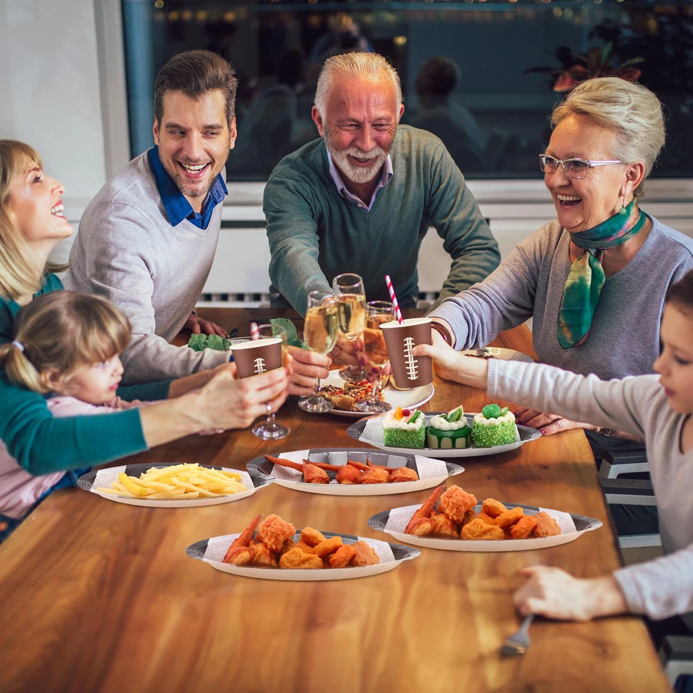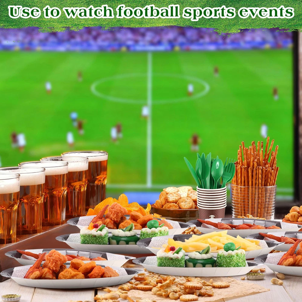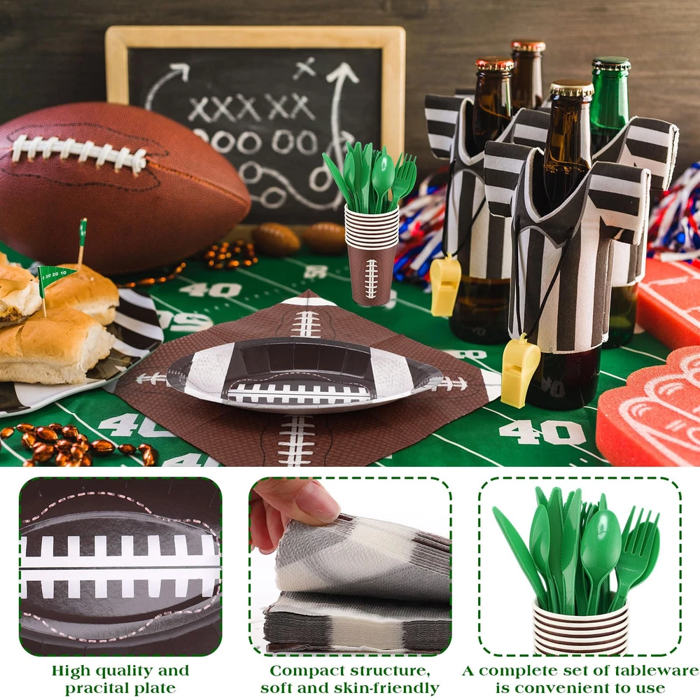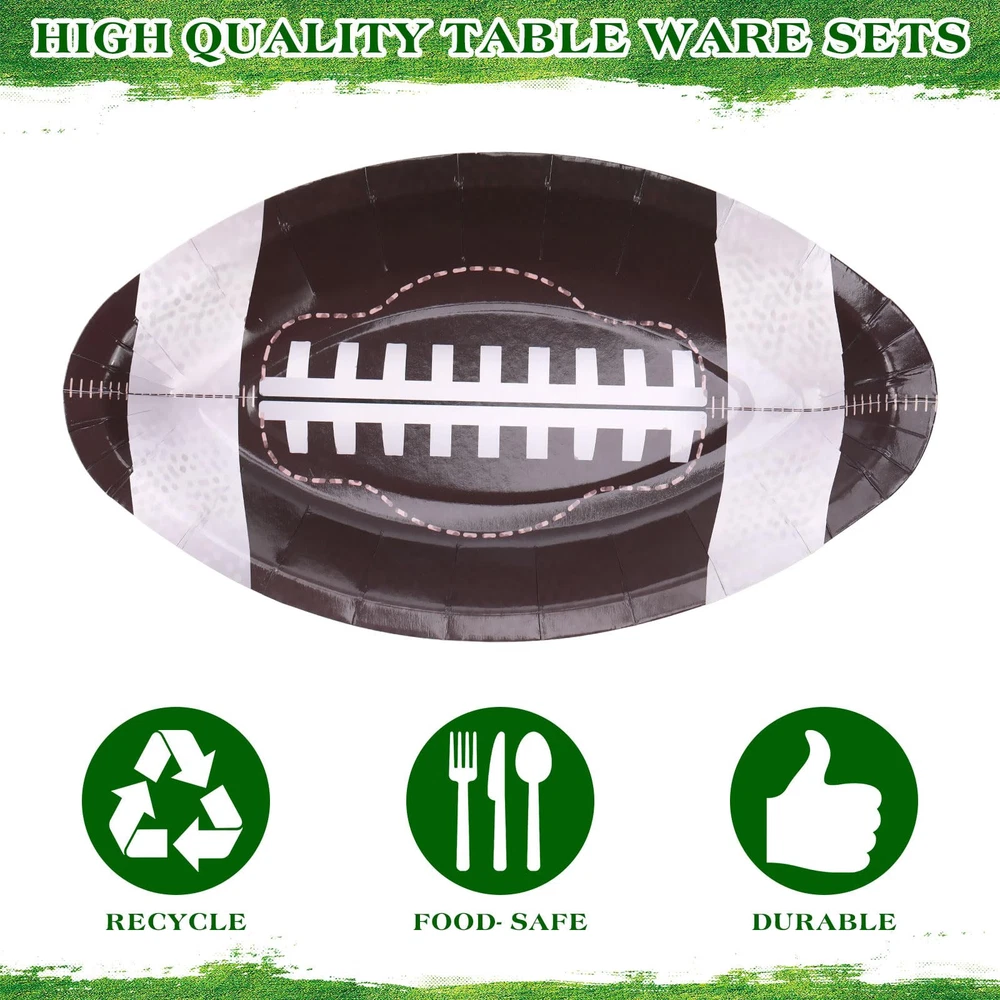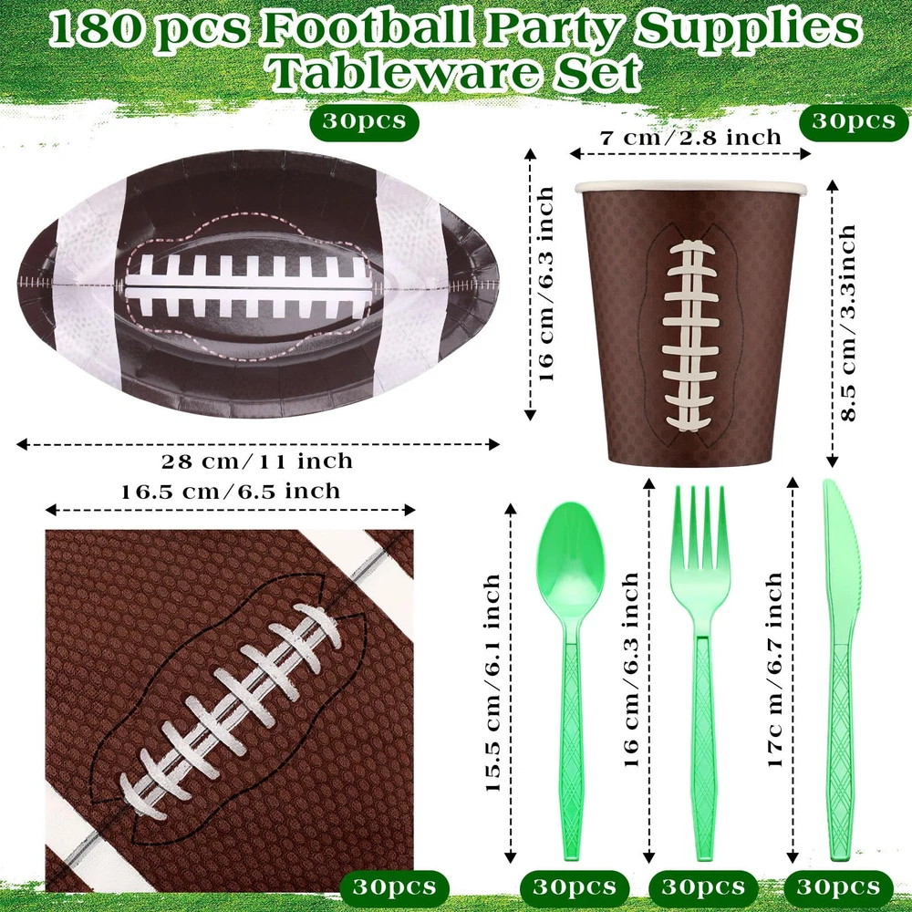 Features: Practical gifts: These football paper plates and napkins set also make a thoughtful gift for your partner who is a football lover or who has kids that play football. They will appreciate your thoughtful present on their game day or football themed party. Functional and decorative: Our football party favors not only serve a functional purpose, but also add a decorative touch to your table. With their football shaped design and vibrant colors, they can create a festive atmosphere, leaving a deep impression on the guests. Specifications: Material: paper and plastic Color: as the picture shown Size: Plate: approx. 11.02 x 6.3 x 0.98 inches/ 28 x 16 x 2.5 cm Package includes: 30 x Football paper plates 30 x Football paper cups 30 x Football napkins 30 x Plastic knives 30 x Plastic forks 30 x Plastic spoons Notes: Manual measurement, please allow slight errors on size. The color may exist a slight difference due to different screen displays. Pointed items are included, adult supervision is needed when it is played by your little ones. Football Party Supplies Kit: our set includes 180 supplies needed for your football themed event, including 30 football paper plates (11.02 x 6.3 x 0.98 inches), 30 football paper cups, 30 football napkins, as well as 30 plastic knives, forks, and spoons; The set can serve 30 guests, ideal for large gatherings celebrating football games or themed parties Reliable and Sturdy: our football plates are made of thicken paper material, safe and reliable, not easy to break or leak; Paper napkins are soft and water absorbent, paper cups are sturdy and reliable; And the disposable forks, knives, spoons are made of reliable plastic, smooth and waterproof, providing a nice heat resistance and flexibility; All you can use with confidence Football Themed Design: the football themed party supplies can easily attract the attention of your guests, the football shaped plates are realistic and fun, and cups and napkins are printed with green and brown football patterns, adding a lively and delighting touch to your football themed parties More Time to Enjoy: using our football plates and napkins party supplies means less time doing dishes and more time enjoying the party; Once the party is over, simply dispose of these supplies, allowing you to have more fun and create memorable moments Wide Range of Applications: the football plates and napkins set is ideal for a wide variety of occasions such as tailgating, viewing parties, football themed events, sports themed parties, birthdays, anniversaries, bachelorette parties, casual gatherings, matching well with other decorations and leaving your guests a deep impression