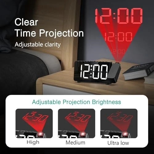 Projection Alarm Clock with Ultra-Clear Display Ultra-clear Projection: Easily adjust the focus by rotating, and project the time onto the ceiling or wall within a range of 1.6 feet to 16 feet. Choose from 3 brightness levels for the projected time, offering flexibility depending on your environment. 5-Level Screen Brightness & Night Mode: Featuring a large 7.4-inch LED screen, the brightness can be adjusted in 5 levels (high, medium, low, ultra-low, off) to match your lighting preferences. Activate night mode to automatically dim the display to the lowest setting between 7 PM and 7 AM, ensuring it doesn’t disturb your sleep. 3-Level Volume Control & Easy Snooze: This bedside alarm clock offers 3 volume settings so you can choose the right level based on your sleeping habits. The snooze function allows for an extra 9 minutes of sleep, with the alarm ringing for 2 minutes to ensure you don’t miss important events. Practical & Simple Design: Supports DST function and 12/24 hour format switching. The user-friendly design ensures each button corresponds to only one function, making it simple to operate—even for elderly users. Plug-in Operation: Comes with a 1.5-meter Type-C cable (adapter not included). This bedroom alarm clock must be plugged in to use. The included button battery is only used for memory backup, so you don't have to reset the time after an unexpected power outage.